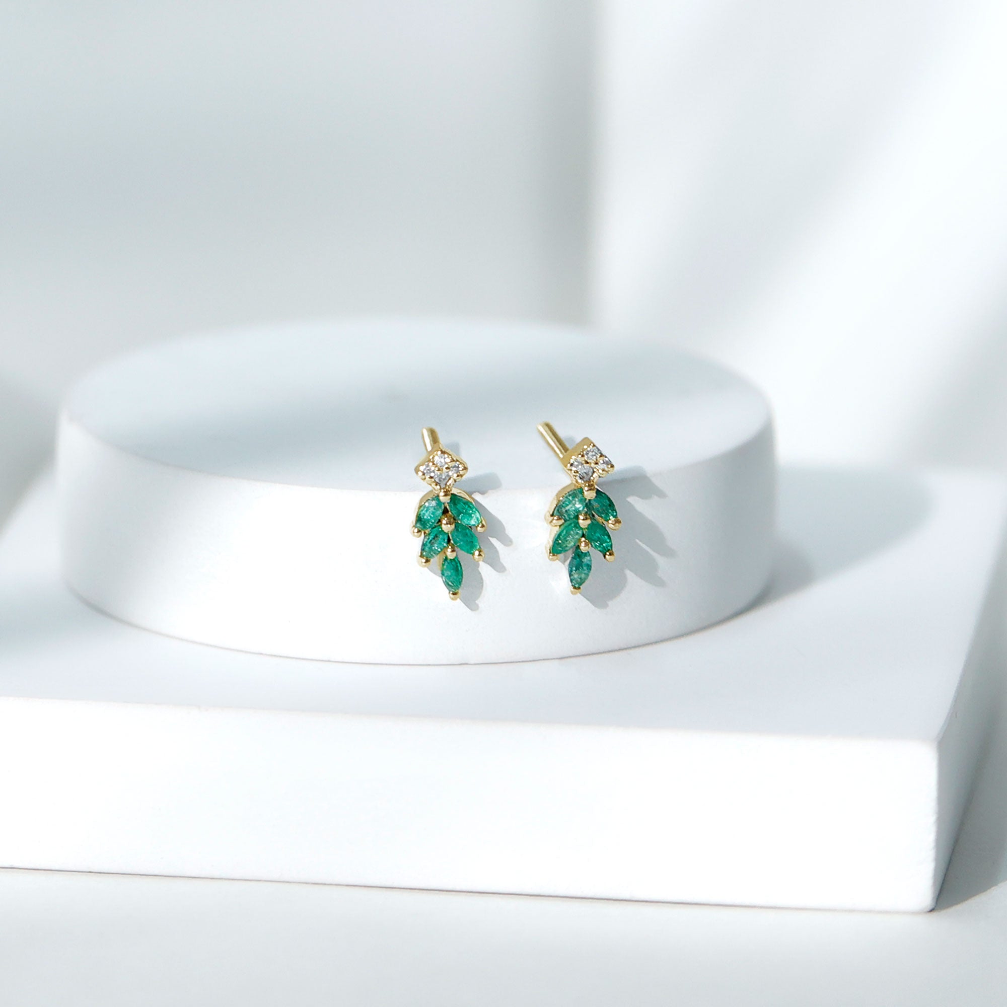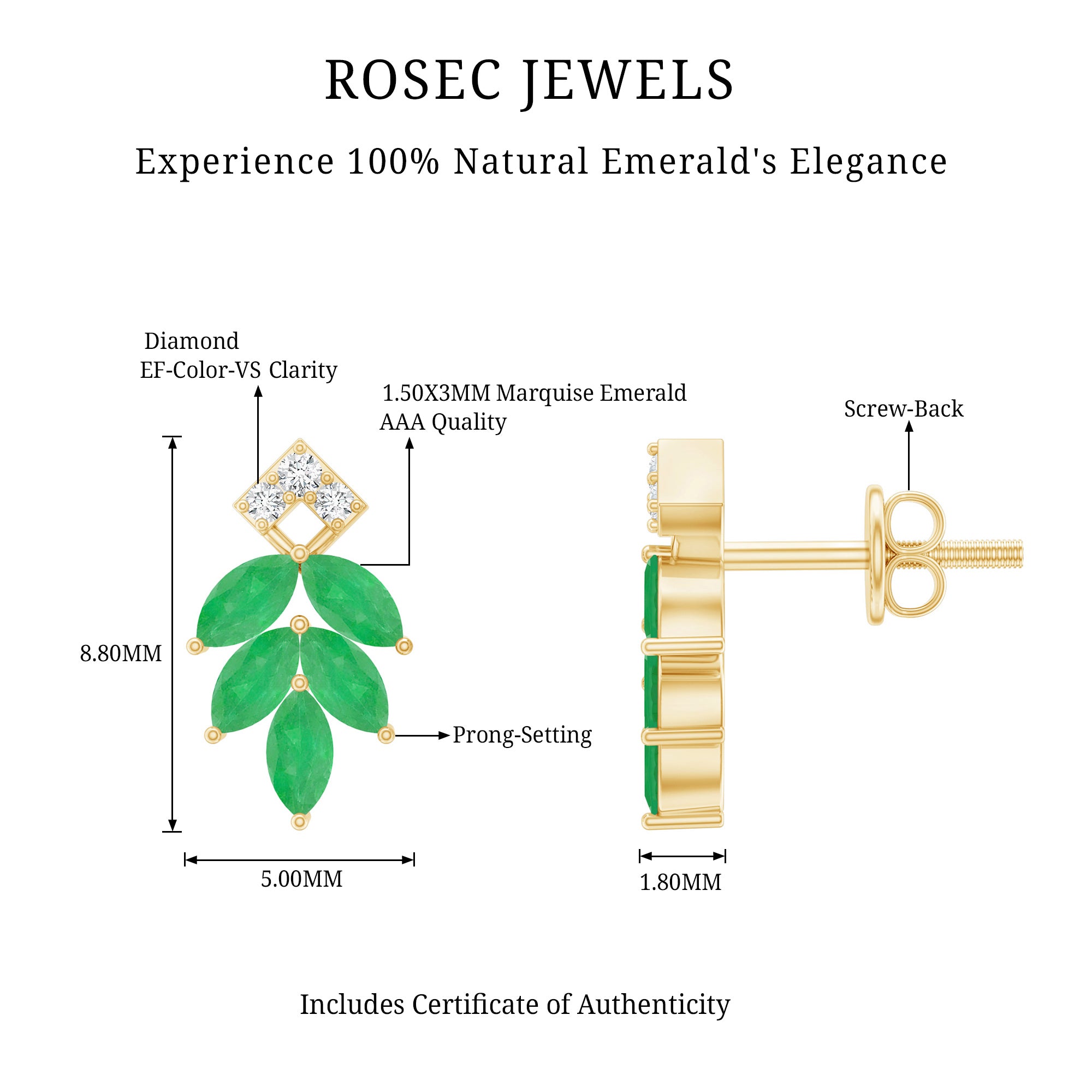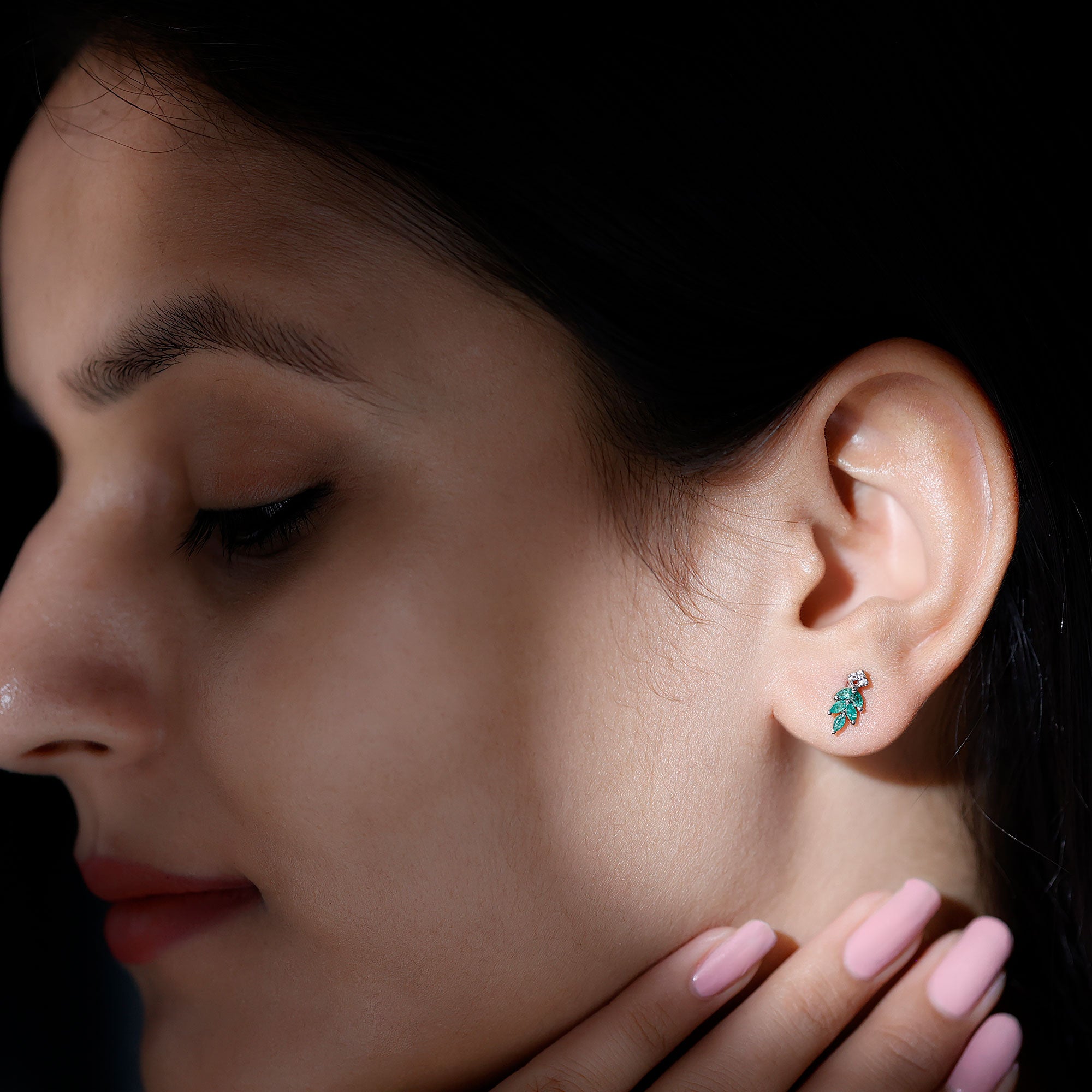 Grab attention on any special occasion by wearing these Leaf Stud Earrings and make everyone a fan of your unique style. The vibrant green hue of Marquise Shape Emerald gemstones set in Prong Setting is complemented by gleaming Moissanite gemstones. Secured with Screw Back Closure, these Fine Earrings will bring you into the spotlight.