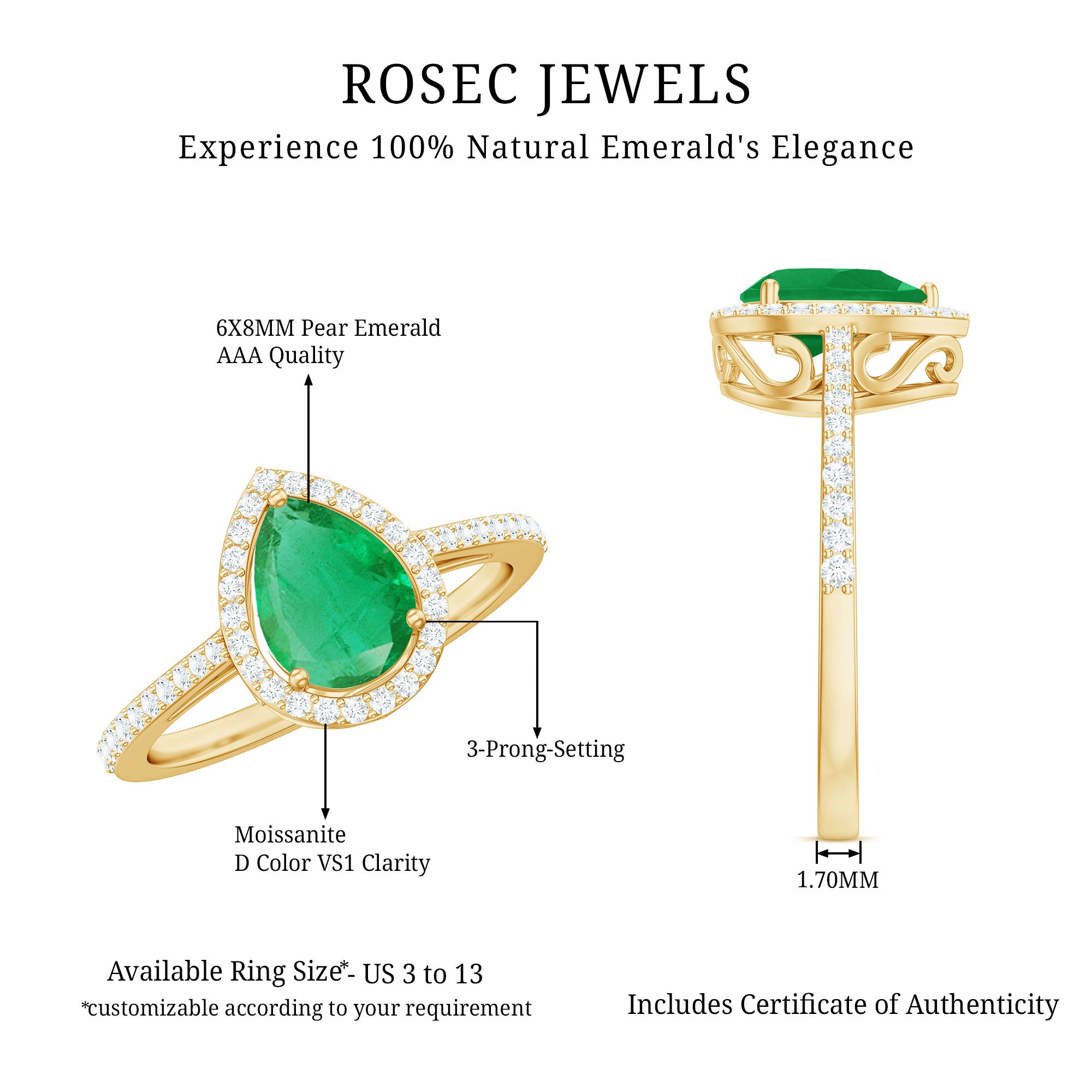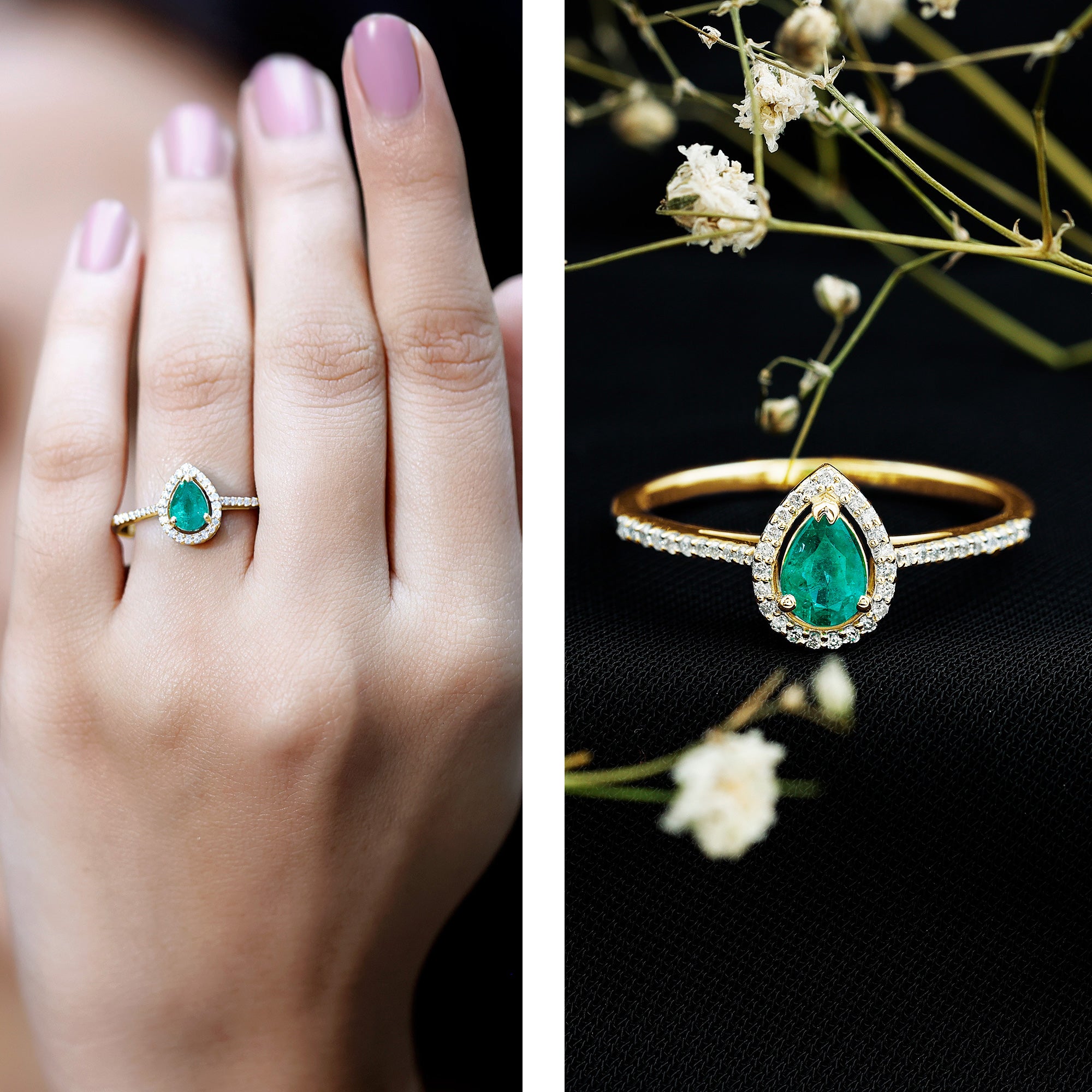 Make a striking statement with this beautiful Emerald Engagement Ring, perfect for those who love elegance and style. At the heart of the Teardrop Engagement Ring lies a breathtaking 5X7 MM pear shaped emerald, securely set in 3-prong setting. Surrounding the emerald is a brilliant moissanite halo that enhances its sparkle and draws attention to the vibrant center stone. The centerpiece is further complemented by a row of round cut moissanite side stones, carefully arranged to highlight the deep green color of the emerald and create a stunning contrast. The combination of AAA quality natural emerald and D-VS1 quality moissanites gives the Pear Shaped Halo Engagement Ring a contemporary yet classic appeal, setting it apart from traditional styles. This Emerald and Moissanite Ring is designed to celebrate love and comes in a luxurious jewelry box, making it ready to delight someone special or commemorate your own unforgettable moment. Available in various sizes for the perfect fit, its elegant design makes it ideal for proposals, engagements, or as a thoughtful gift, symbolizing a significant commitment and cherished moments.