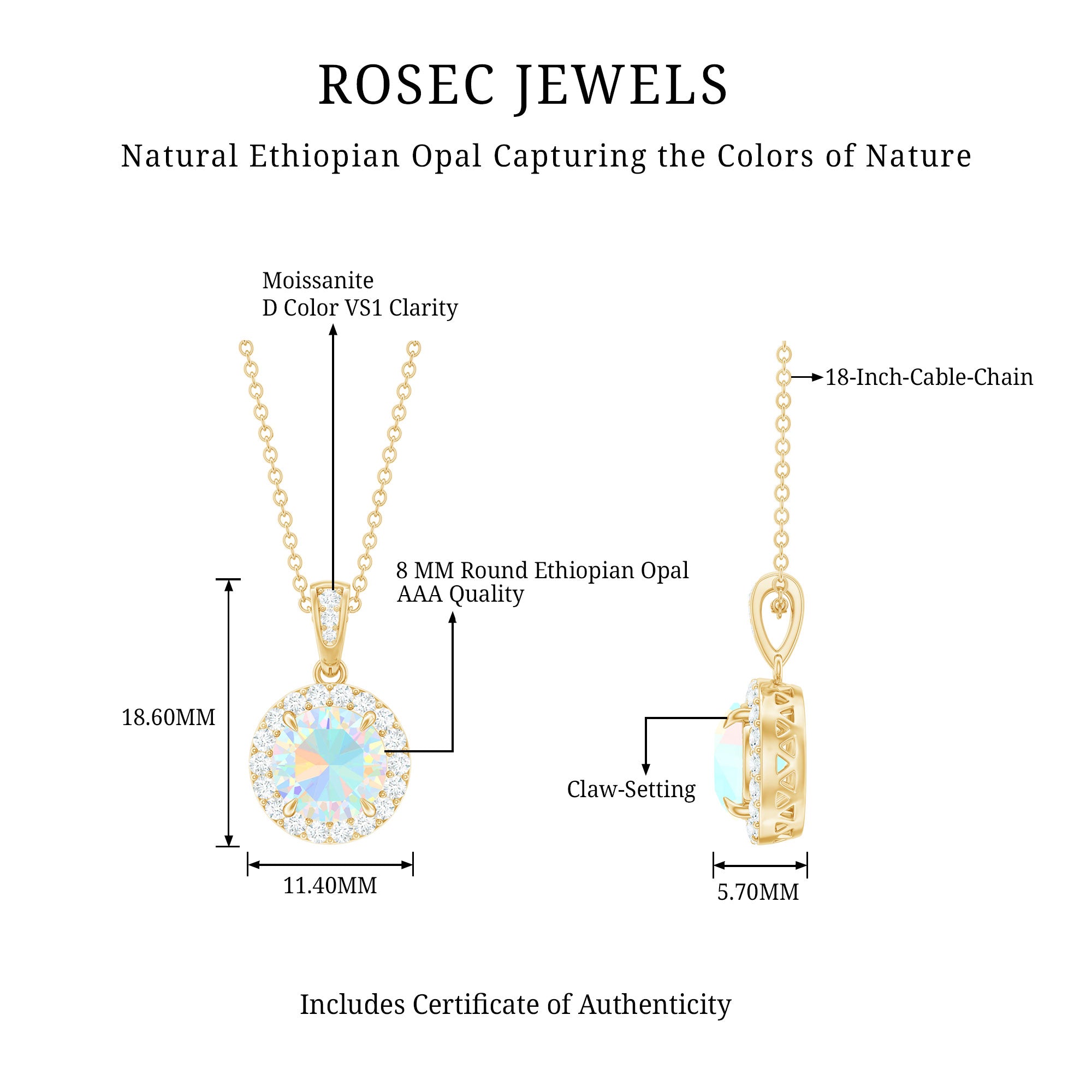 Add a touch of timeless charm to your look with this exquisite Halo Pendant Necklace. It showcases an 8 MM Round Shape Ethiopian Opal, securely nestled within Claw Setting and encircled by a dazzling Halo of Round Shape Moissanite stones. The bail is gracefully adorned with additional round Moissanite, further enhancing its allure. Whether you are going for a casual or a more formal look, this Ethiopian Opal Pendant complements your attire, ensuring you will be a standout presence in any gathering. The simple design allows the opal to take center stage, symbolizing creativity, love, and hope. Perfect for gifting or keeping as a personal treasure, this Opal and Moissanite Necklace brings a hint of luxury and meaning to your jewelry collection. The pendant’s craftsmanship and quality make it a piece to treasure for years to come. Packed in a beautiful jewelry box and complete with a certificate of authenticity, this October Birthstone Necklace is ready for gifting. It is a lovely way to celebrate birthdays, anniversaries, or other milestones.