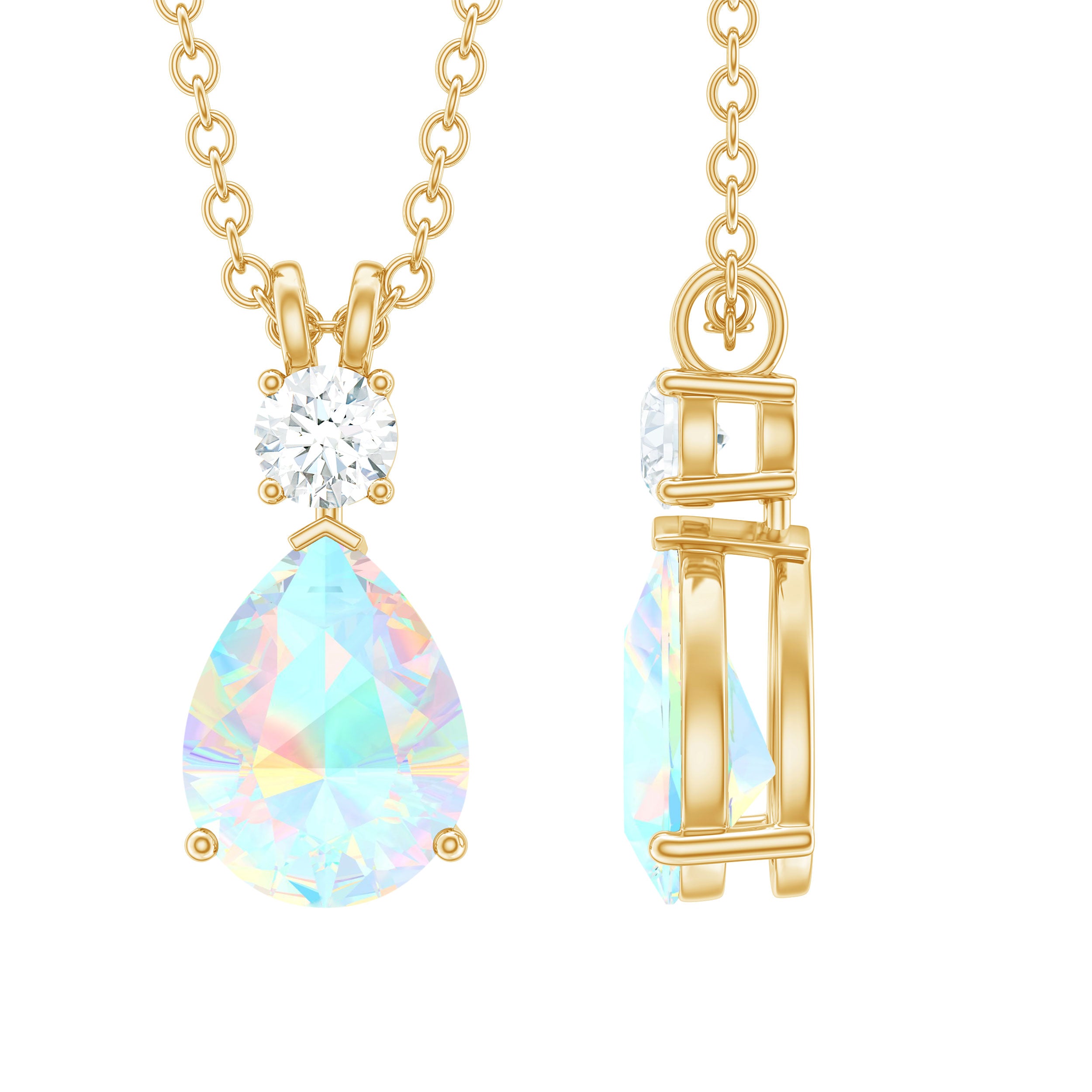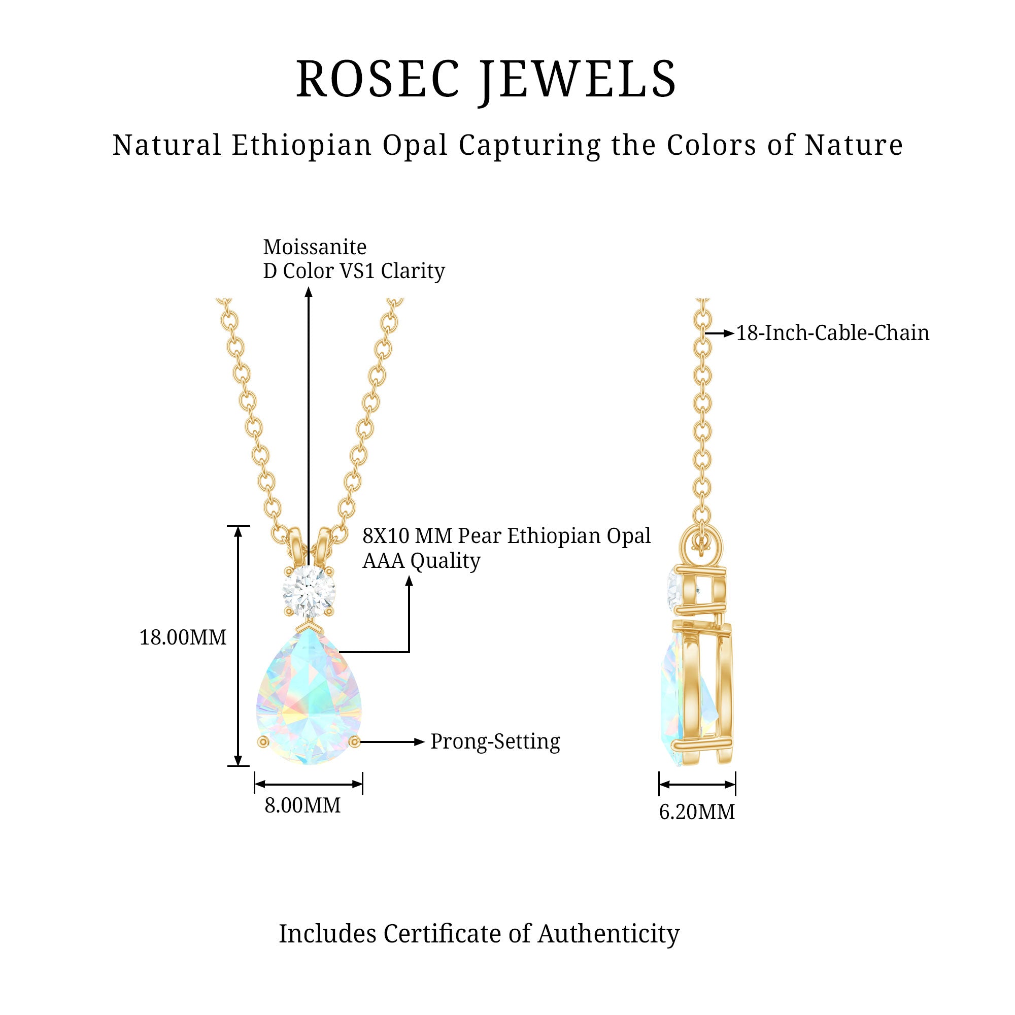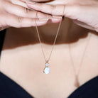 This elegant Ethiopian Opal Necklace brings a soft glow and natural beauty to any look. Curated with an 8X10 MM pear shaped ethiopian opal, carefully set in prong setting. Above the opal, a round cut moissanite adds a touch of sparkle, creating a perfect balance of shine and color. The Teardrop Pendant hangs gracefully from a chain, resting beautifully on the neckline and catching the light with every movement. The opal’s unique play of colors gives it a magical and eye-catching look. The smooth finish and graceful shape make this Opal and Moissanite Necklace comfortable and easy to style with any outfit. Whether worn with casual clothes or formal attire, it adds a soft and elegant glow that enhances your natural charm. The simple design allows the opal to take center stage, symbolizing creativity, love, and hope. Perfect for gifting or keeping as a personal treasure, this Pear Drop Necklace brings a hint of luxury and meaning to your jewelry collection.