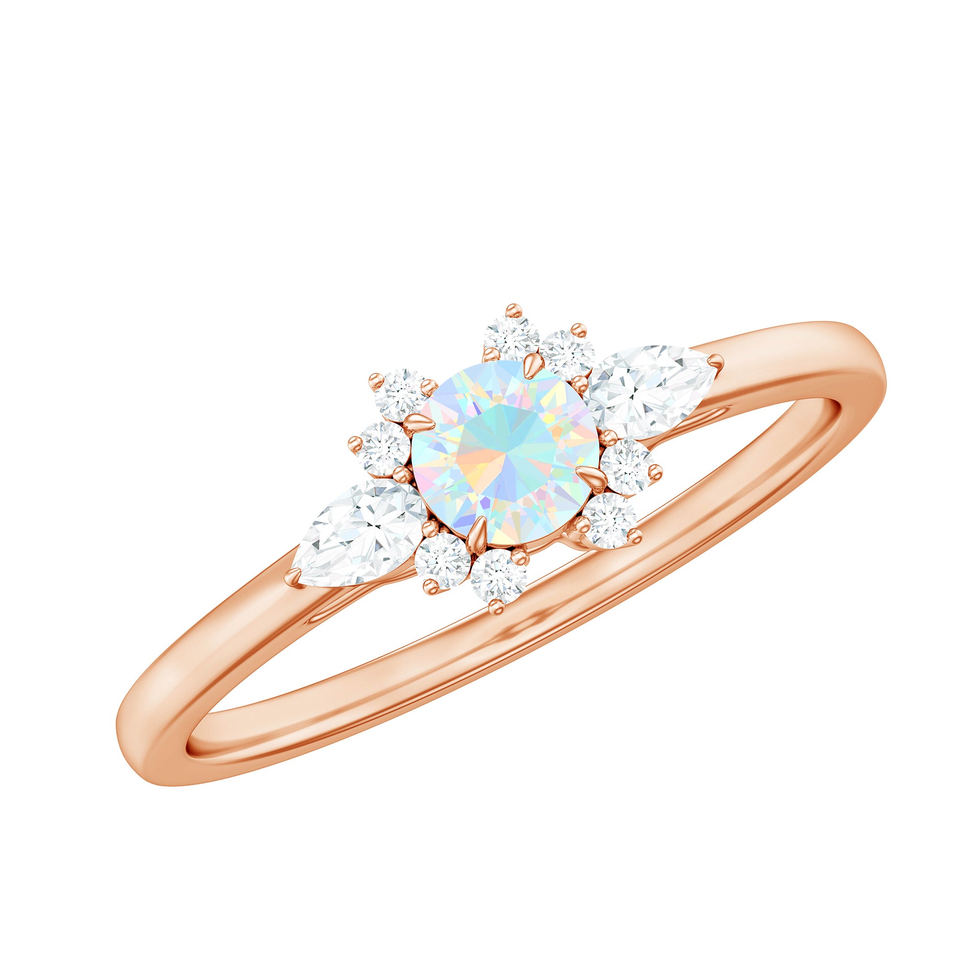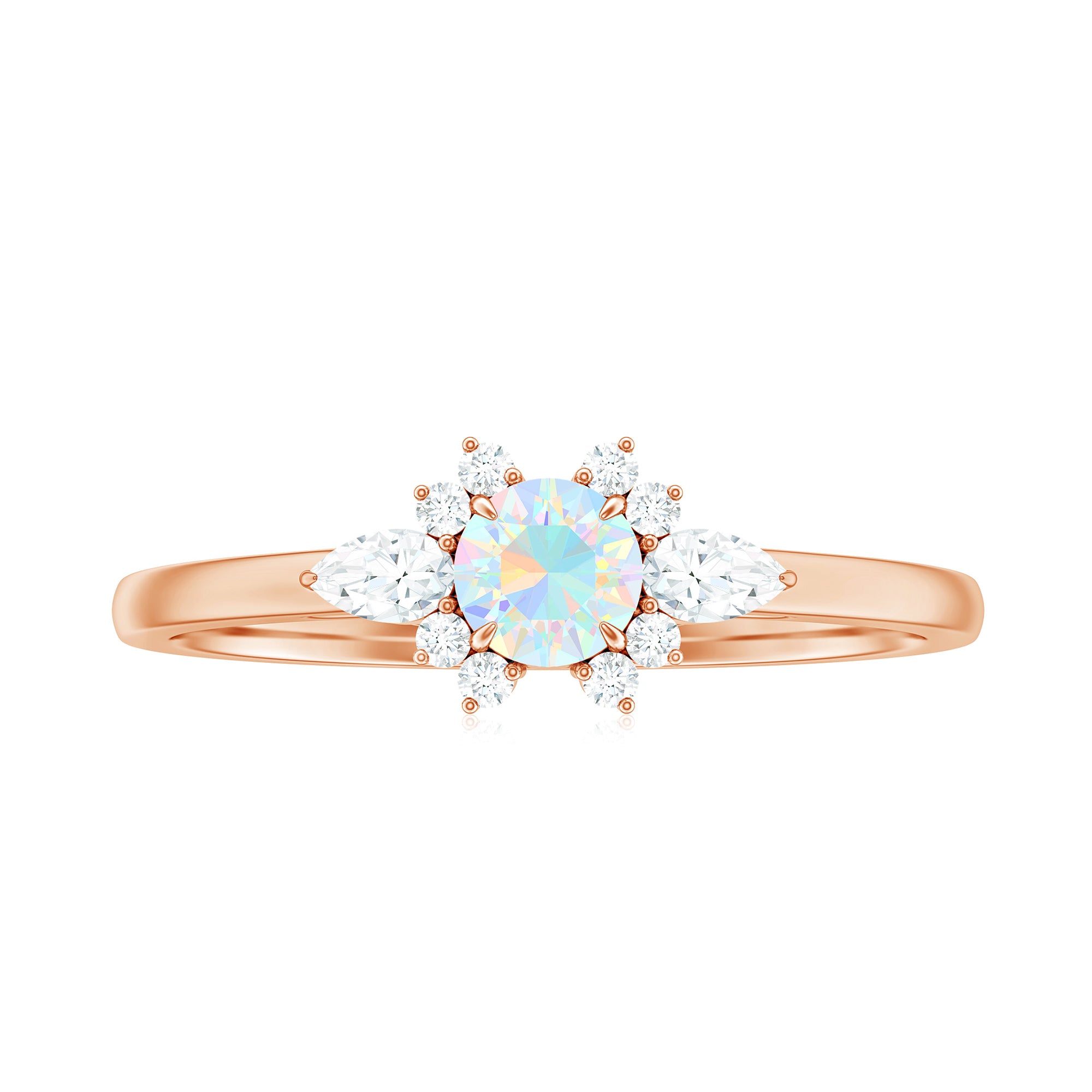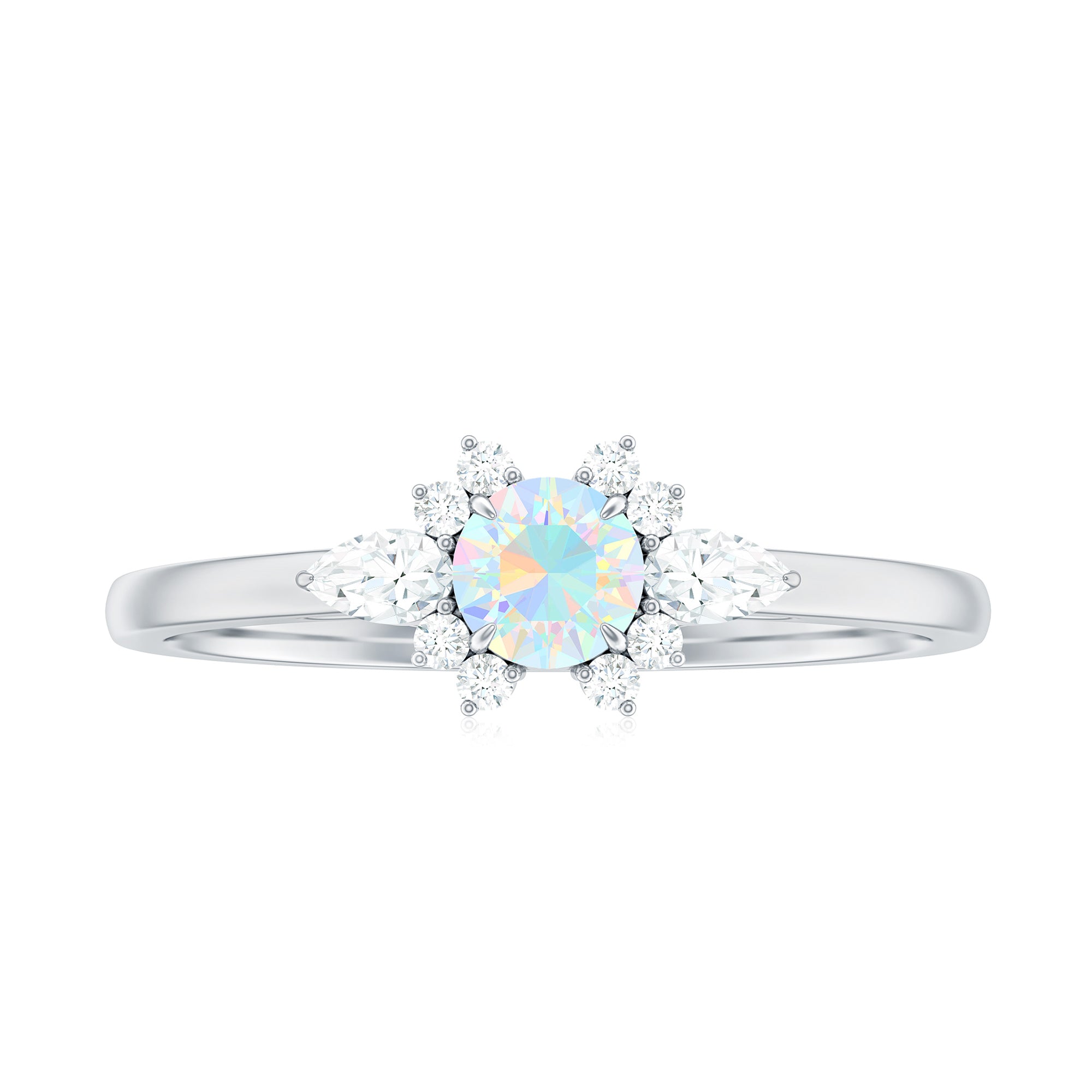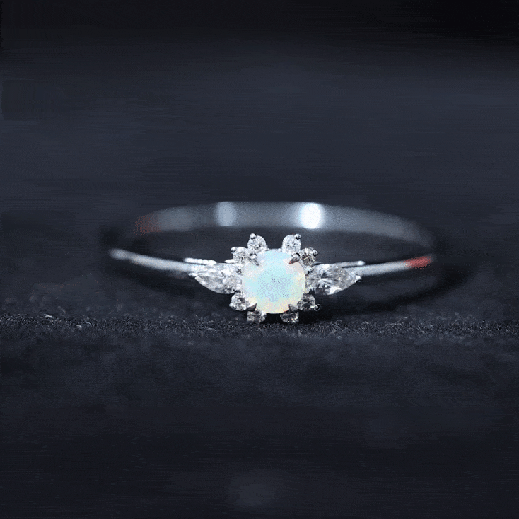 The design highlights the natural beauty of the opal while incorporating diamond accents for added brightness and contrast. The setting is structured to frame the center stone securely while maintaining a refined and balanced appearance suitable for everyday promise wear. The overall silhouette blends delicacy with presence, allowing the opal’s play-of-color to remain the focal point.