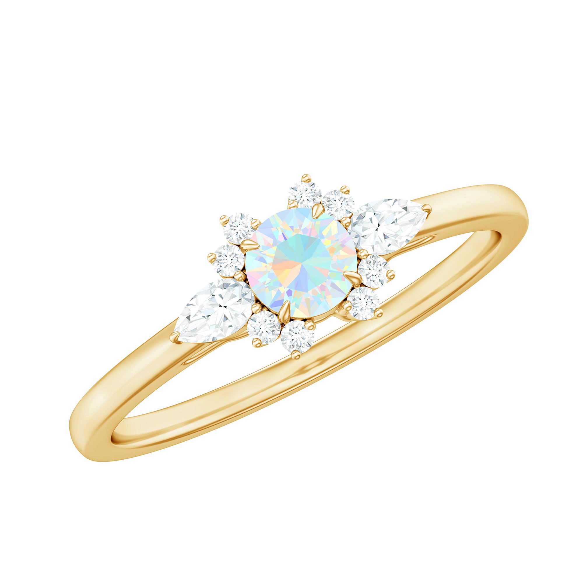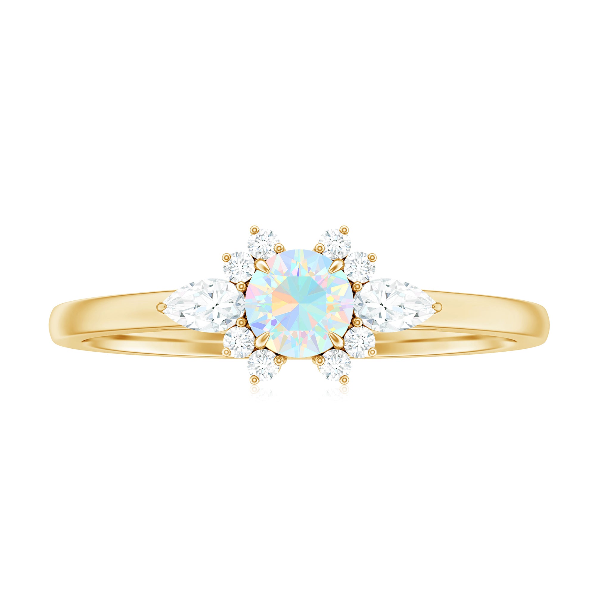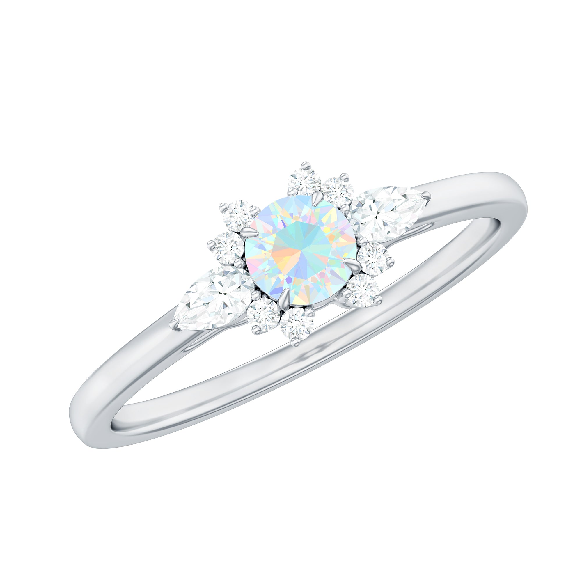 The design highlights the natural beauty of the opal while incorporating diamond accents for added brightness and contrast. The setting is structured to frame the center stone securely while maintaining a refined and balanced appearance suitable for everyday promise wear. The overall silhouette blends delicacy with presence, allowing the opal’s play-of-color to remain the focal point.