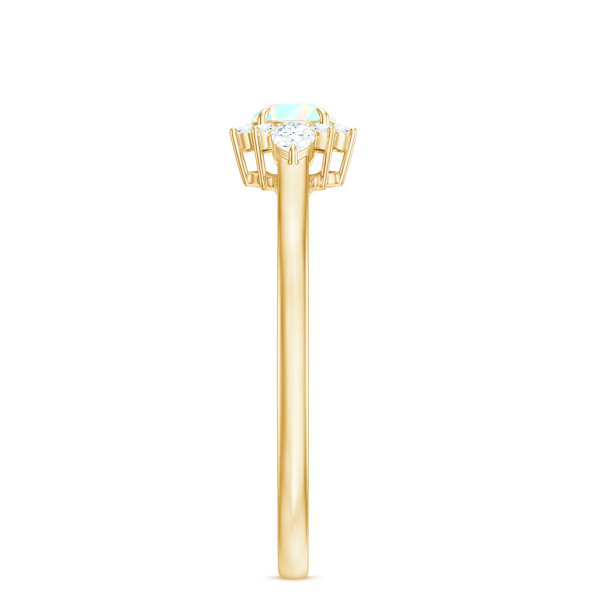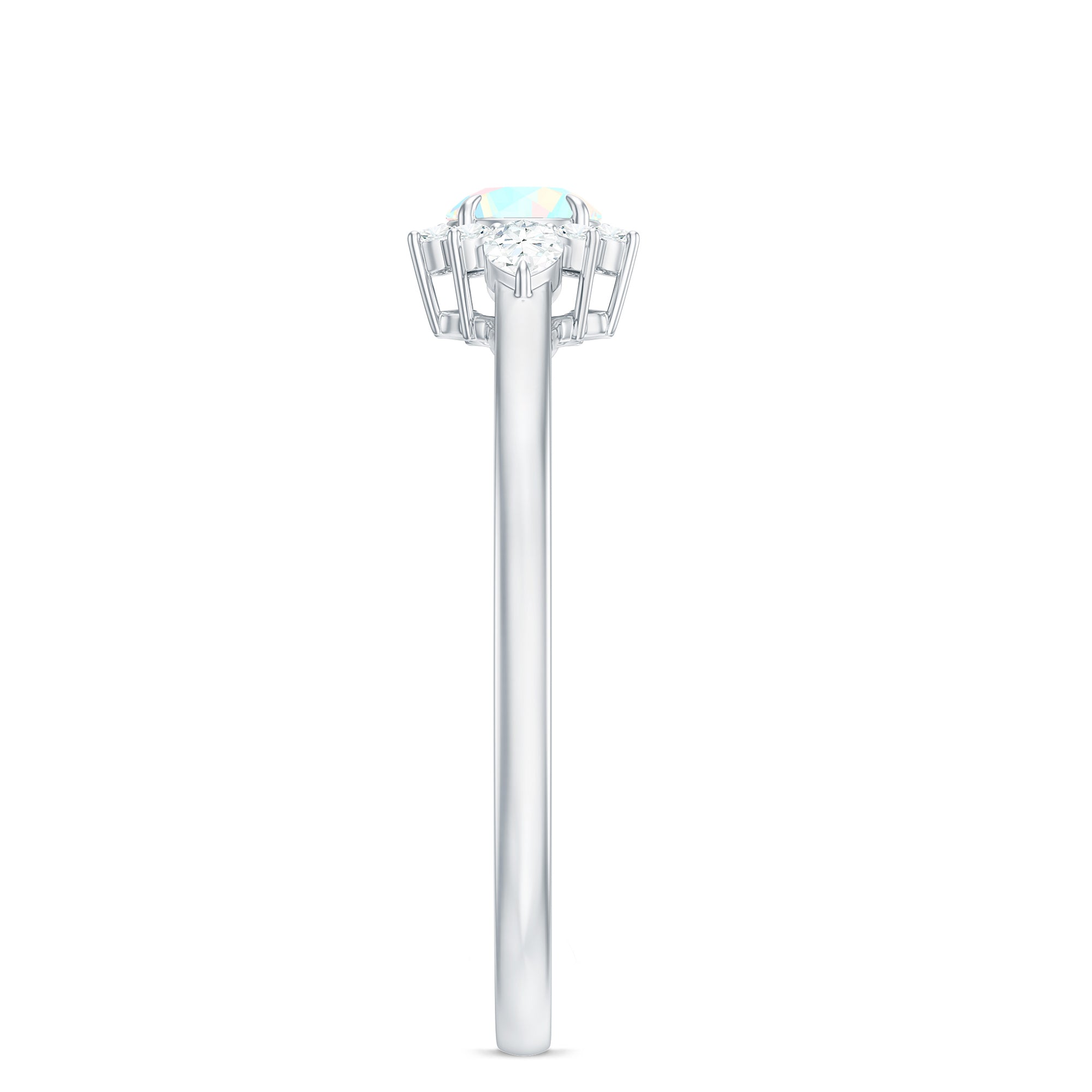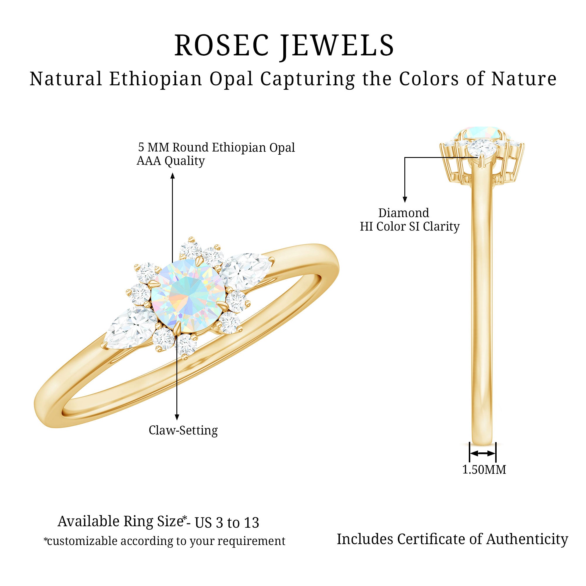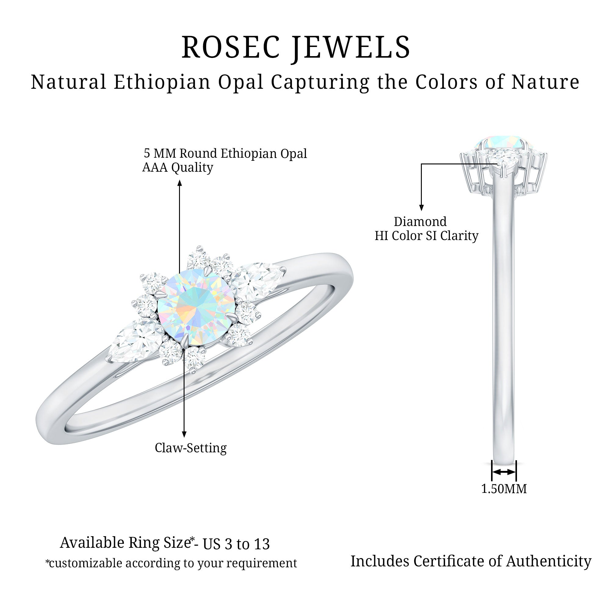 The Real Ethiopian Rainbow Opal Diamond Promise Ring with Certificate is designed for those who value individuality and symbolism. At its center is a genuine Ethiopian rainbow opal, admired for its shifting flashes of color that change with light and movement, making each ring visually unique.