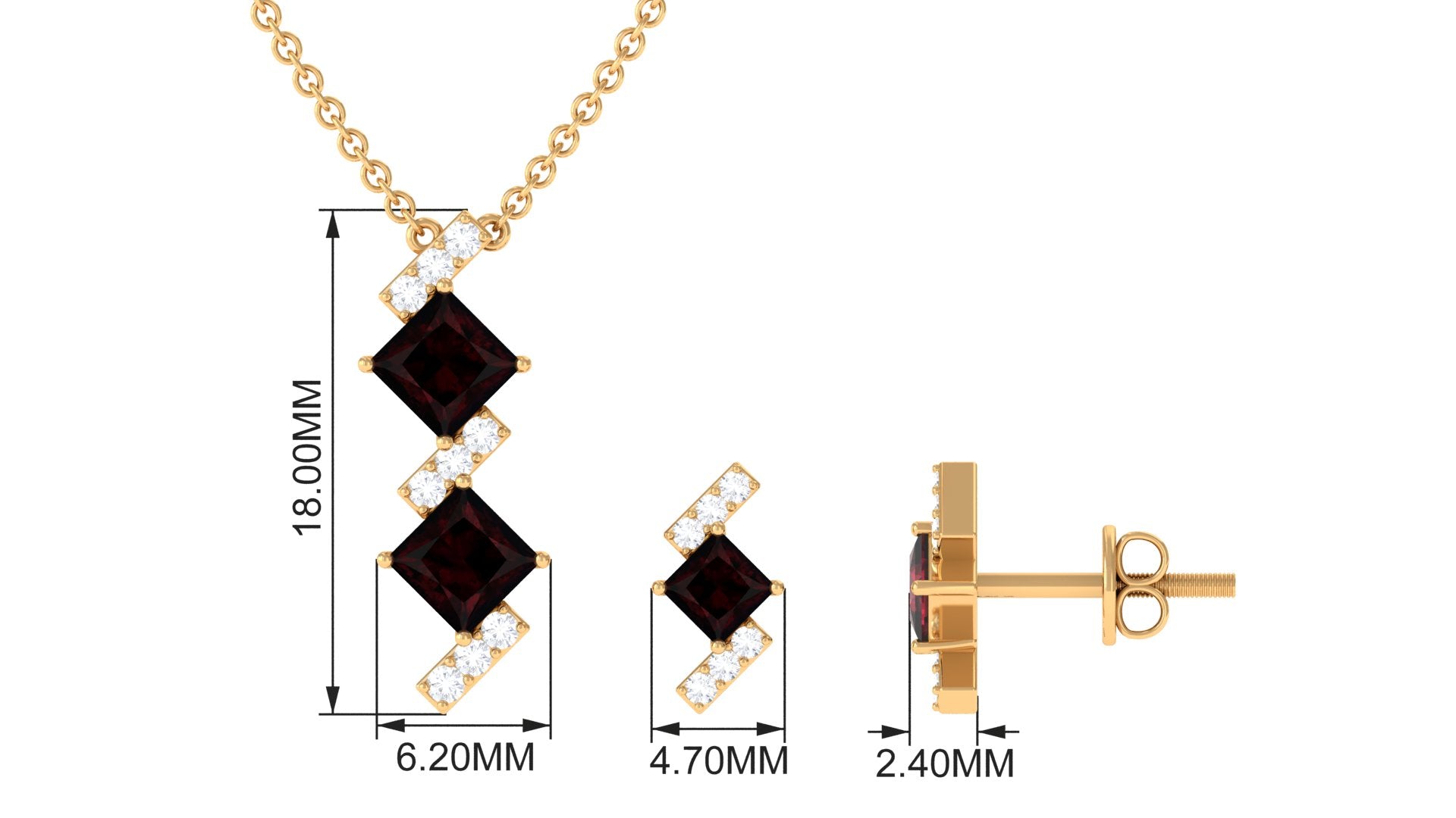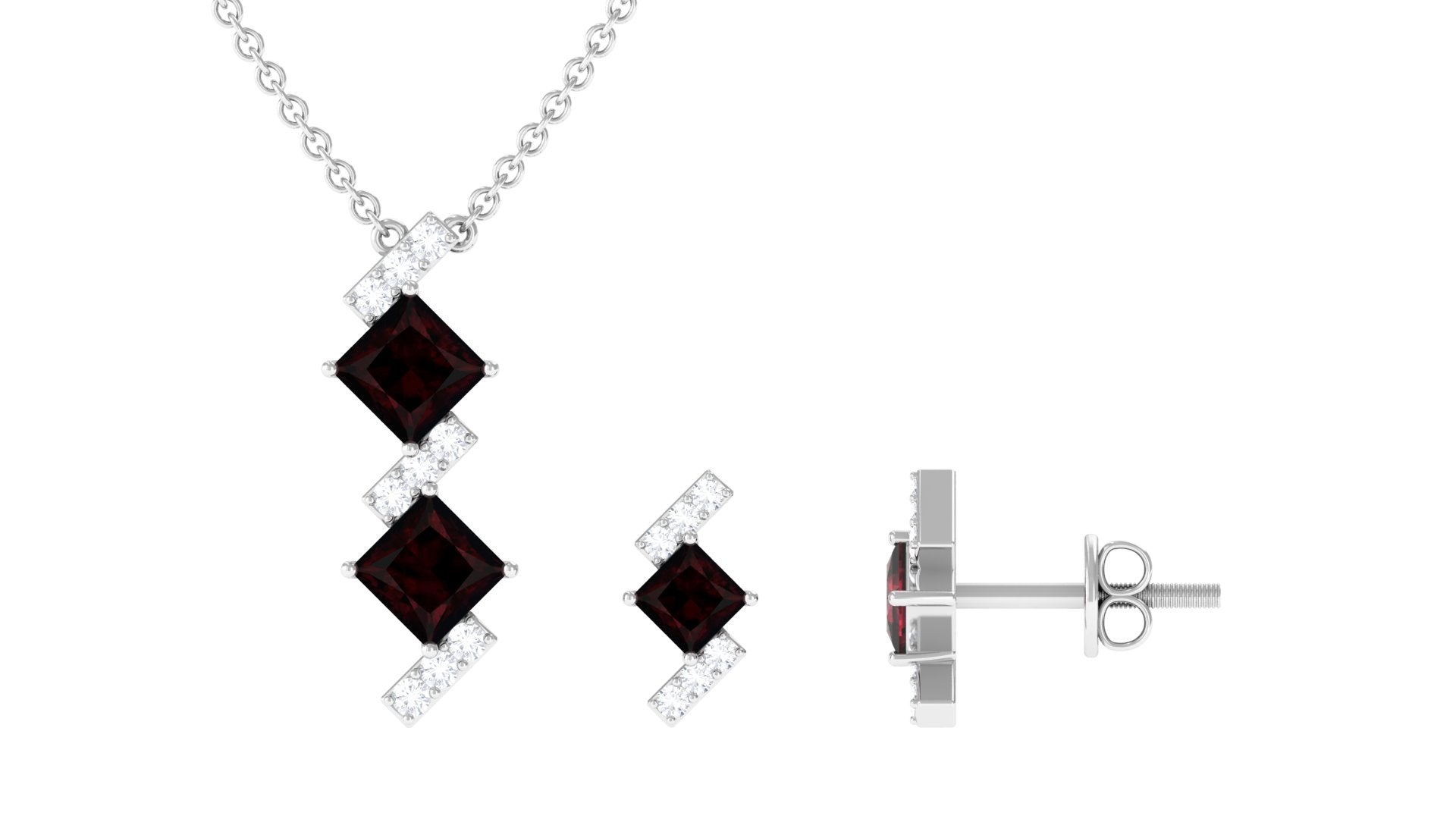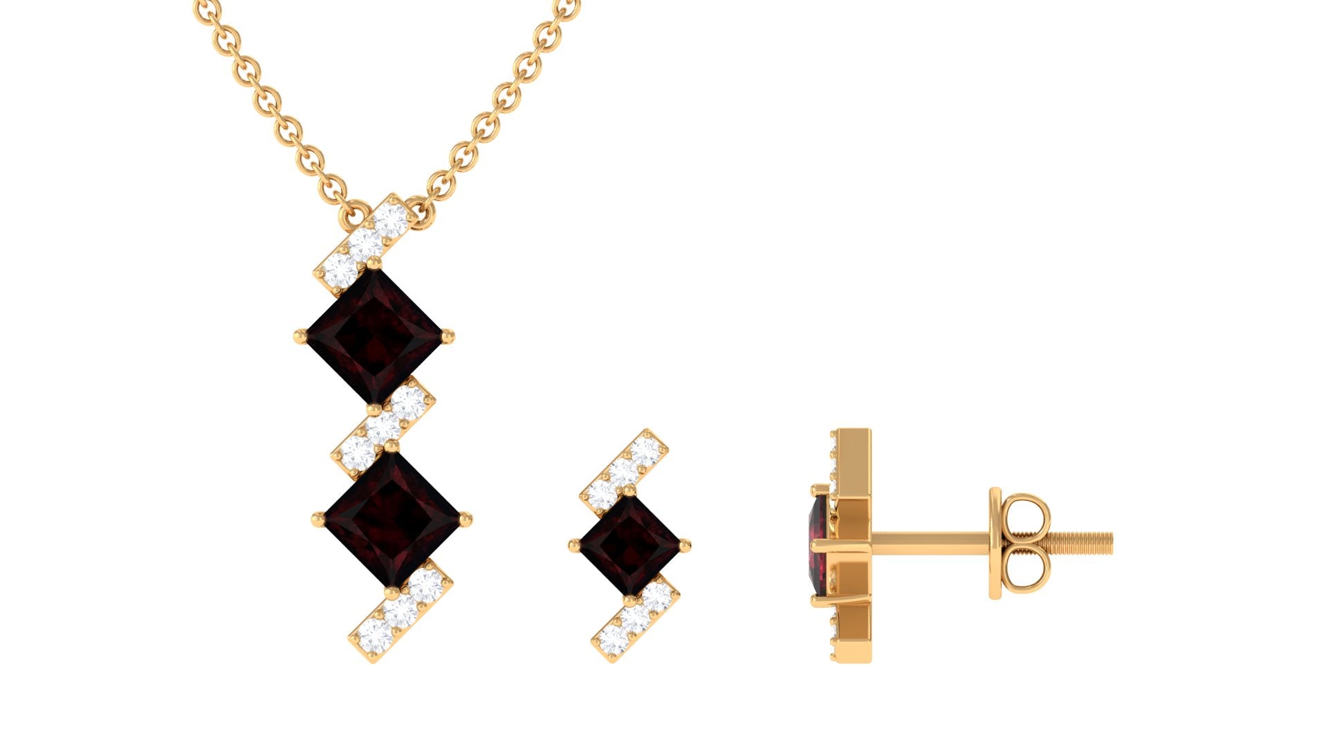 Add a splash of color to your outfit with this Garnet Jewelry Set. The Princess Cut Garnet in Prong Setting with Diamond on the bars on Jewelry Set is one-of-a-kind and trendy timeless jewelry. The matching Earrings have a screw back closure that is sure to be your now everyday staple partner.