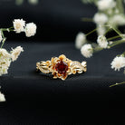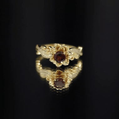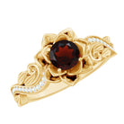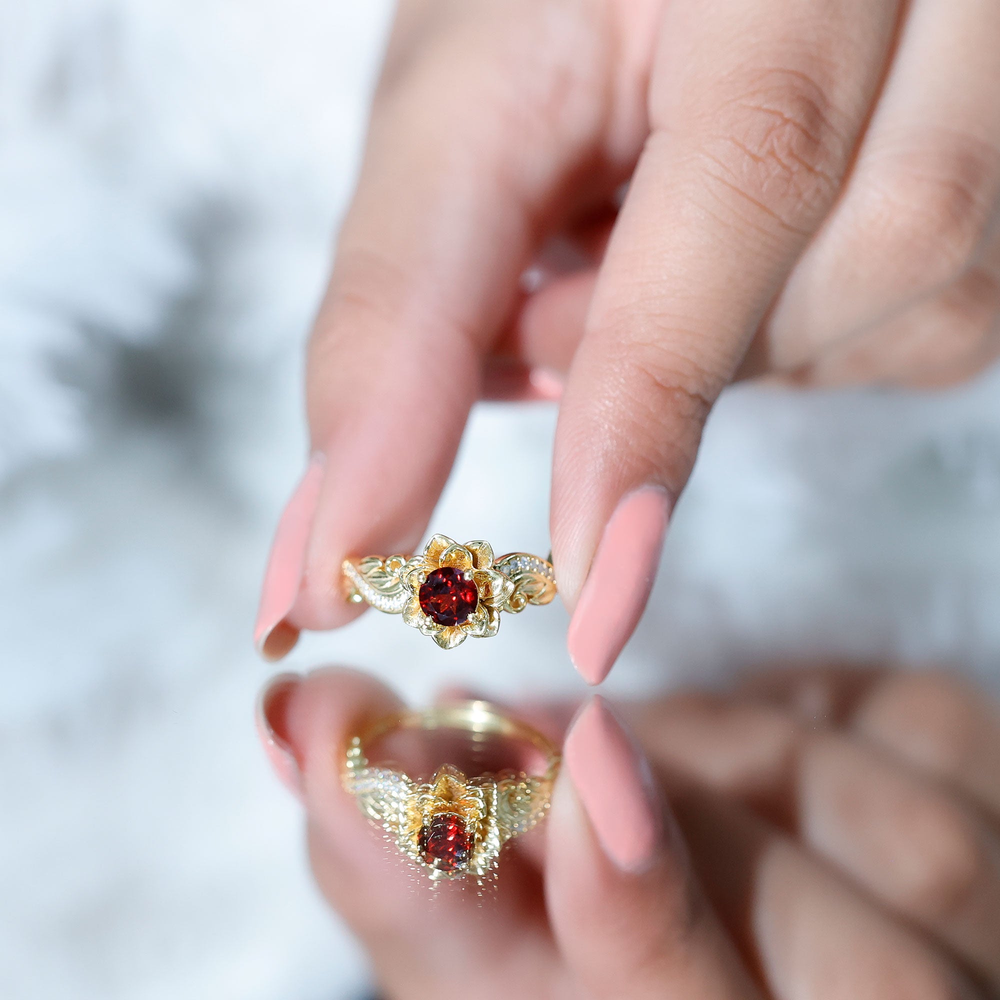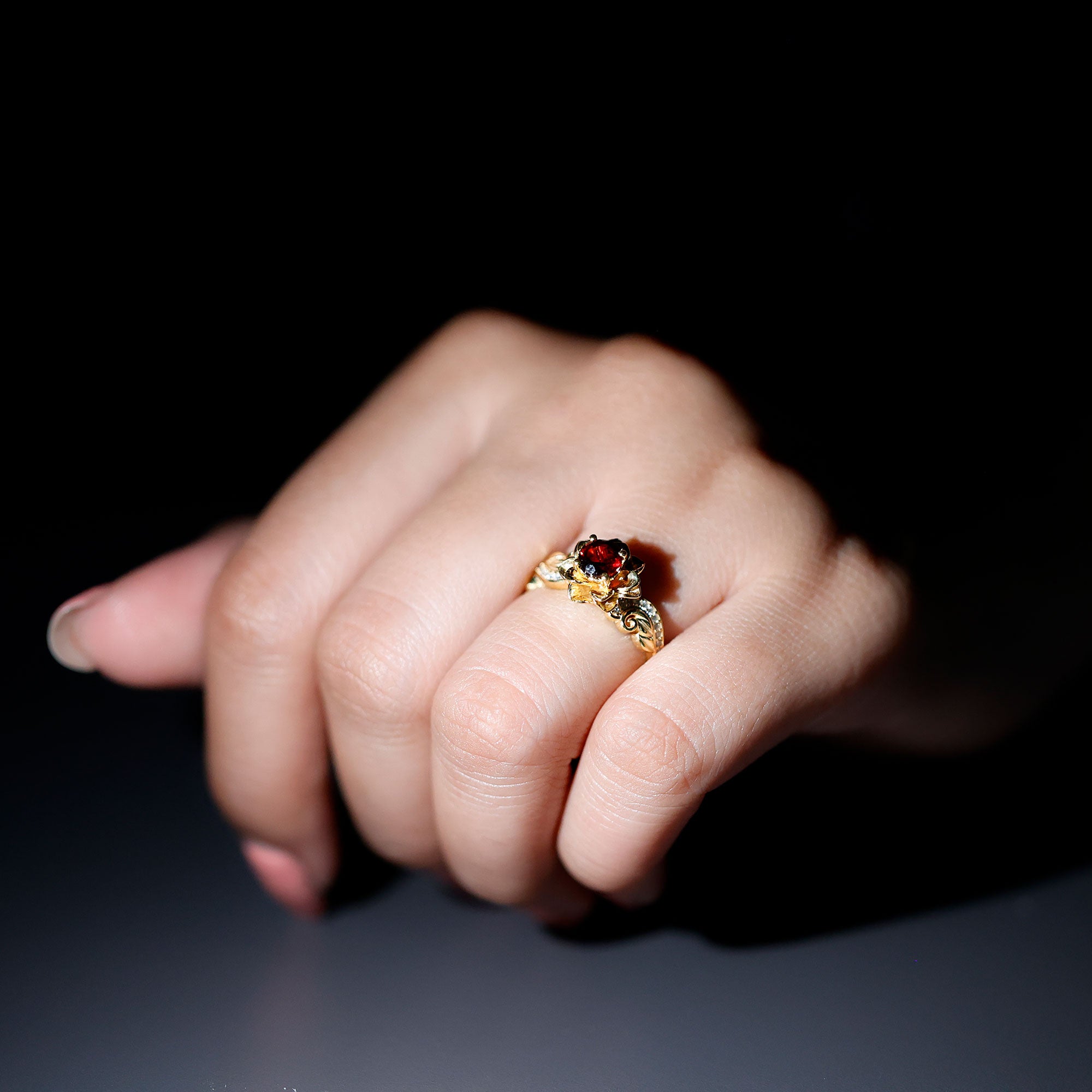 Step back into the enchanting allure of the vintage era with this gorgeous Garnet Engagement Ring, crafted to put you in the spotlight. It features a captivating floral-inspired design that exudes vintage elegance, showcasing a 5 MM natural Garnet set in a prong setting and encircled by delicate metal petals, forming a stunning floral centerpiece. The shank is a masterpiece, blending various elements together - the beautiful flower petals, intricately designed metal vines, and sparkling round cut moissanite stones. This Flower Engagement Ring is perfect for making a bold and glamorous statement on your big day. All the stones in this Vintage Style Engagement Ring are certified, ensuring it is a reliable piece of jewelry. With its timeless charm and contemporary shine, this 14k Yellow Gold Plated Silver Garnet Ring serves as a lovely symbol of love that will endure for a lifetime.