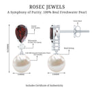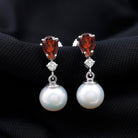 Make her eyes sparkle as brightly as these Pearl Drop Earrings. We designed these Dangle Earrings to capture timeless elegance and charm, featuring a 6 MM round freshwater pearl dangling below with a 5X7 MM Pear shaped garnet at the top and a dainty round moissanite in the center. The drop style allows the earrings to sway beautifully with every movement, making them a mesmerizing addition to any jewelry collection. These Dangling Earrings are curated in 14K White Gold Plated Silver with screw back closure, ensuring both comfort and security, and are ideal for all-day wear. To guarantee premium craftsmanship, these Wedding Earrings come with a certificate of authenticity.