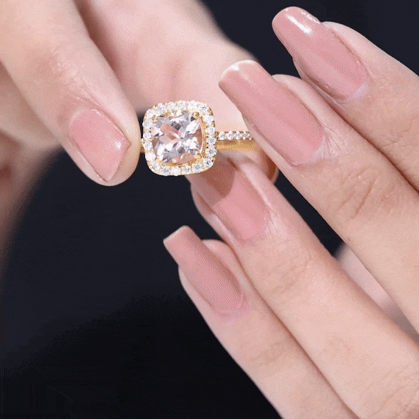 Express your love with this gorgeous Engagement Ring adorned with an 8 MM Cushion Cut Morganite gemstone set in Prong Setting, surrounded by a halo of sparkling Diamond gemstones. The delicate band of the ring is also embellished with Diamond Side Stones, adding extra brilliance and sparkle. This beautiful ring is sure to give you an enchanting look that will leave everyone mesmerized.