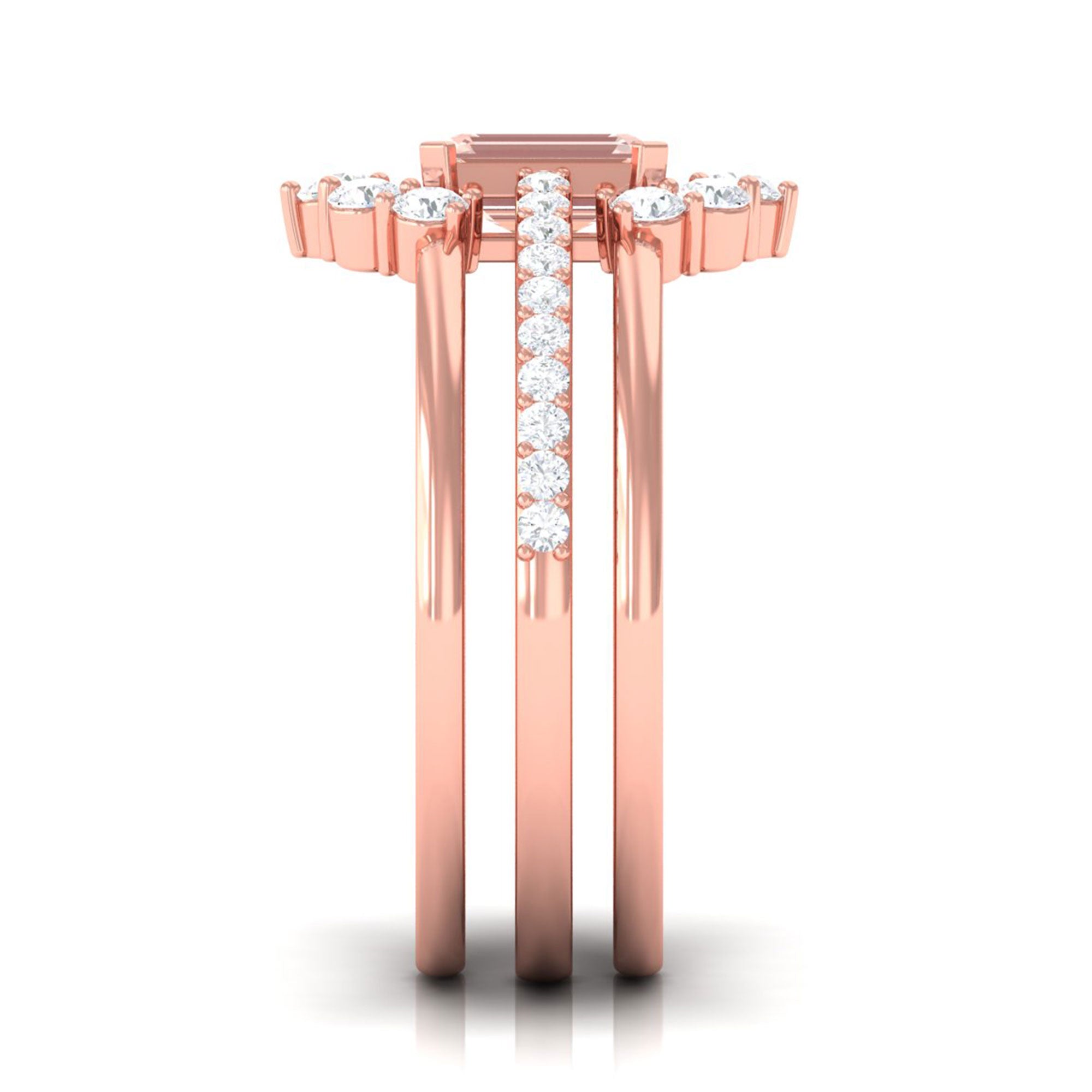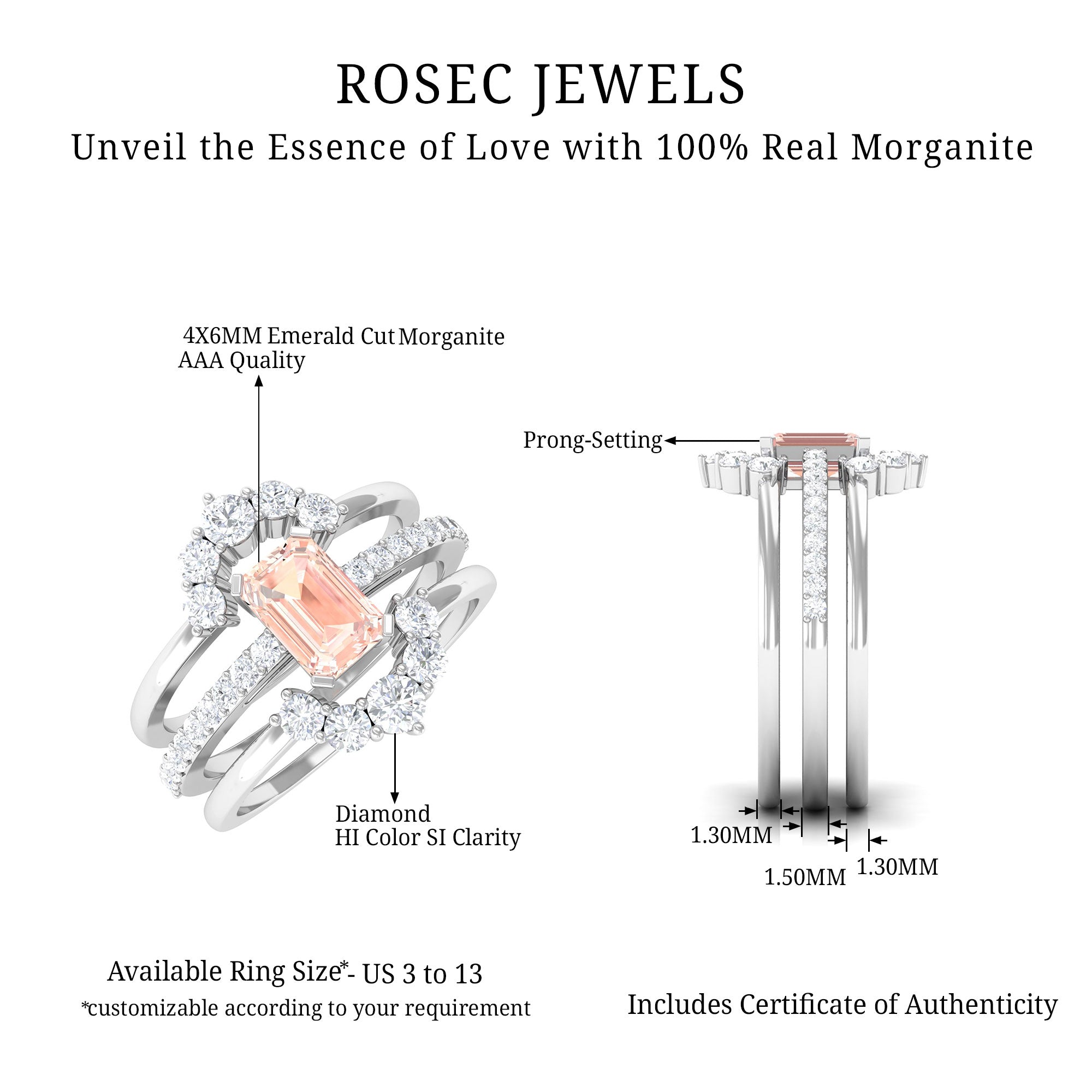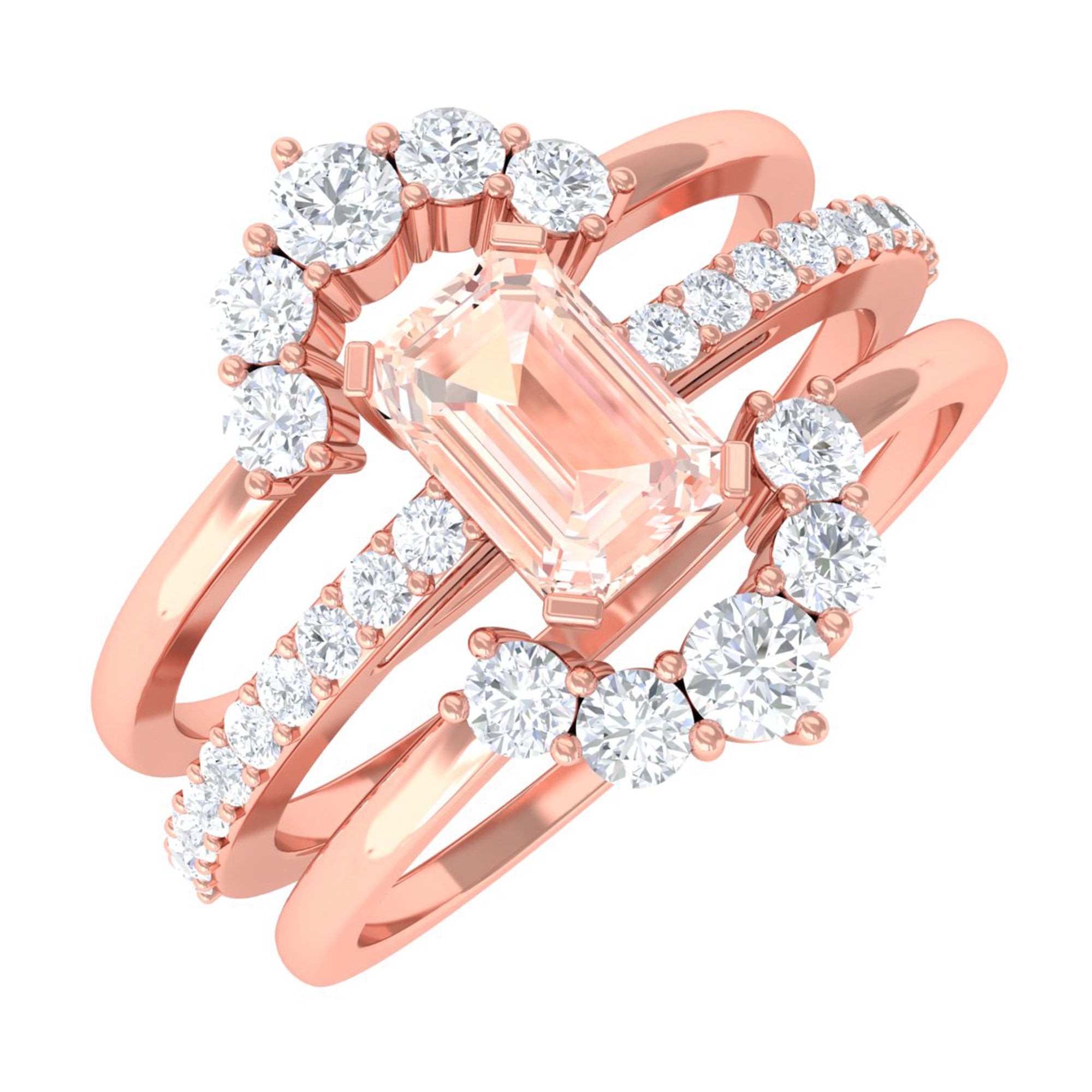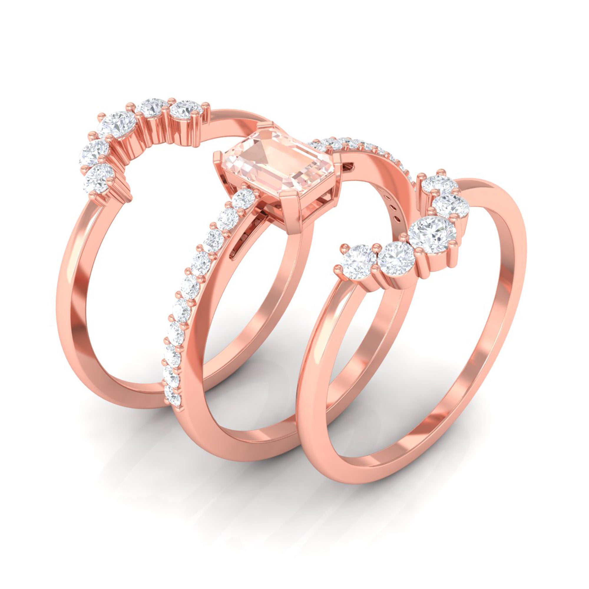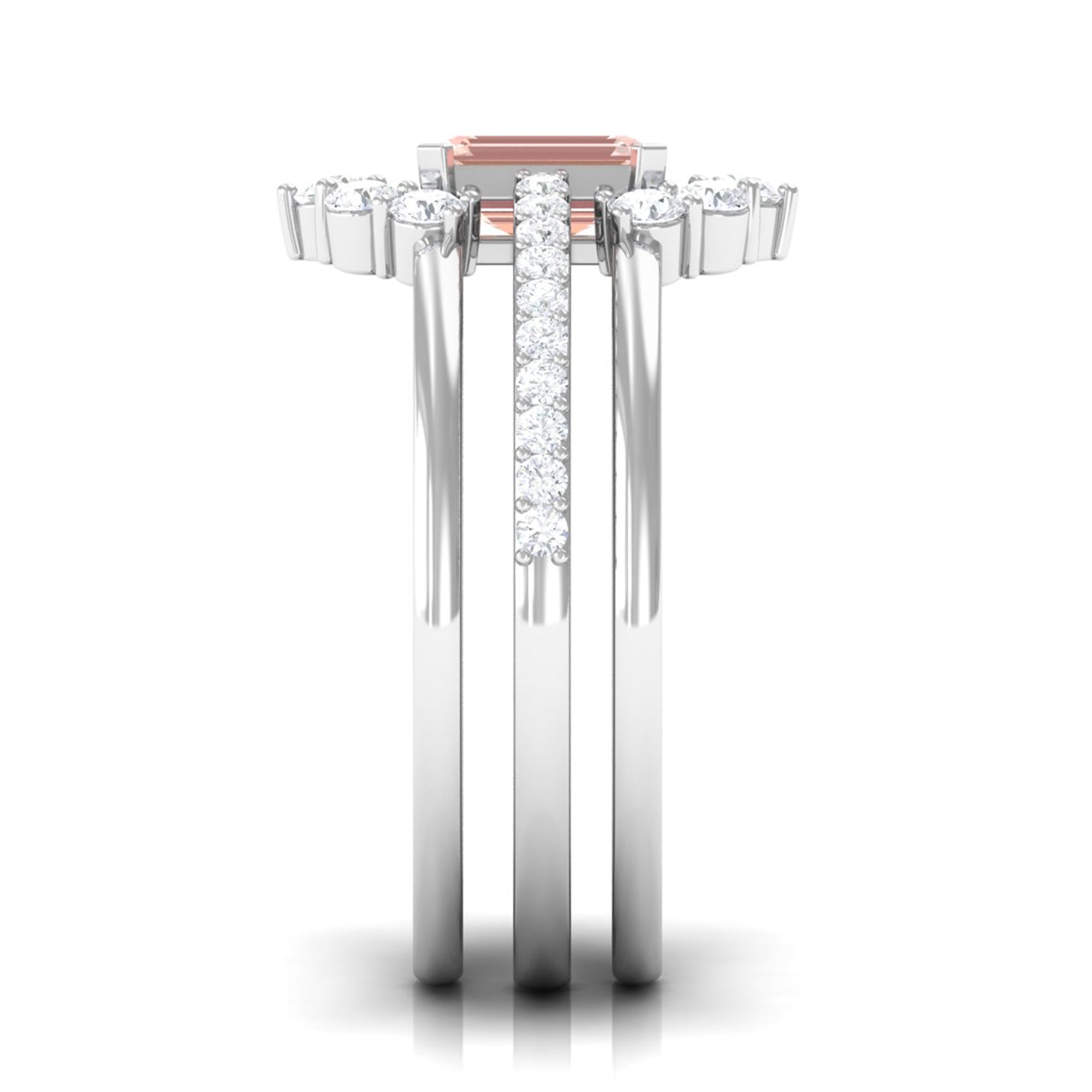 Make your day more special and unforgettable with this alluring Engagement Ring Set. Embellished with Emerald Cut Morganite studded as Solitaire while more dainty Round Shape Diamond studded on the two matching band. So, this Trio Ring Set will complement her beautiful dress and will let her grab all the attention on the big day.