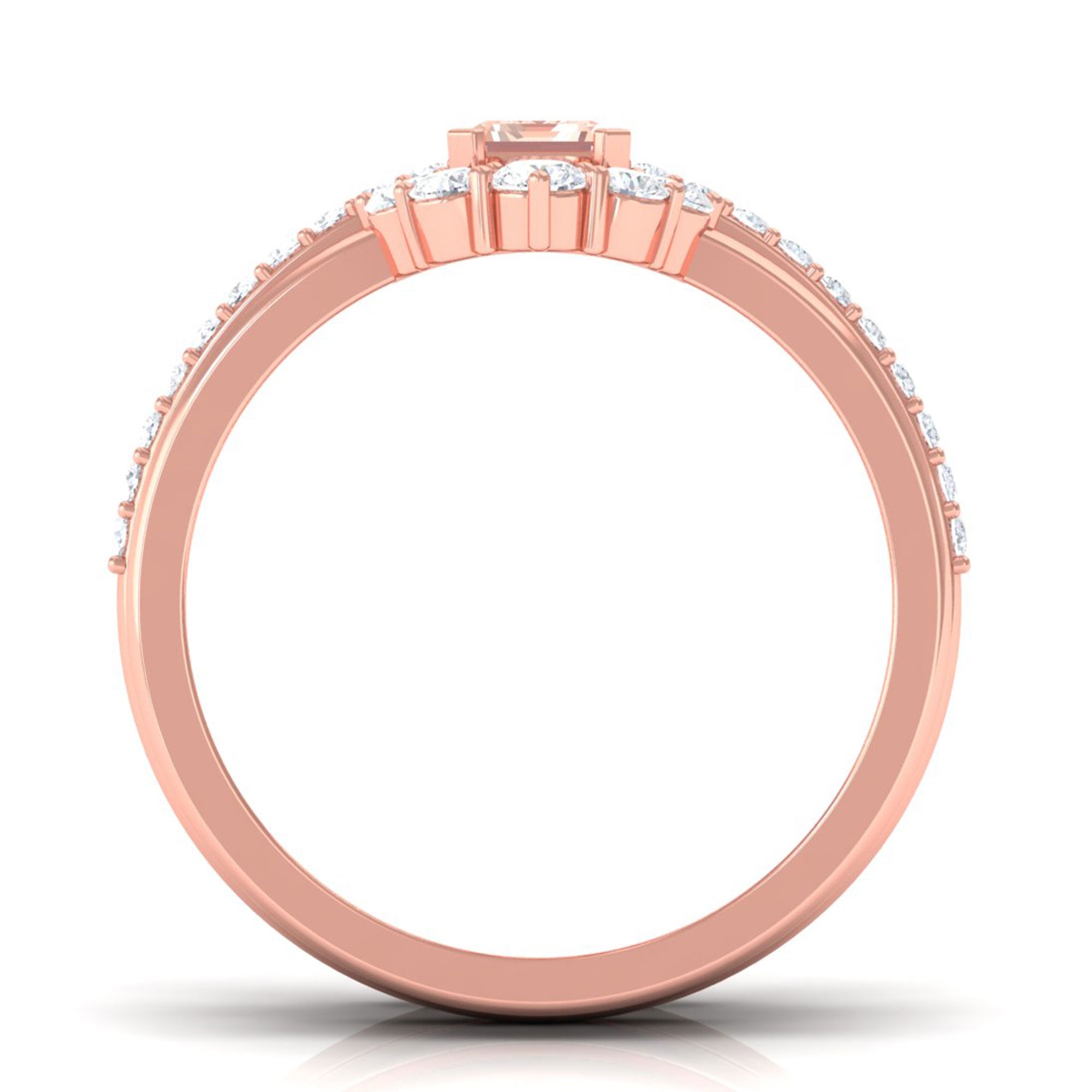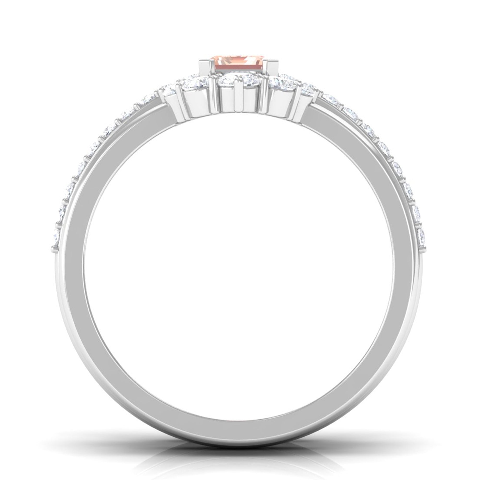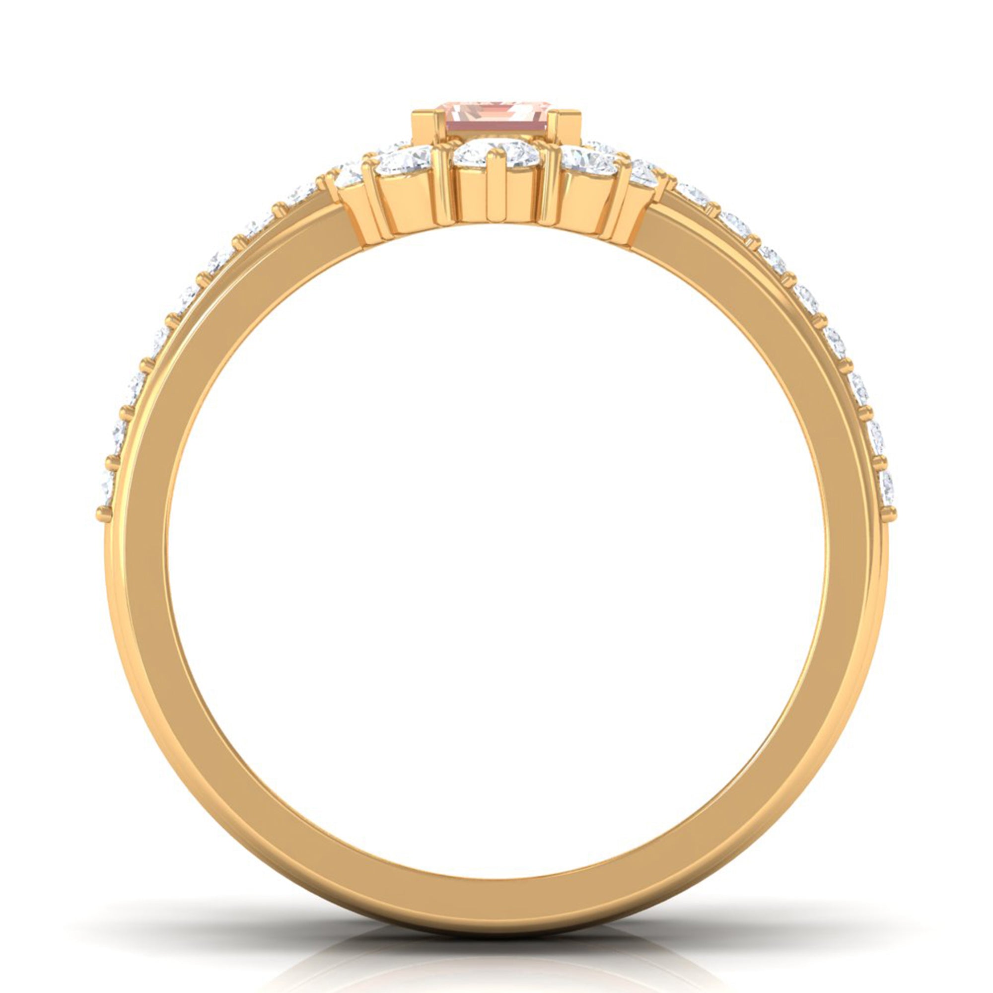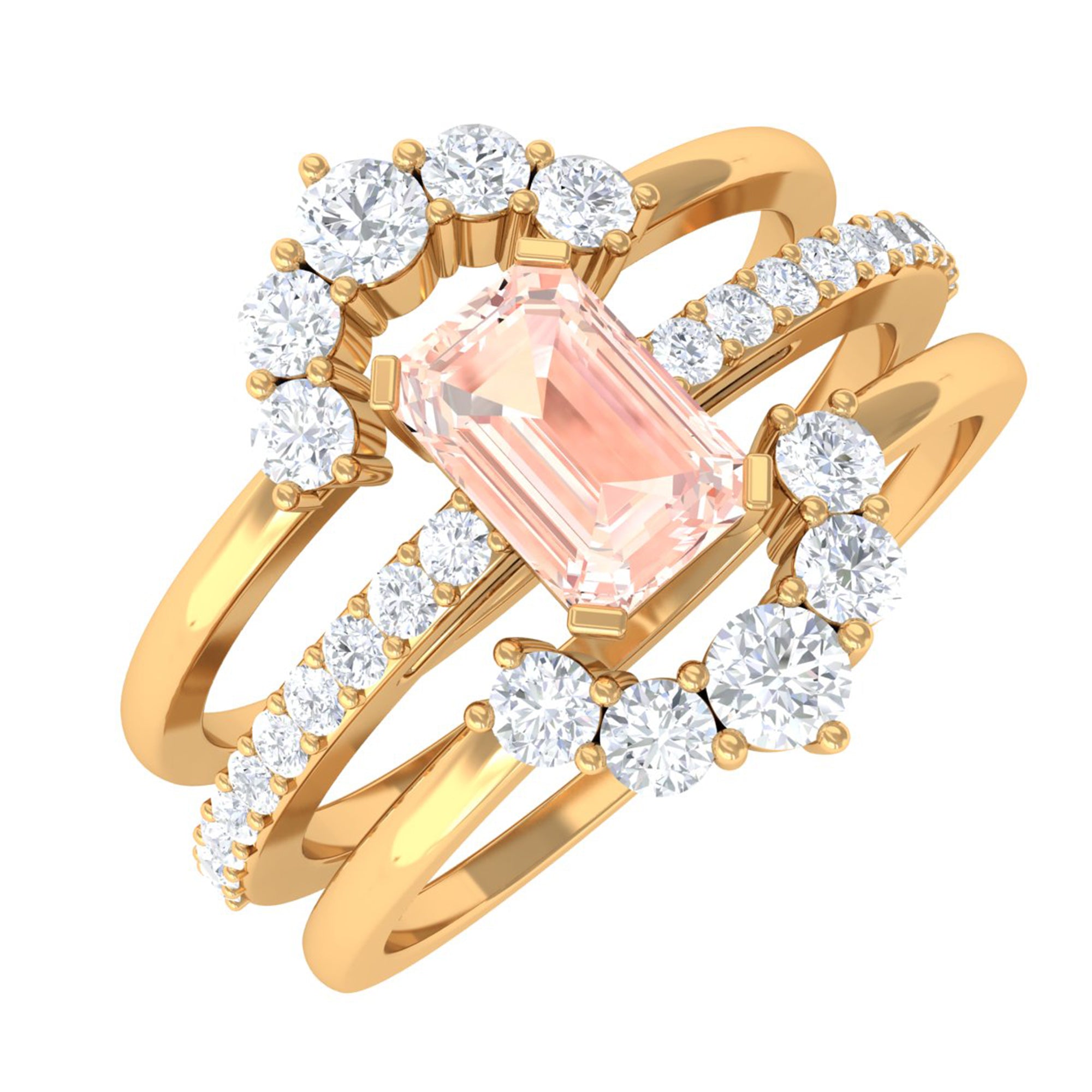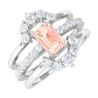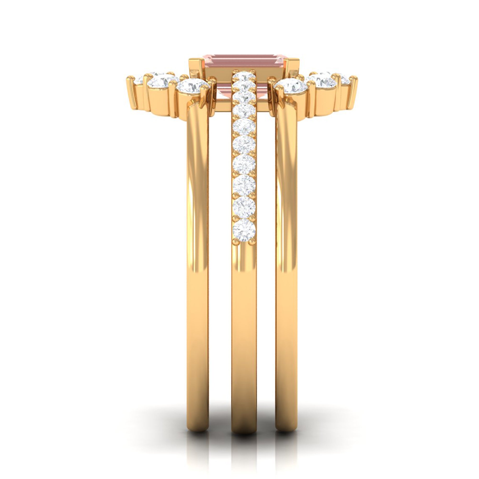 Make your day more special and unforgettable with this alluring Engagement Ring Set. Embellished with Emerald Cut Morganite studded as Solitaire while more dainty Round Shape Diamond studded on the two matching band. So, this Trio Ring Set will complement her beautiful dress and will let her grab all the attention on the big day.