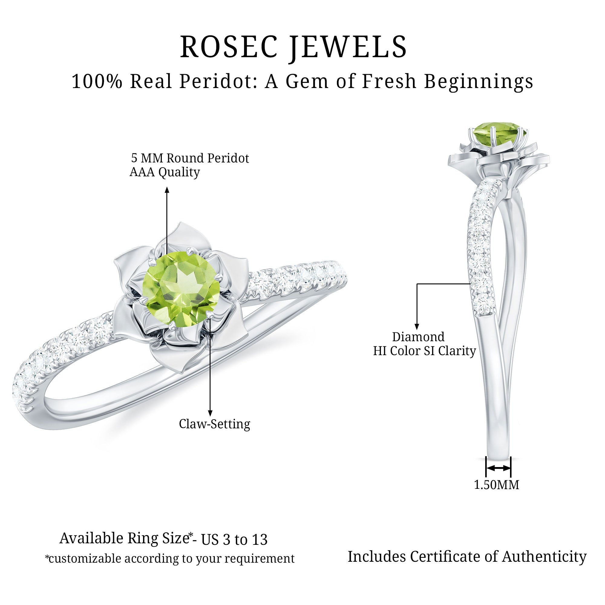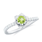 The Perfect Combination of Peridot and Diamond in this Rose Flower Ring is mesmerizing. The Round Natural Peridot is set in Centre of a Gold Petals of Rose Flower in the curved shank. Get this Floral Inspired Engagement Ring for your Blooming Lady Love, this Peridot and Diamond Engagement Ring is a stunning jewelry, which she will cherish her whole life.