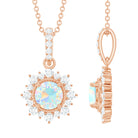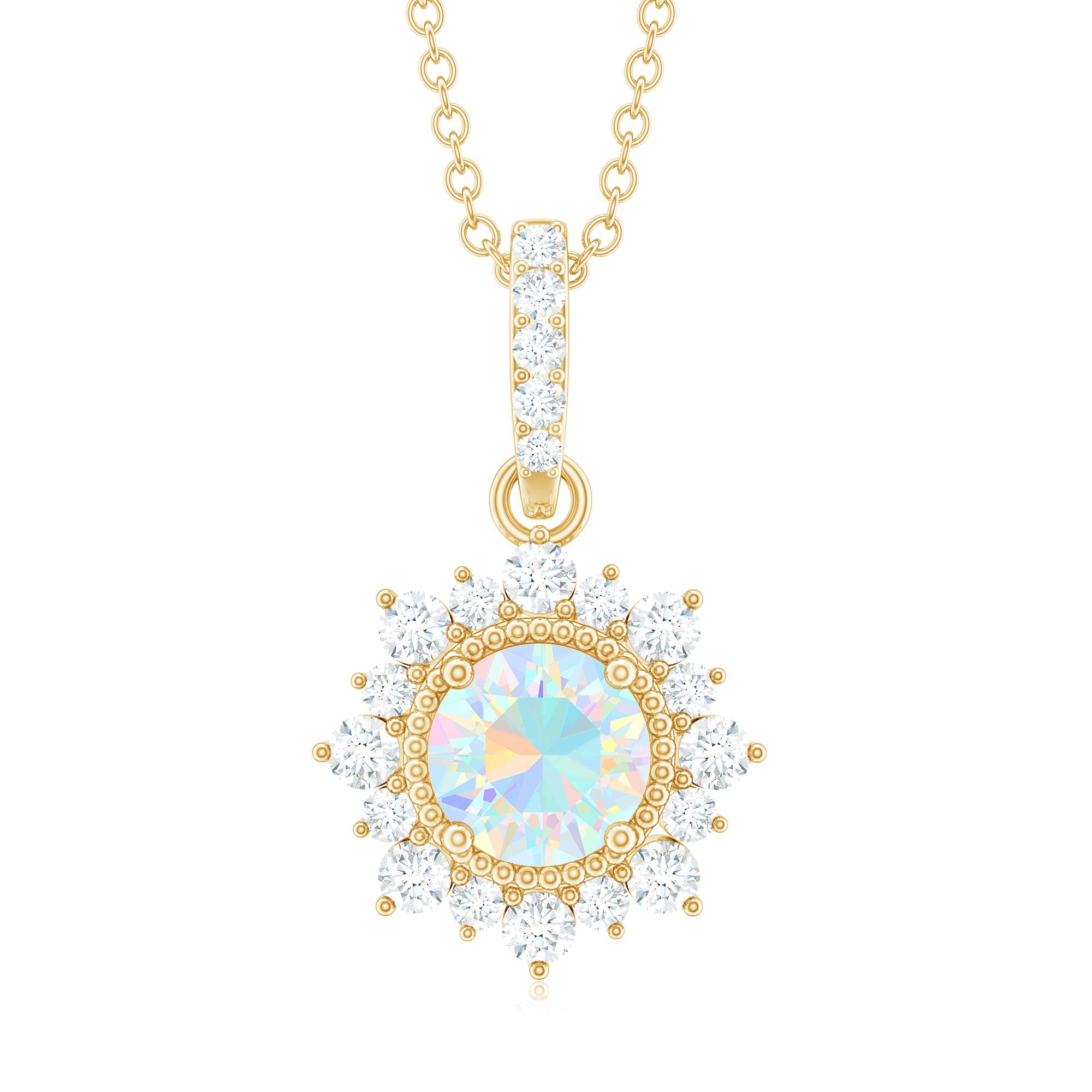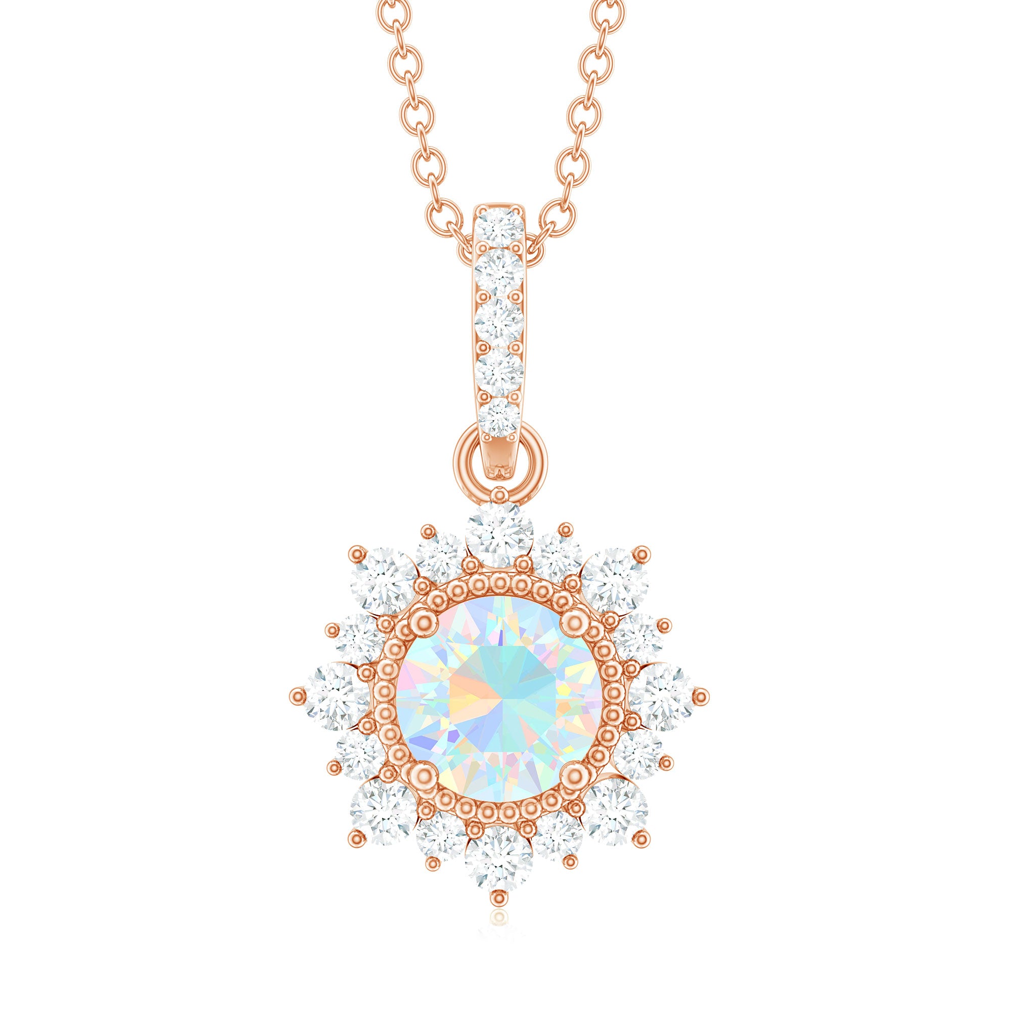 This Ethiopian Opal Pendant exudes an astonishing shine that will grab all the attention of you. It features a 6 MM Ethiopian Opal encircled with smaller diamonds along with beaded detailing creating an enchanting allure. The center stone is securely placed in Prong Setting and dangles with a diamond studded bail. This Halo Necklace exudes the unmatchable shine of AAA Quality Ethiopian Opal and HI-SI Quality Diamonds that amplify the shine of pendant. This Solitaire Pendant will surprise your lady when you present it to her on a special day. The pendant will be delivered to you in a premium jewelry box with the certificate of authentication.