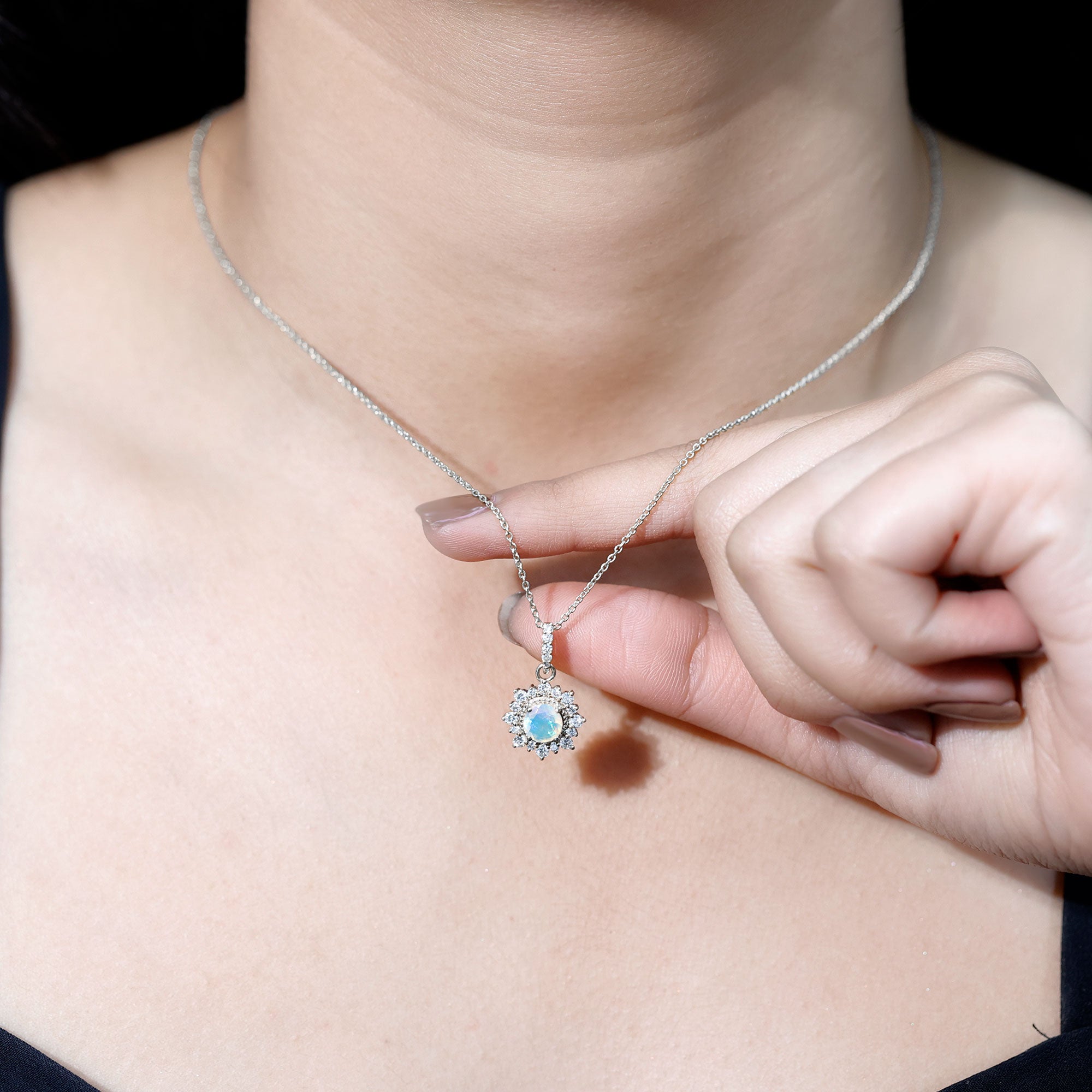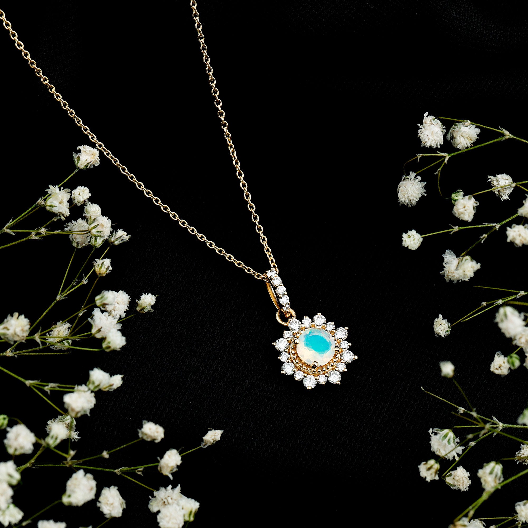 This Ethiopian Opal Pendant exudes an astonishing shine that will grab all the attention of you. It features a 6 MM Ethiopian Opal encircled with smaller diamonds along with beaded detailing creating an enchanting allure. The center stone is securely placed in Prong Setting and dangles with a diamond studded bail. This Halo Necklace exudes the unmatchable shine of AAA Quality Ethiopian Opal and HI-SI Quality Diamonds that amplify the shine of pendant. This Solitaire Pendant will surprise your lady when you present it to her on a special day. The pendant will be delivered to you in a premium jewelry box with the certificate of authentication.