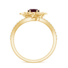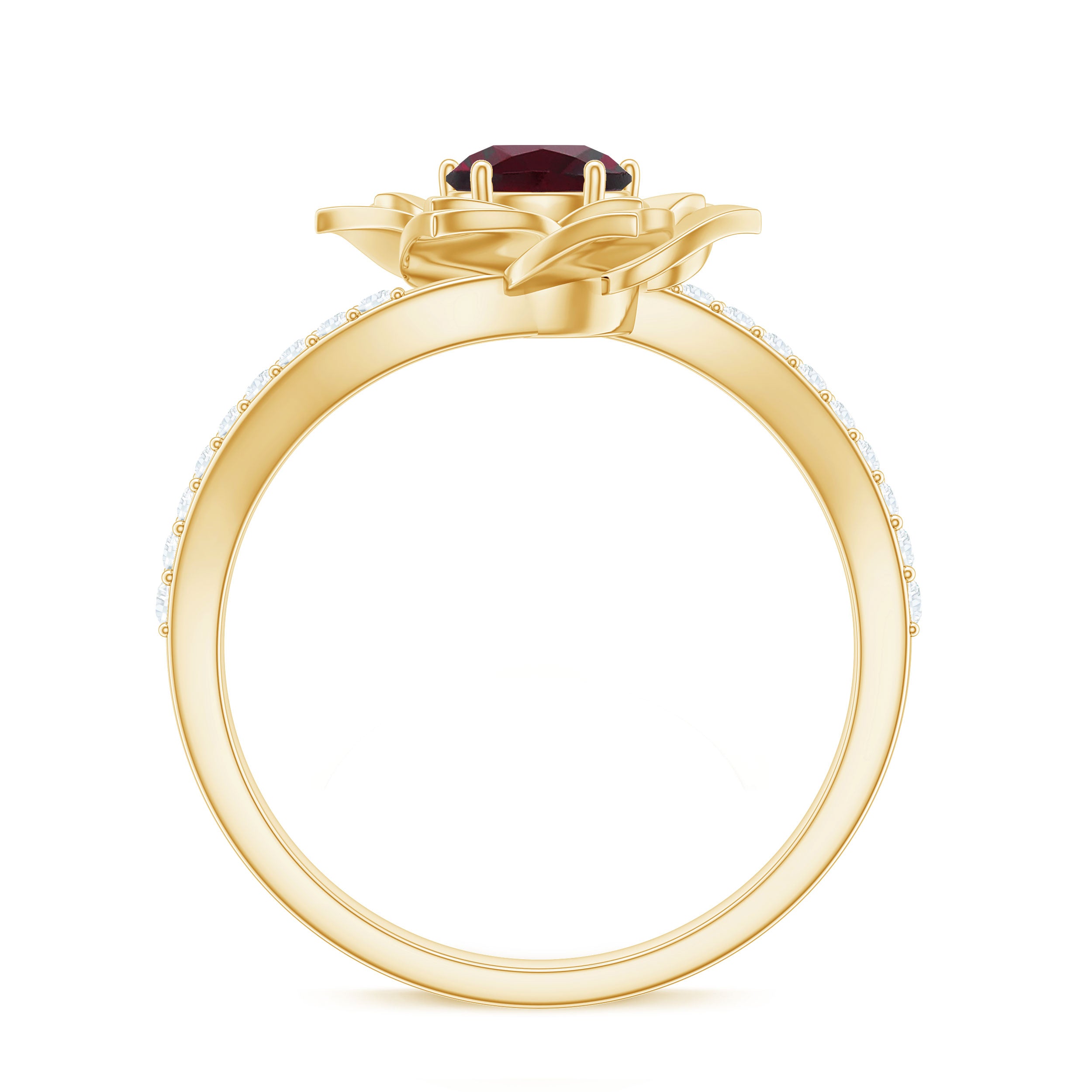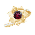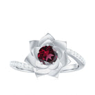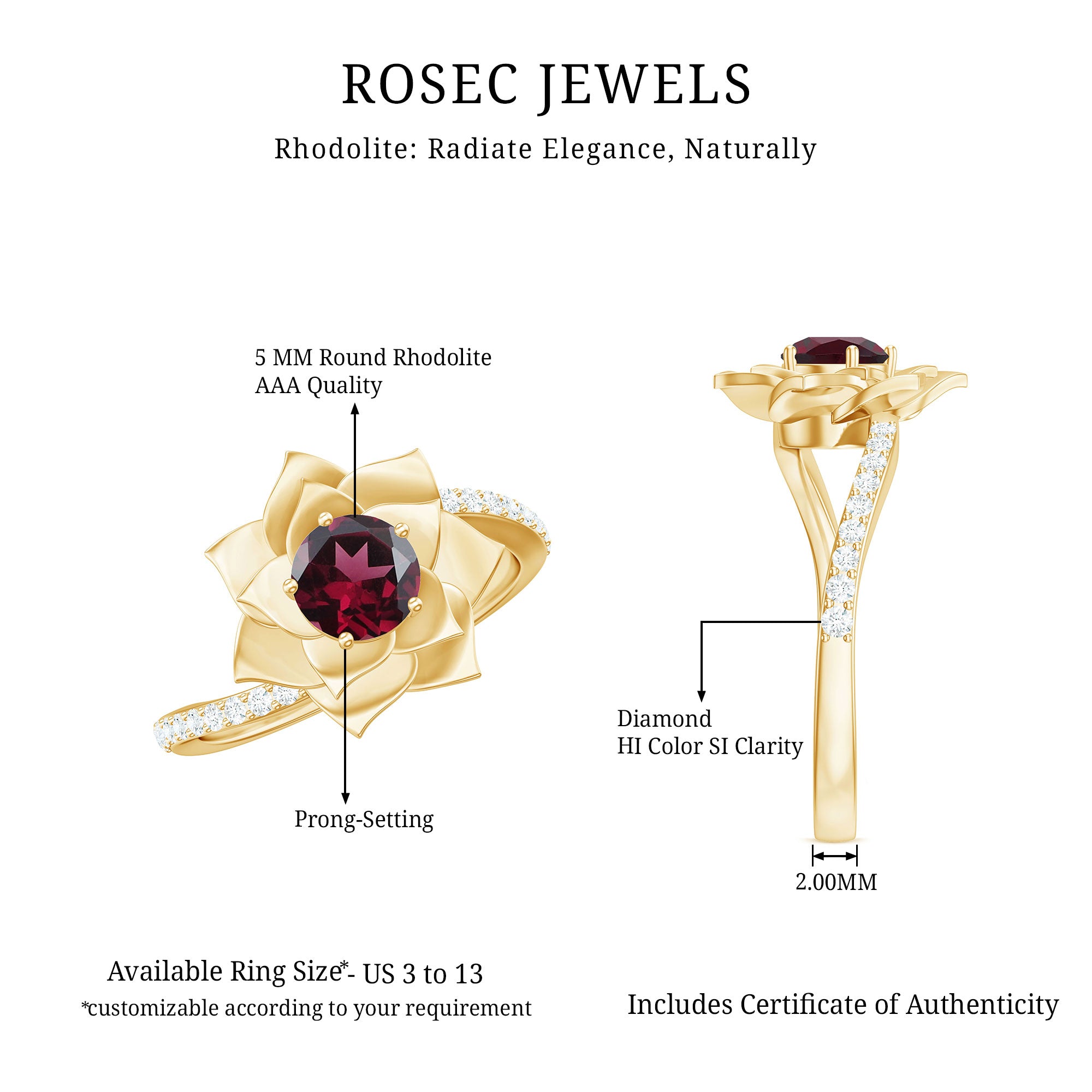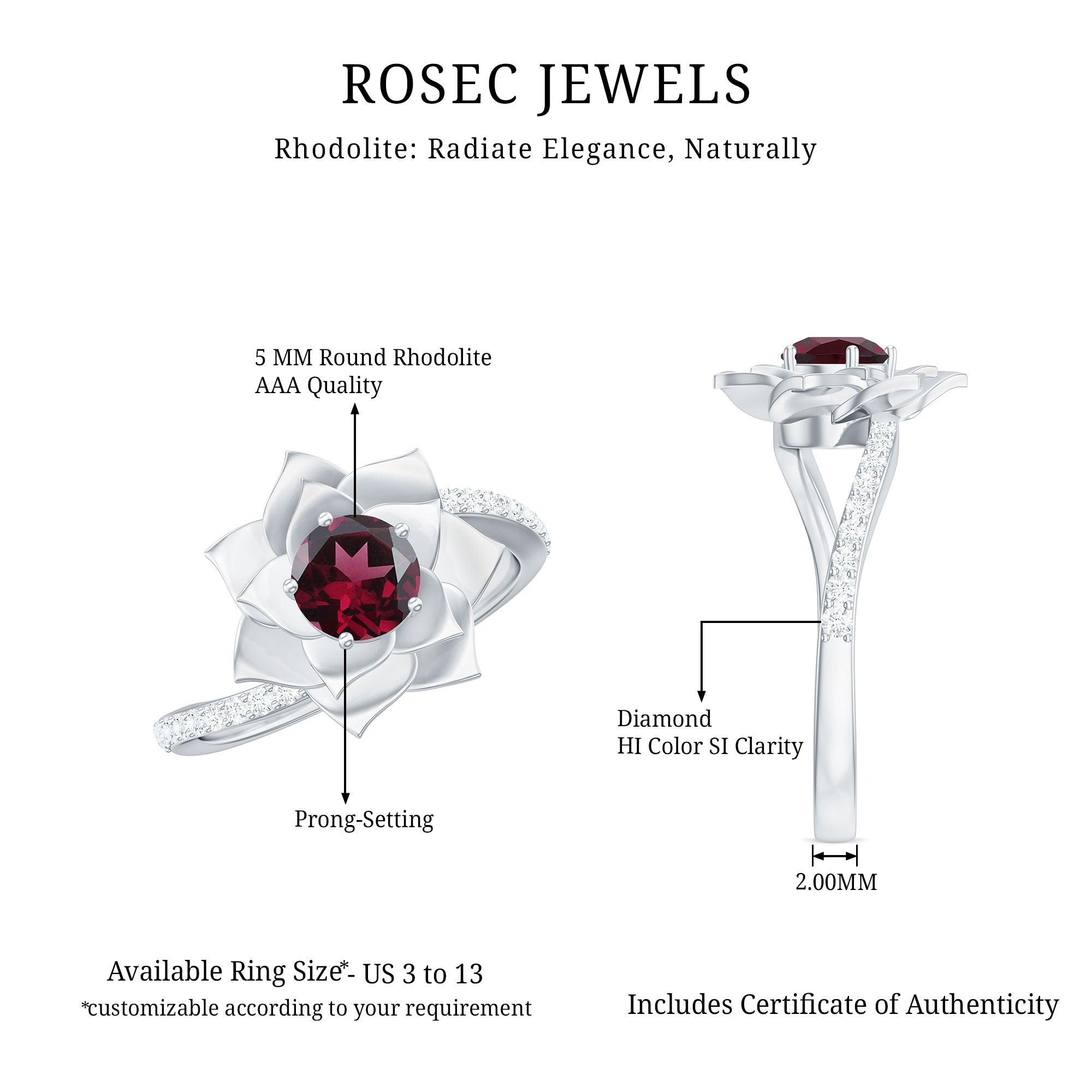 Get the alluring Flower Engagement Ring embellished with Round Shape Rhodolite in Prong Setting in the center of a flower design and Round Shape Diamond accentuating its shank. The Bypass Ring is fashioned in Hallmarked Metal offering it a charming appeal. Your partner will love this Rhodolite Ring and she wont be able to hide her happiness. This Rhodolite Ring is the perfect piece of jewelry for your special day.