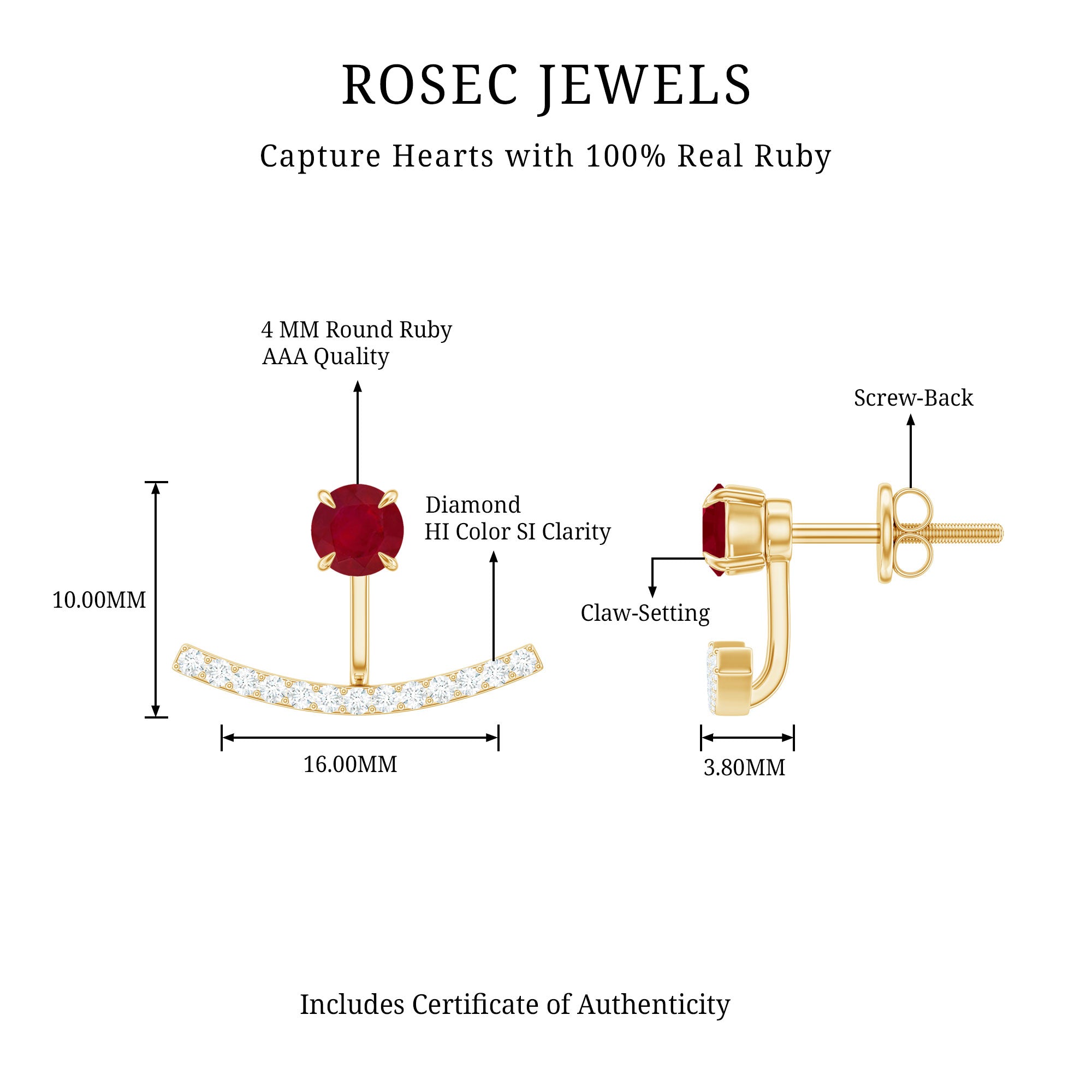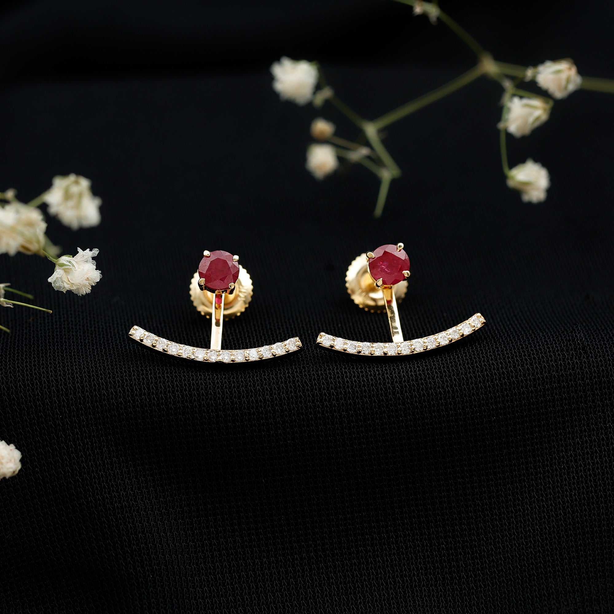 The Ruby Front Back Earrings are a gorgeous pair designed to create alluring looks as they can be worn together or separately. The Ear Jacket Earrings are crafted in Hallmarked Metal and adorned with Round Shape Ruby at the front and dainty Round Diamonds embellished on the jacket. The Double Sided Earrings come with a Screw Back Closure to comfortably secure them in place. Celebrate a special milestone in your relationship by getting our beautiful Red Ruby Earrings for your better half as an anniversary gift.