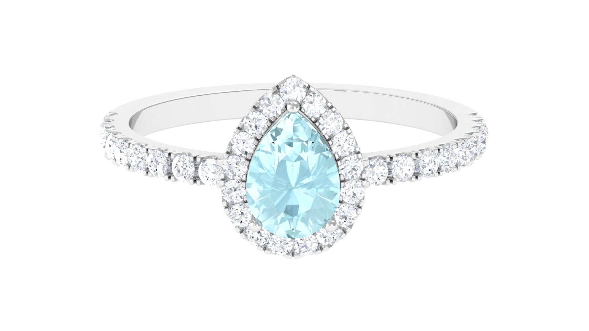 Embrace elegance with a genuine sky blue topaz teardrop ring accented by a mesmerizing Diamond halo, a perfect combination of beauty and grace.