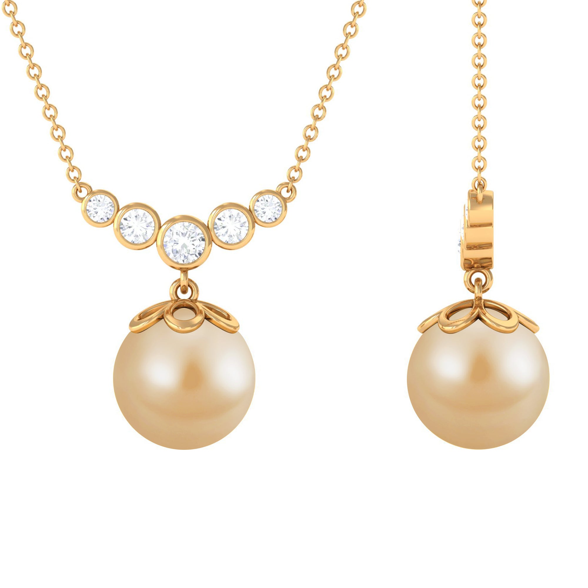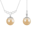 Introducing our remarkable designer necklace featuring a round South Sea pearl, exuding an aura of refined elegance. The centerpiece of this necklace, the lustrous pearl, is complemented by bezel-set round Diamond stones arranged in a graduated style, forming a captivating curved bar design. Each Diamond stone glistens with brilliance, perfectly accentuating the beauty of the pearl.