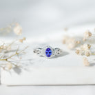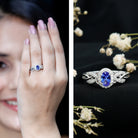 Some love stories deserve a design that is as rare and unforgettable as the bond itself. This beautiful Tanzanite Engagement Ring brings just that, a perfect mix of elegance and individuality. Thoughtfully crafted in 14K white gold plated silver, the Criss Cross Ring balances timeless design with a modern twist, making it a meaningful symbol of your forever promise. At the center sits a 4X6 MM oval cut tanzanite, securely held in prong setting to allow light to pass through and enhance its natural brilliance. Surrounding the center stone is a sparkling halo of round lab grown diamonds that gently catch the light from every angle, adding a soft glow to the overall design. What makes this Oval Engagement Ring truly stand out is the crossover style shank, accented with additional lab grown diamonds. The twist detail represents two lives intertwined, moving forward together, stronger and brighter. It is a subtle yet beautiful design choice that adds depth and symbolism to the ring, all while keeping it elegant and wearable. It comes with a certificate of authenticity and is beautifully packed in a signature jewelry box, ready to become part of your story.
