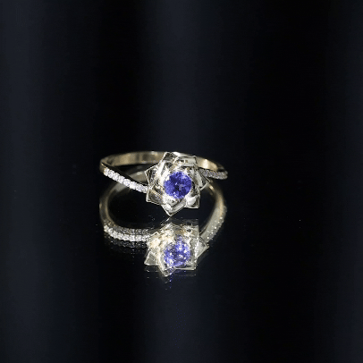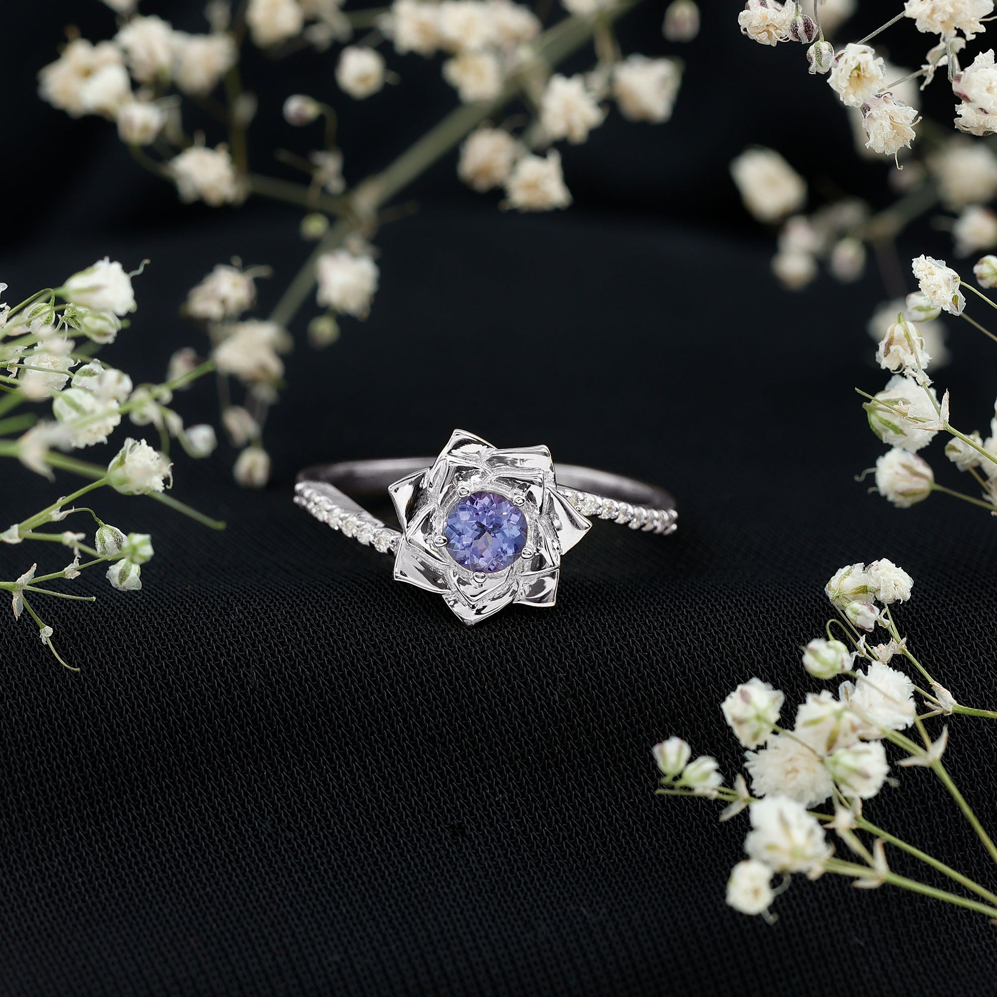 Elevate your style with this floral-inspired engagement ring. Featuring a round-cut Tanzanite and Diamond stones set in a prong setting, this ring features a beautiful bypass shank. Propose to your ladylove with this stunning Tanzanite ring and level up your glam quotient.