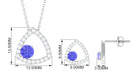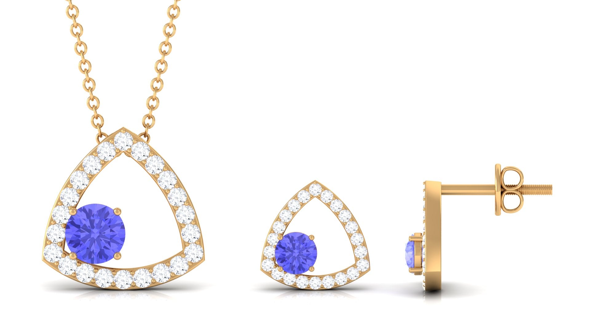 Inspired by geometric pattern, this jewelry set includes a showstopper necklace pendant and a stunning pair of stud earrings. The necklace and earring set is fashioned out of geometric frames, round moissanite, and round tanzanite. The design resembles an open triangle that is uniquely crafted with perfection and precision. Held in prongs, the tanzanite, and moissanite exude a sophisticated beauty. Wear the jewelry set with anything that deserves extra eyeballs.