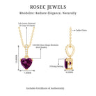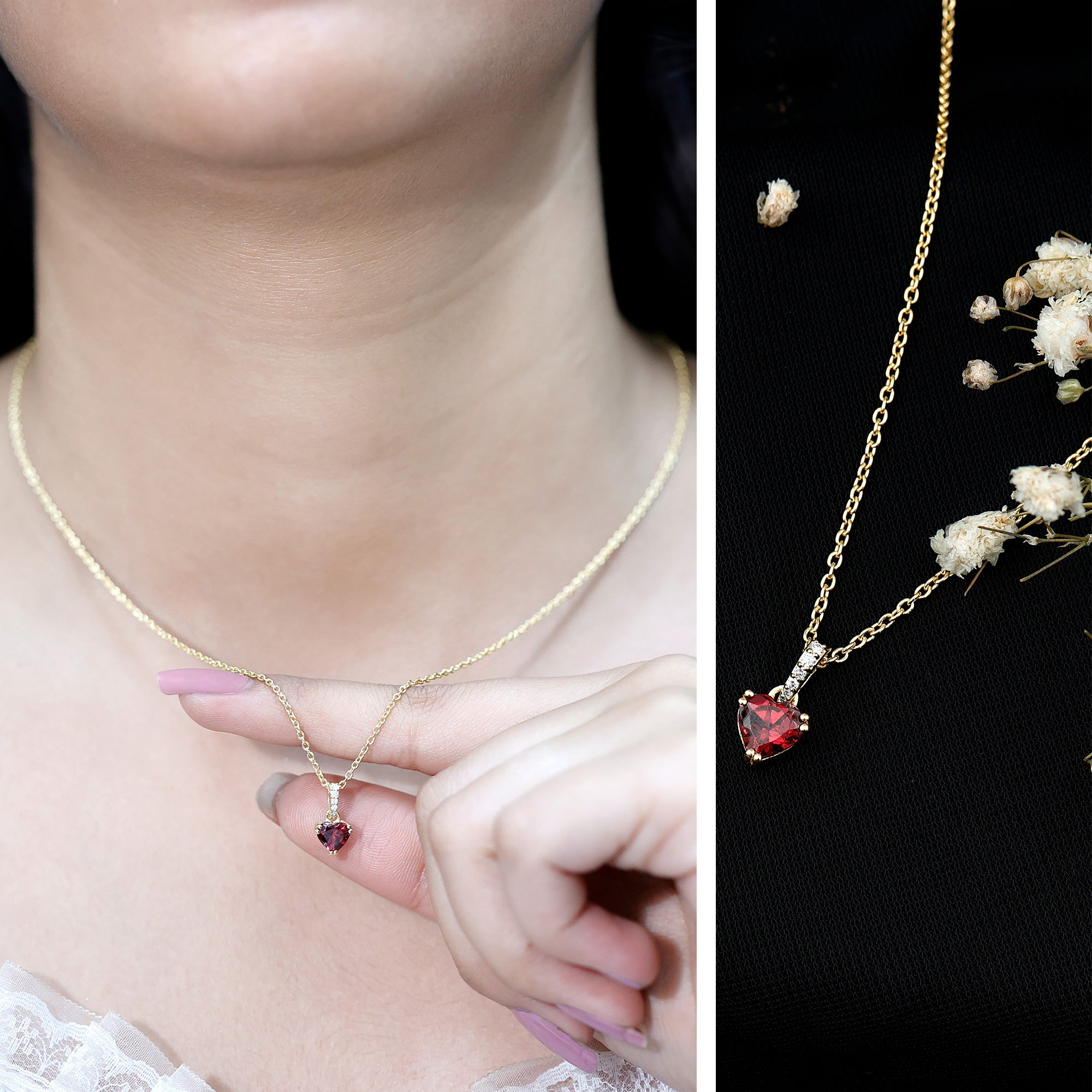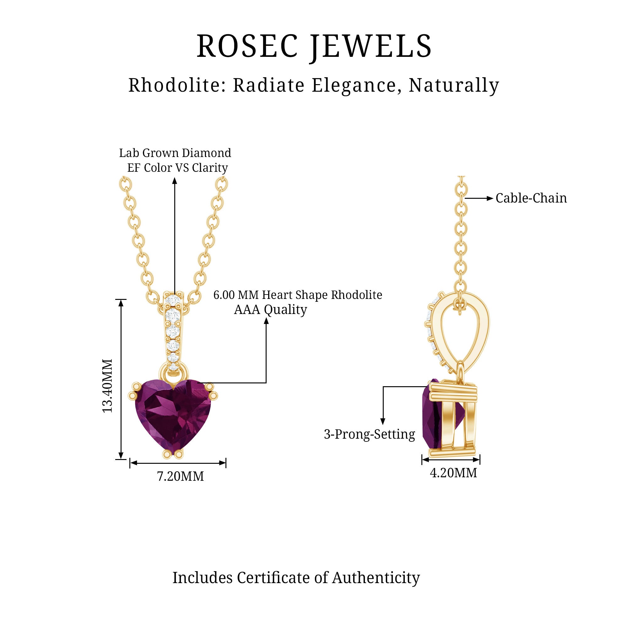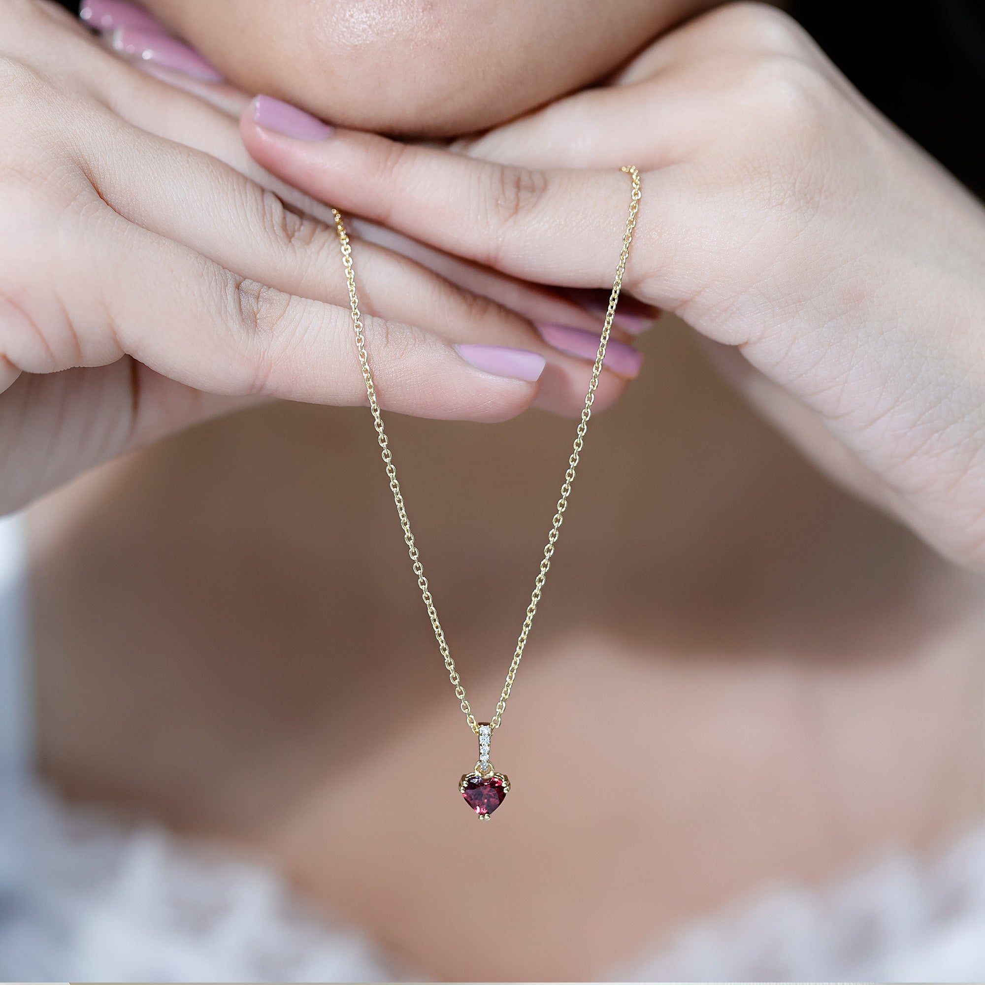 Designed to make you the talk of the town, this Rhodolite Heart Necklace blends romantic beauty with graceful charm. Handcrafted in 14K yellow gold plated silver, this elegant piece features a 6 MM heart shaped natural Rhodolite gemstone. It is set securely in double-prong setting to keep it safe and stylish. Just above the heart, the decorative bail is accented with shimmering round lab grown diamonds, creating a beautiful transition between the pendant and the chain. The Rhodolite and Diamond Necklace hangs from a sleek and strong cable chain that sits comfortably on the neckline, perfect for layering or wearing on its own. Whether you are heading out for a date night, celebrating a special moment, or simply treating yourself, this Heart Shaped Locket adds a thoughtful and polished touch to any look. The natural AAA quality Rhodolite offers rich, vibrant color, while the EF-VS quality lab grown diamonds bring a soft sparkle that catches the light beautifully. This Rhodolite Garnet Necklace arrives in a signature jewelry box with a gemstone certificate, making it a meaningful Valentines Day gift for wife.