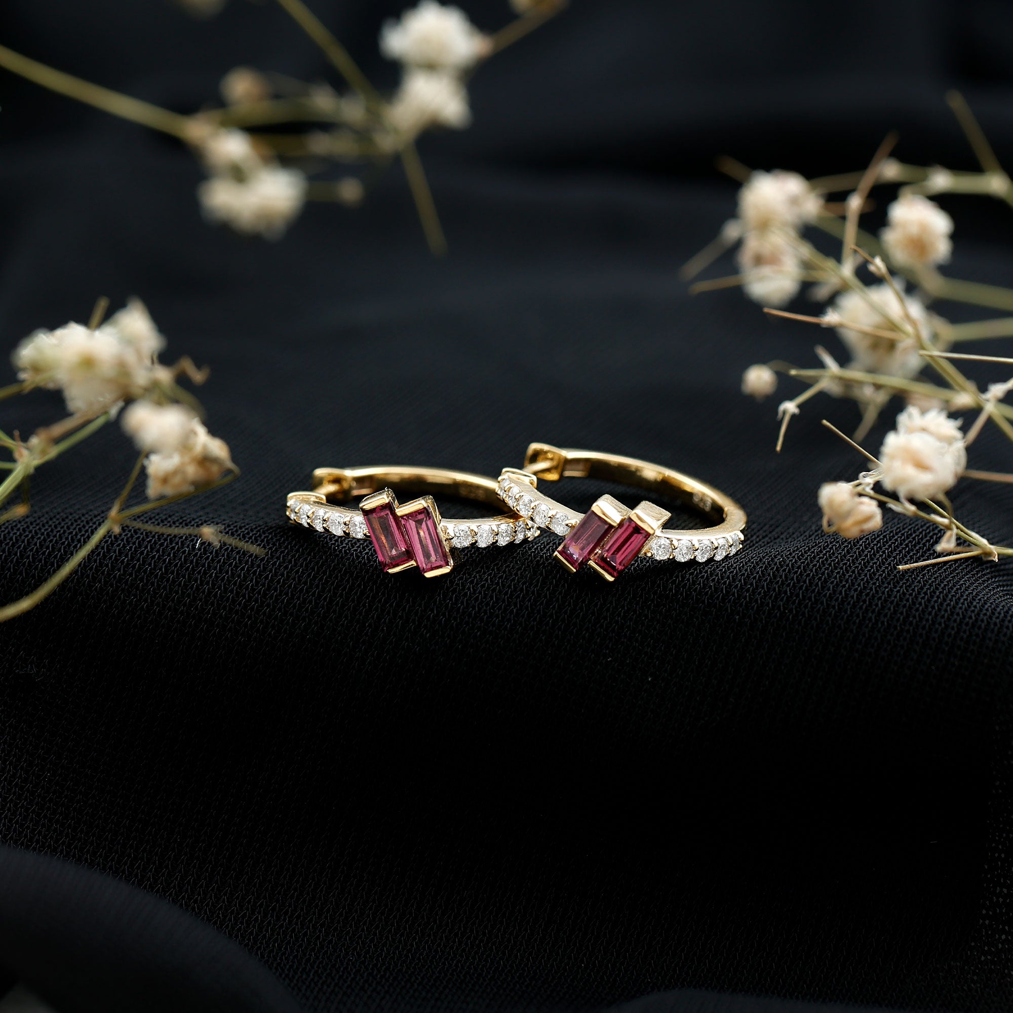Add a vibrant touch of elegance to your everyday style with these beautifully crafted Rhodolite Hoop Earrings. They feature striking 2X4 MM baguette cut Rhodolite gemstones, securely set in bar setting at the front of the hoop. Decorating the hoop are round lab grown diamonds, carefully placed to a touch of sparkle. Crafted in 14k yellow gold plated sterling silver, the Hinged Hoop Earrings are both durable and lightweight, ensuring all-day comfort without compromising on elegance. These Rhodolite and Diamond Earrings are versatile enough to be worn with anything, from your casual work outfit to your evening wear. Whether you are dressing up for a night out or just want to elevate your daily style, they offer a refined, luxurious touch that fits any mood or occasion. This pair is made with precision and care, featuring AAA quality rhodolite and EF-VS quality lab grown diamonds. Packaged in a signature gift box and accompanied by a certificate of authenticity, these Small Hoops also make a meaningful gift for birthdays, anniversaries, or simply to treat yourself.