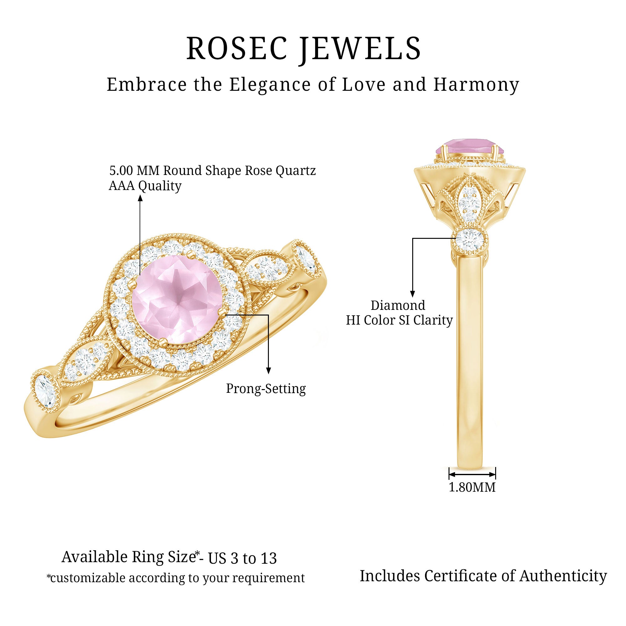 The Vintage Engagement Ring is adorned with a 5 MM Round Shape Rose Quartz in 4 Prong Setting mounted in Solid Gold and embellished with Round Diamond arranged in Halo on the Solitaire Ring. The Engagement Ring is also decorated with Milgrain for a Vintage look.