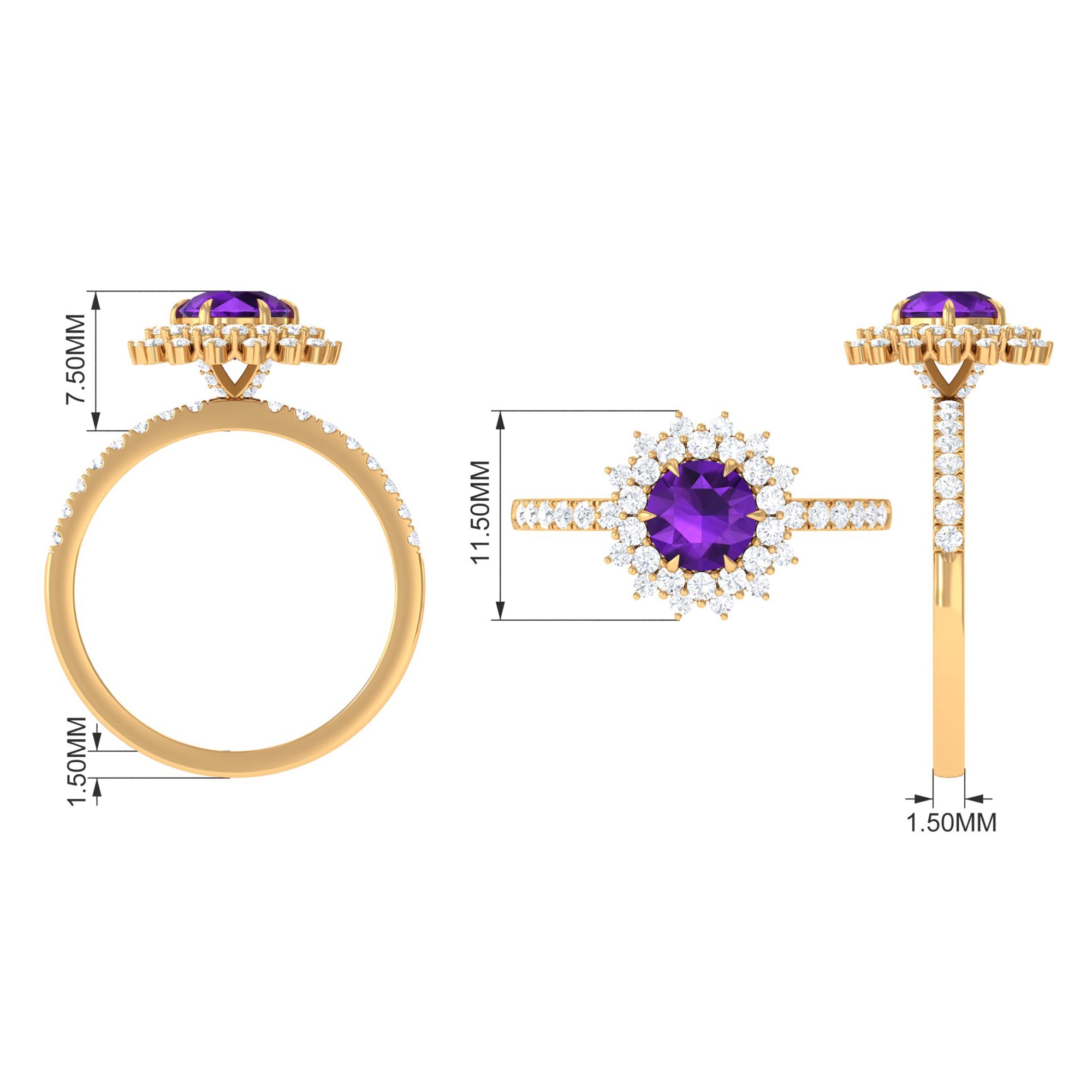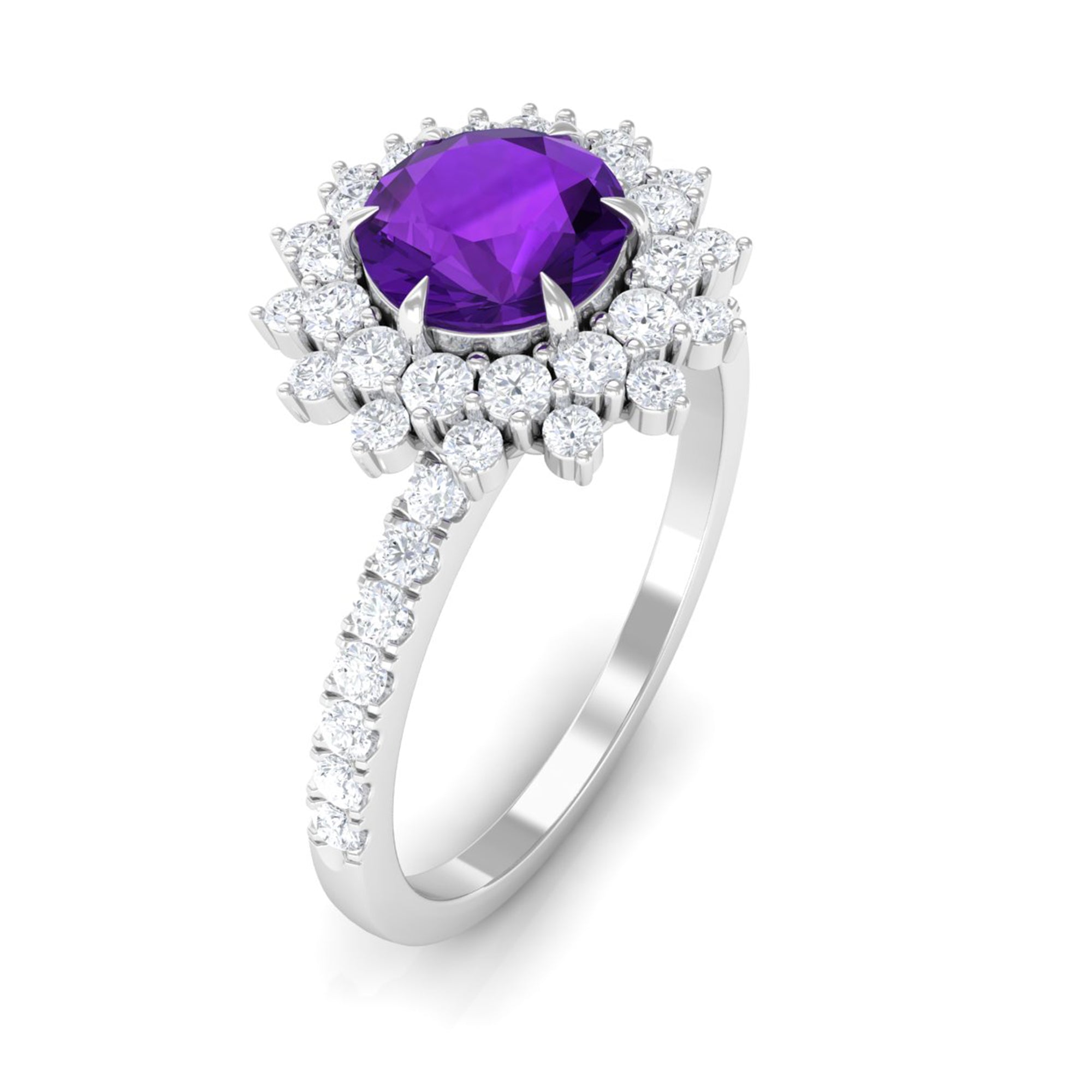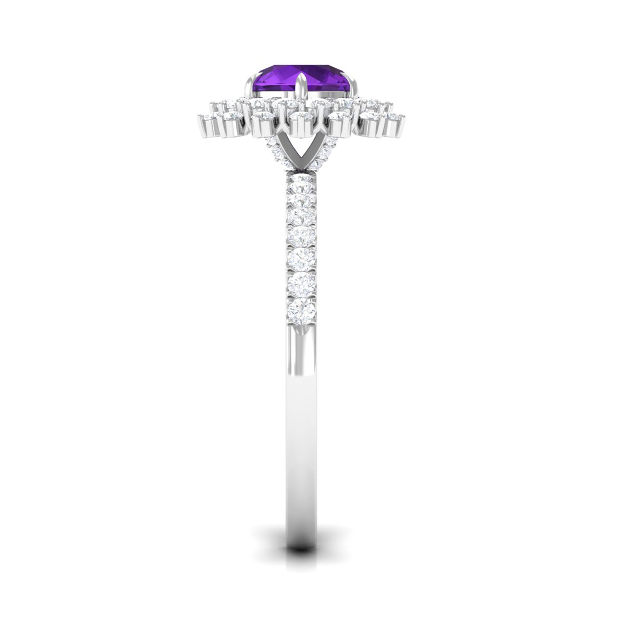 Make a bold statement with this round amethyst engagement ring. The center stone is surrounded by a dazzling cluster of moissanite gemstones, creating a halo effect that adds extra sparkle to the piece. The deep purple hue of the amethyst is both regal and sophisticated, making it the perfect choice for anyone who wants an engagement ring that stands out. The expert craftsmanship and attention to detail ensure that this ring is a true work of art, perfect for expressing your love and commitment to your partner in a unique and memorable way.