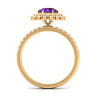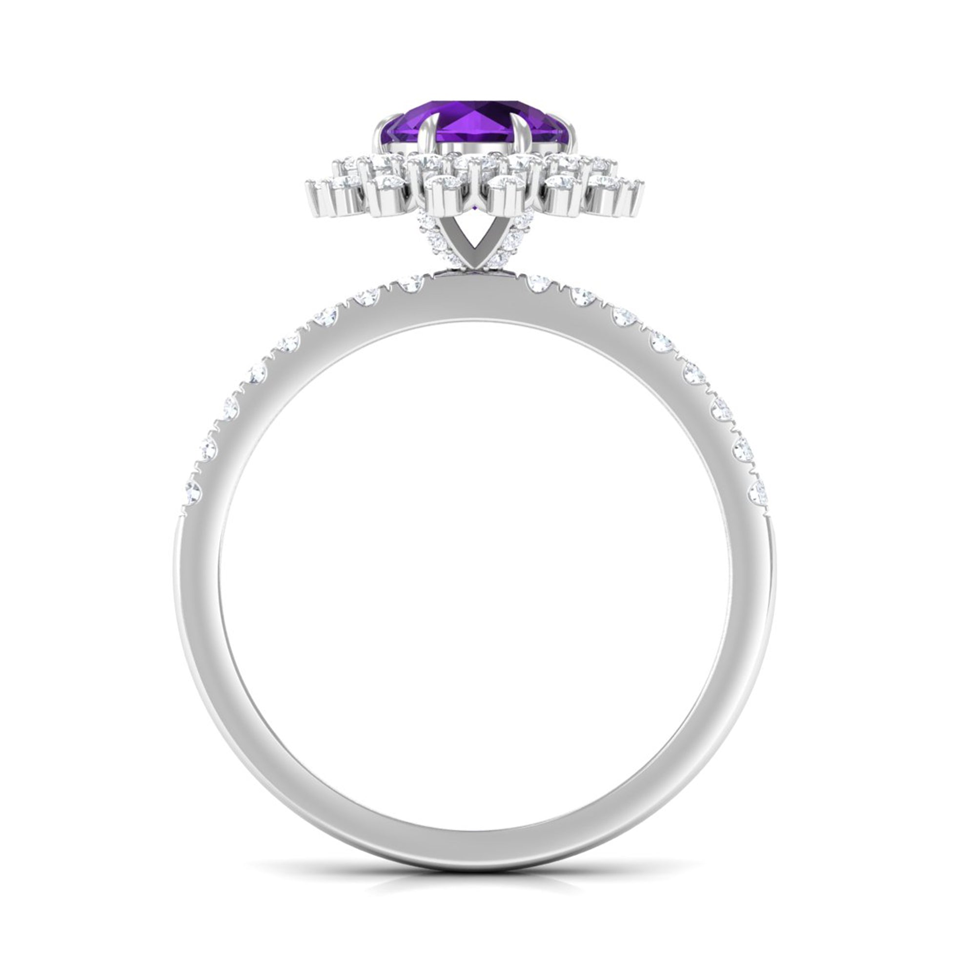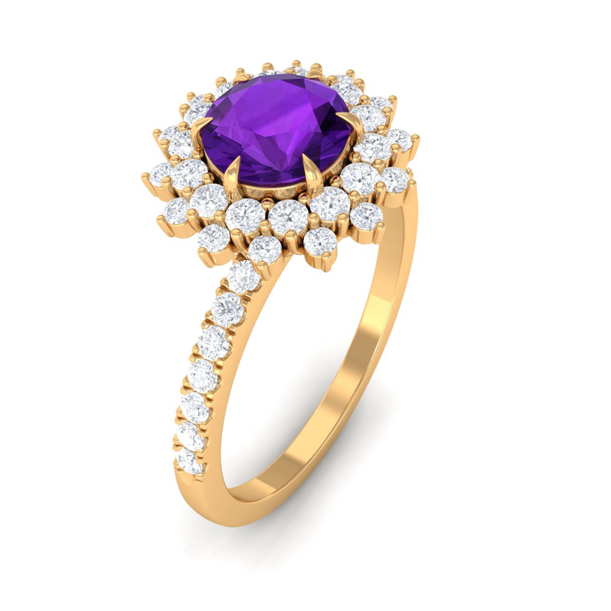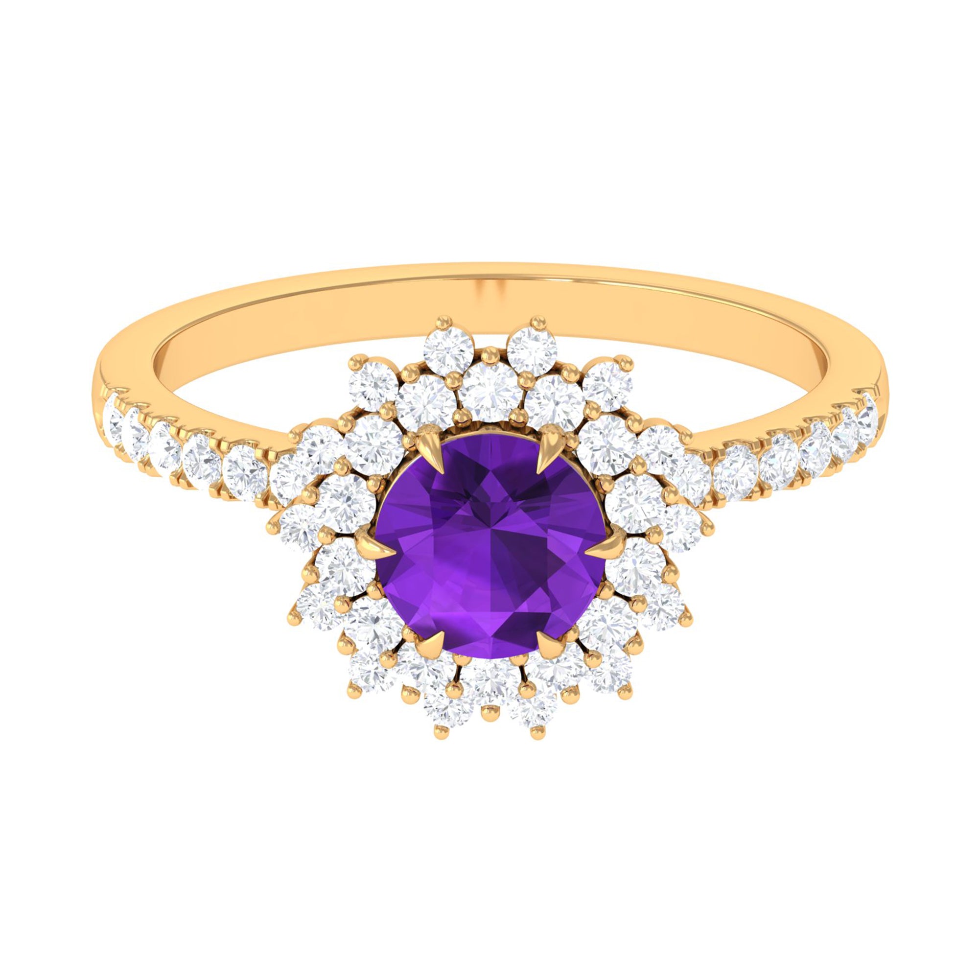 Make a bold statement with this round amethyst engagement ring. The center stone is surrounded by a dazzling cluster of moissanite gemstones, creating a halo effect that adds extra sparkle to the piece. The deep purple hue of the amethyst is both regal and sophisticated, making it the perfect choice for anyone who wants an engagement ring that stands out. The expert craftsmanship and attention to detail ensure that this ring is a true work of art, perfect for expressing your love and commitment to your partner in a unique and memorable way.
