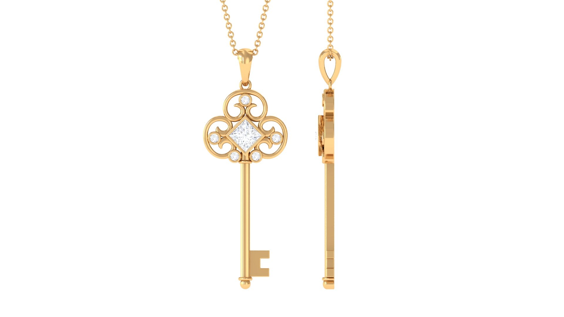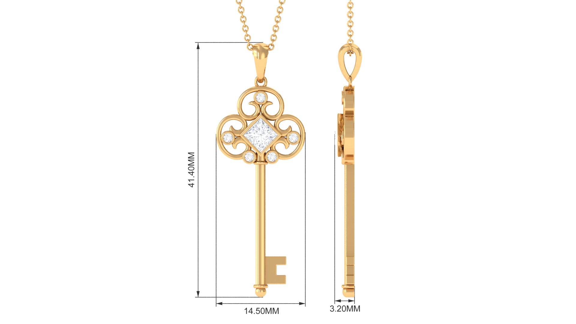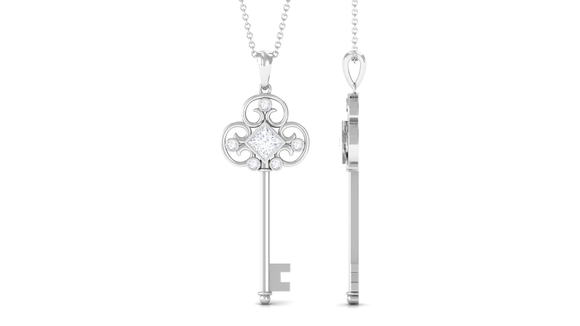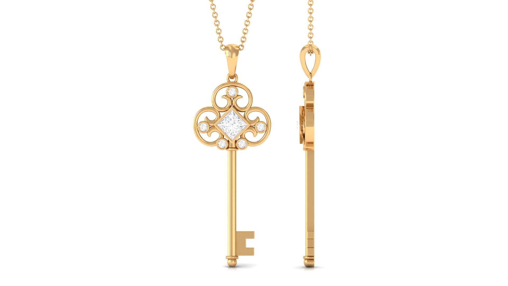 Round and Princess Cut Moissanite Key Pendant Necklace in Bezel Set