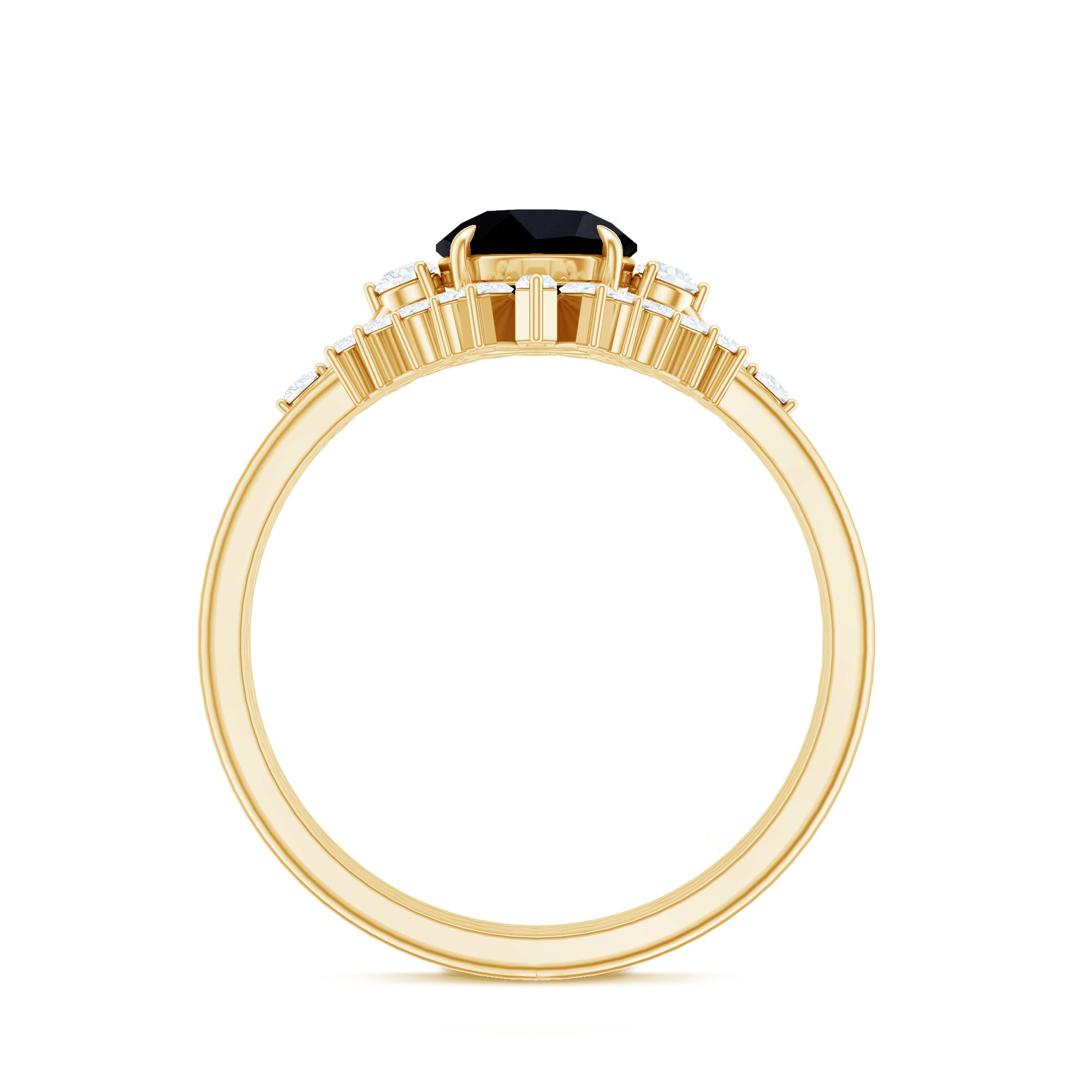 Celebrate your unique love story with this one-of-a-kind Engagement Ring Set. The center of the Black Spinel Engagement Ring is adorned with a Round Brilliant Black Spinel Solitaire held in a claw setting and accented with Round Cut Moissanite on both sides. The set also includes two Moissanite Ring Enhancers, which are embellished with Round and Baguette Cut Moissanite. All pieces in the set are crafted from Gold, making it a beautiful choice for the special woman in your life.