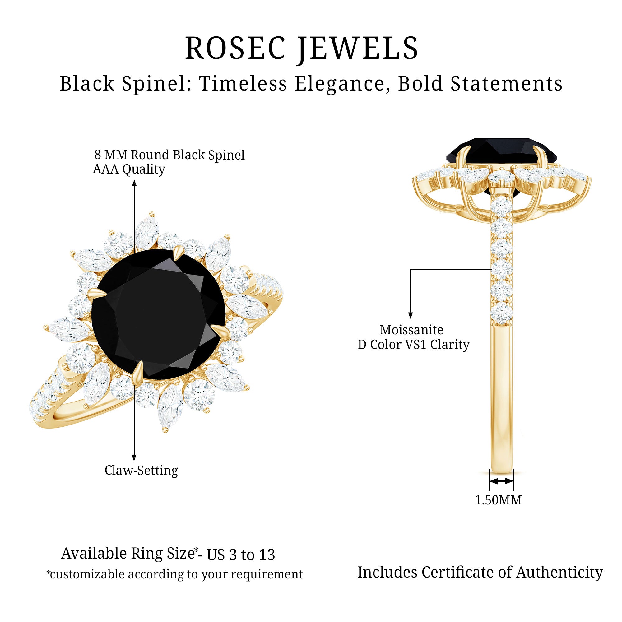 Round Black Spinel Statement Ring with Moissanite Floral Halo