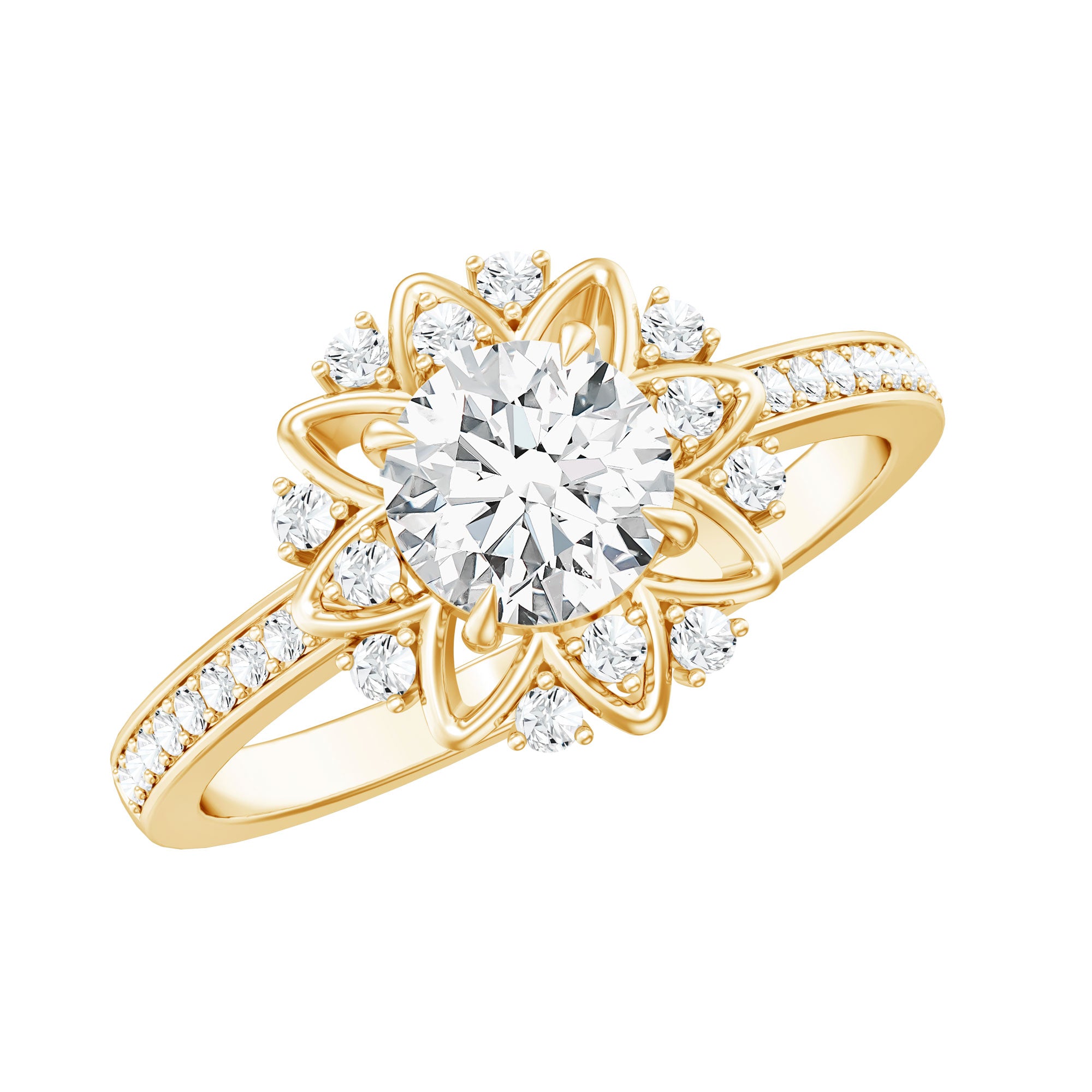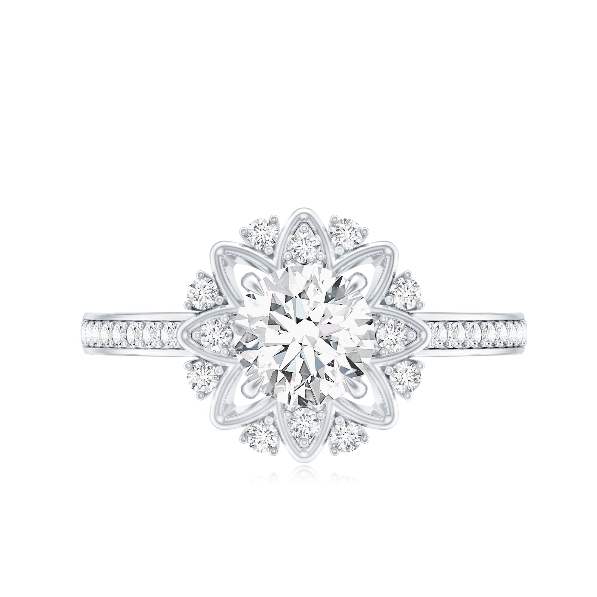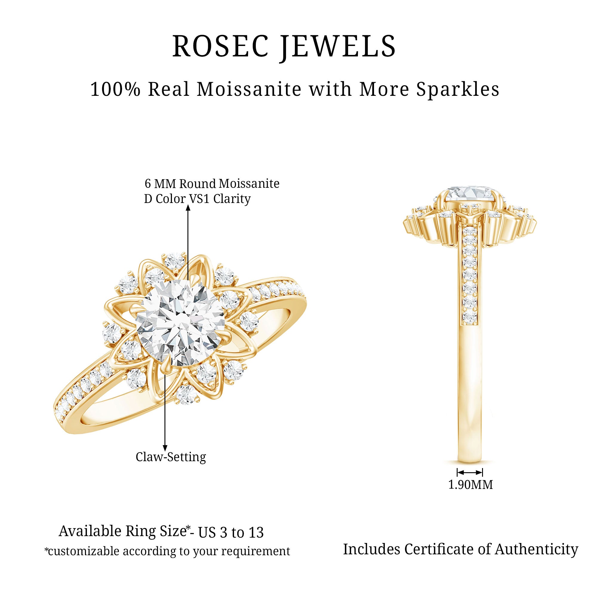 Inspired by the natural beauty of a blooming flower, this Moissanite Engagement Ring is designed to make love blossom with every glance. At the center sits a brilliant 6 MM round cut D-VS1 quality moissanite, held securely in claw setting. Surrounding the center stone is a stunning flower halo, made of smaller round moissanites, carefully arranged to mimic delicate petals. The artistic design adds shine and a romantic touch, making the Flower Engagement Ring feel truly one of a kind. Adding even more sparkle, moissanite side stones line the band, enhancing the overall brilliance. The slim band keeps the focus on the intricate flower design, while offering comfort and beauty from every angle. Perfect for engagements, proposals, or meaningful moments, the Moissanite Flower Ring symbolizes new beginnings, love, and growth. It is ideal for anyone who appreciates feminine style with a touch of nature-inspired charm. Made with care and D-VS1 quality moissanites, it offers a timeless look that is both ethical and stunning. Each piece arrives in a luxury jewelry box, ready to surprise and delight on any special occasion.