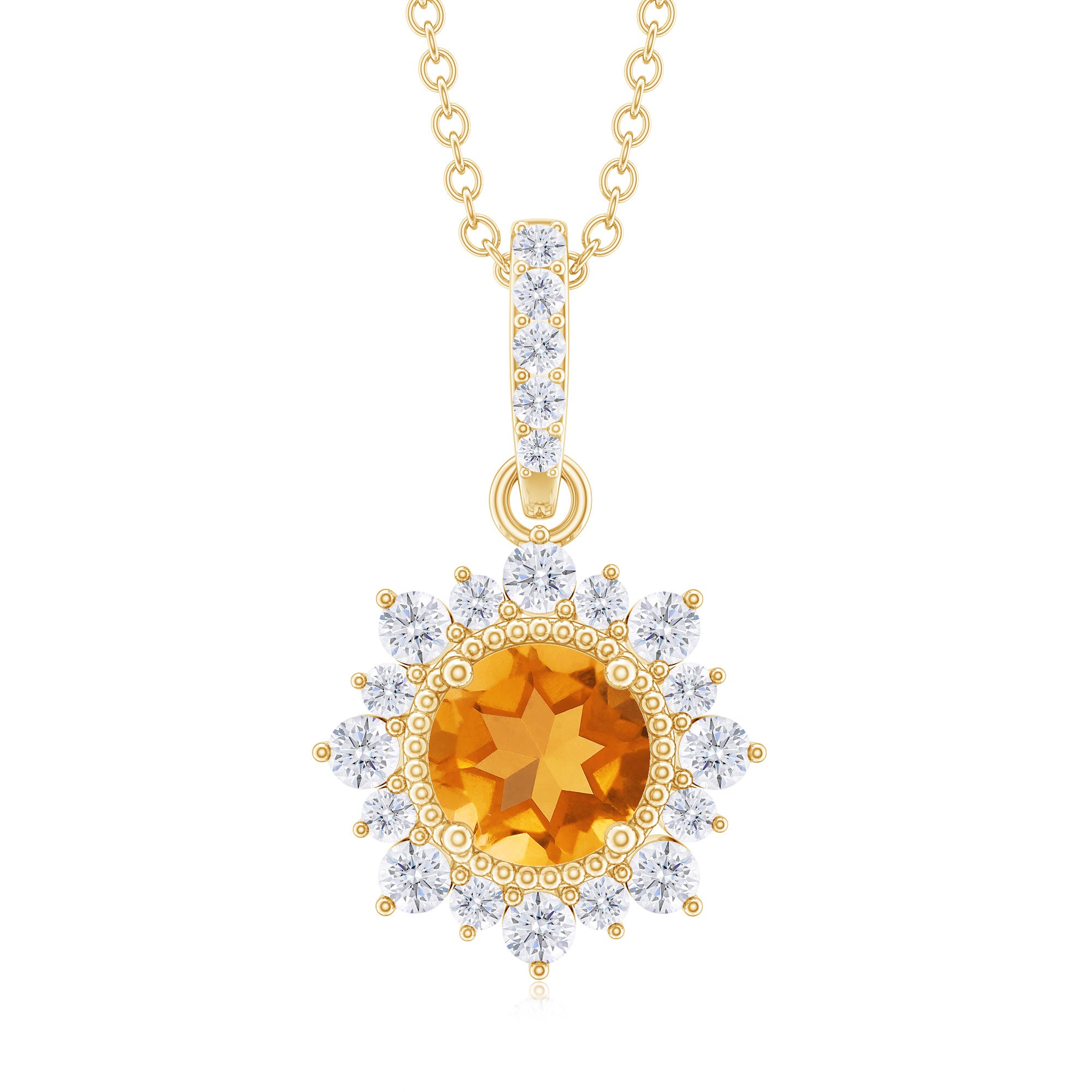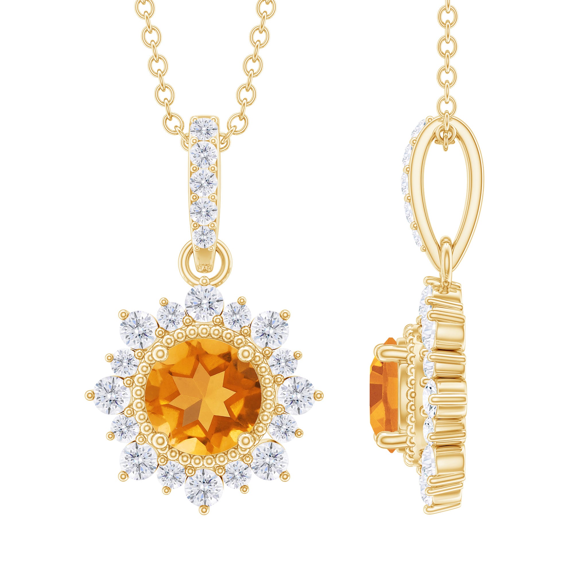 If youre searching for the perfect jewelry to wear on an evening date with your partner, look no further than this Citrine Pendant. Featuring a 7 MM Round Shape Citrine in a Prong Setting, with Gold Beaded Details and a Round Diamond Halo, this pendant necklace is simply stunning. The subtle yet elegant design will garner compliments when you wear it. With a total weight of 2 Carats and AAA Quality, this pendant is made with high-quality certified gemstones that undergo strict quality checks.