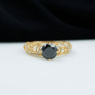 A charming Vintage Engagement Ring with a Round Shape Created Black Diamond solitaire in a diagonal 4 Prong Setting, accented by Round Diamond and gold beaded detailing on the shank. Made of Solid Gold.