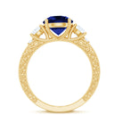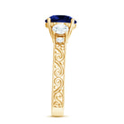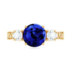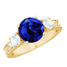 Featuring a round-shaped Created Blue Sapphire as the centerpiece solitaire and round moissanite stones set in a prong setting, this art deco engagement ring boasts a vintage-inspired design that is sure to captivate anyones heart. Crafted from gold, this engraved ring adds a touch of elegance and sophistication, resulting in a dazzling and eye-catching piece of jewelry.