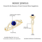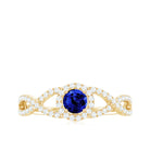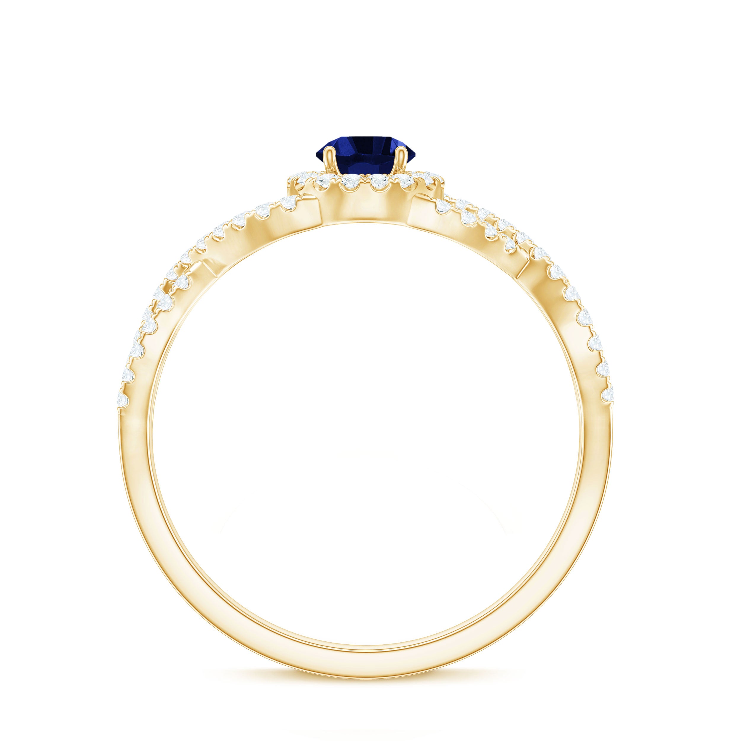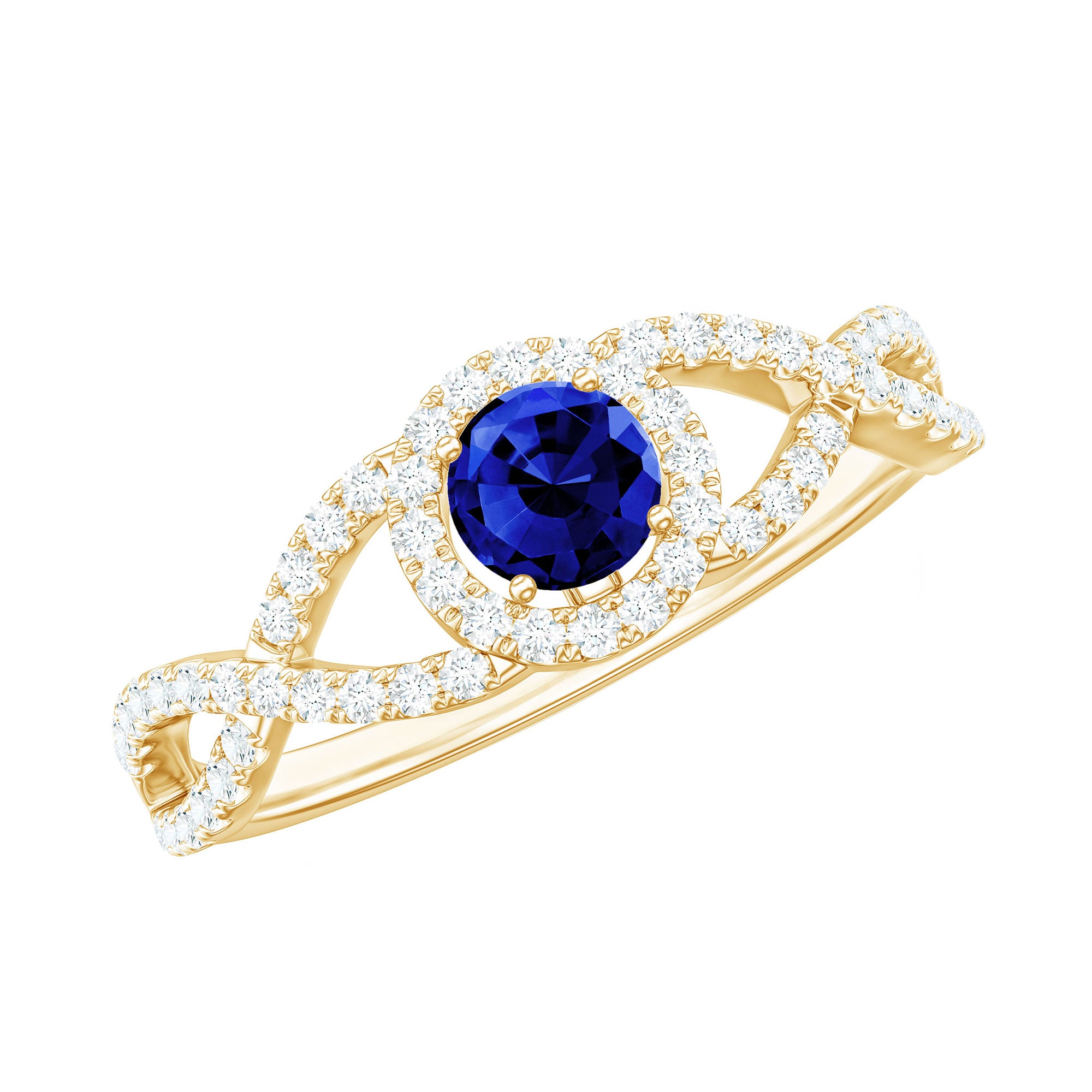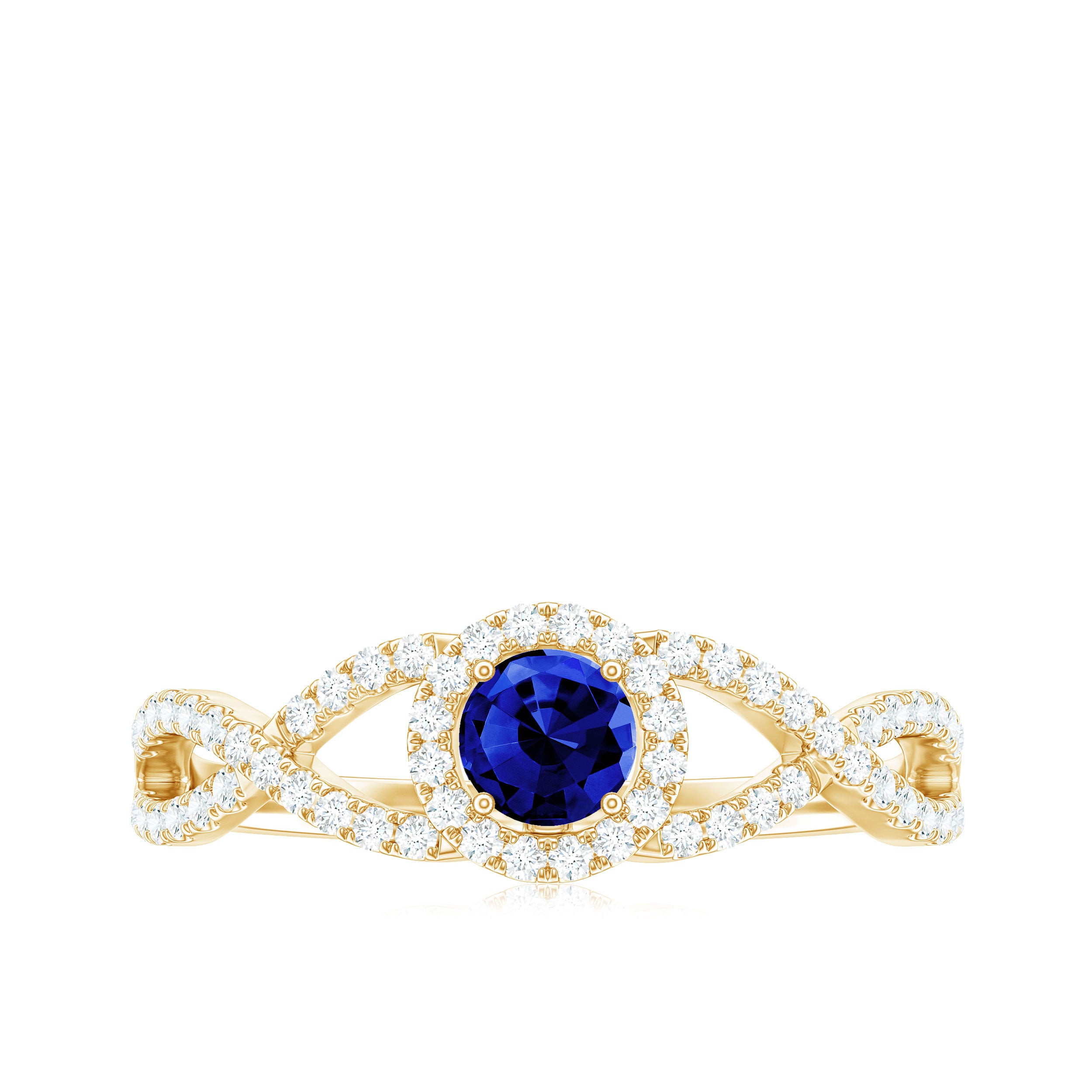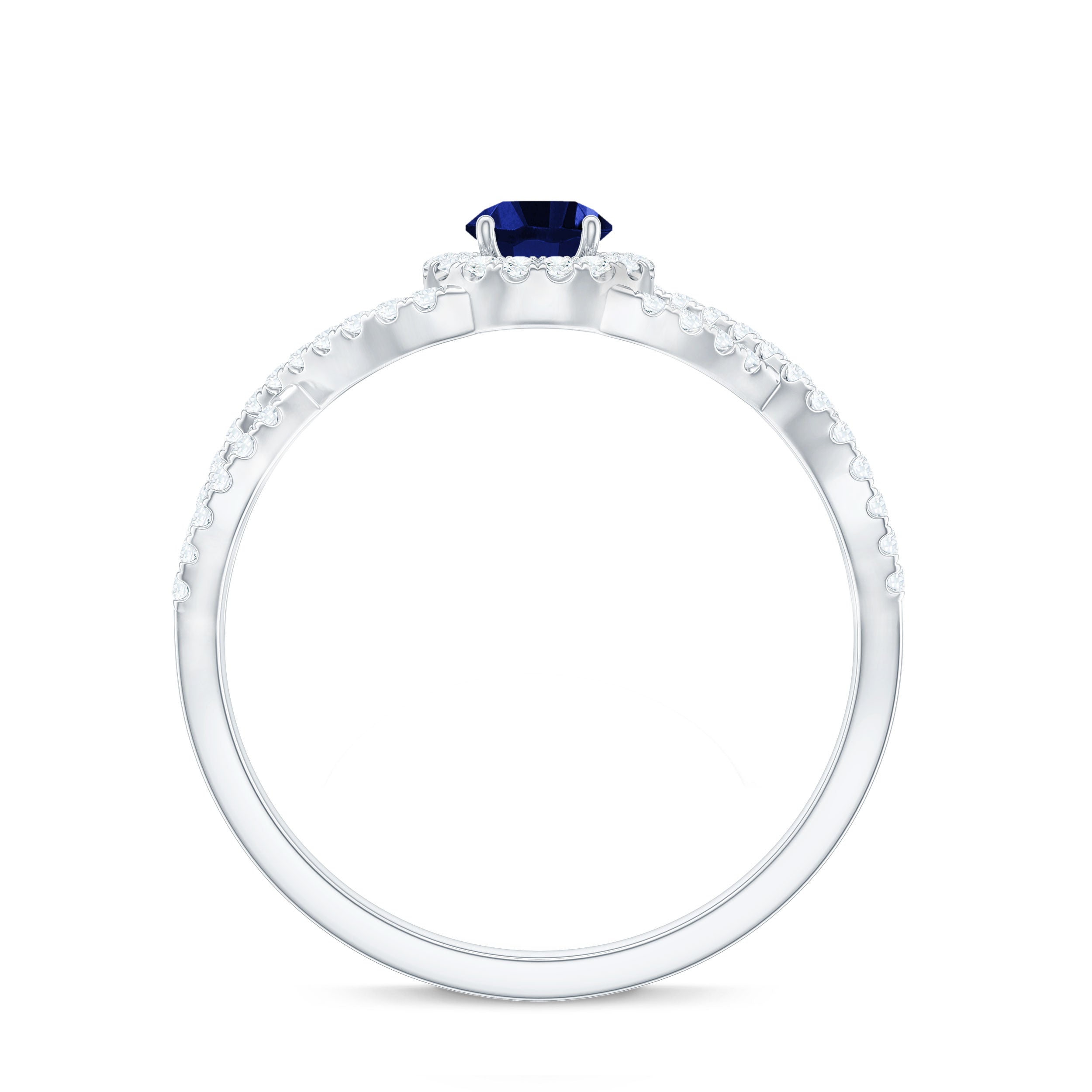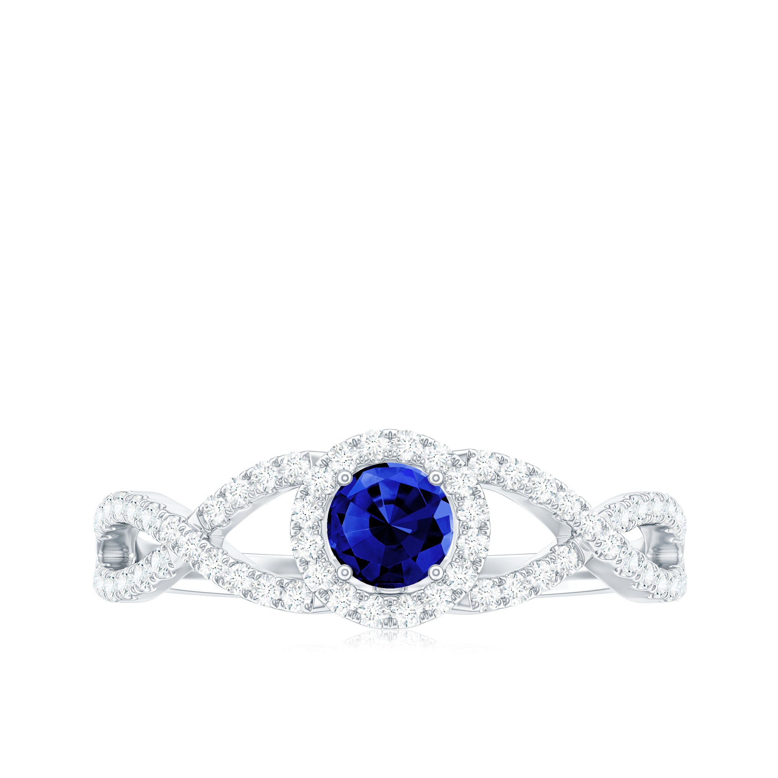 Round Created Blue Sapphire Crisscross Engagement Ring with Moissanite Halo
