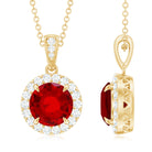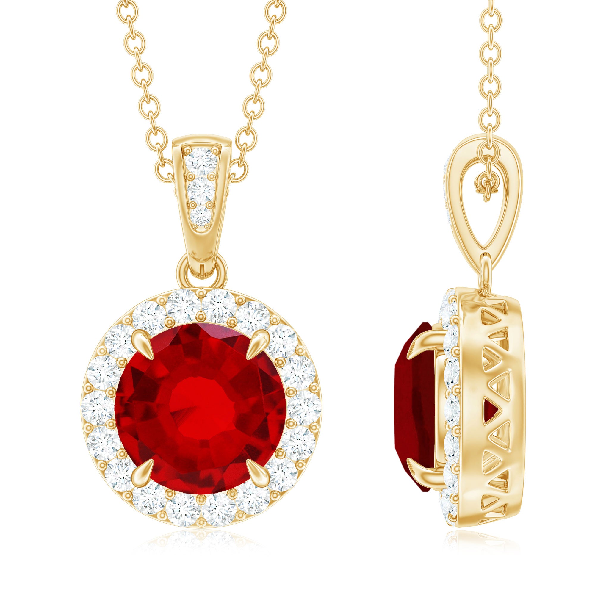 Elevate your style with this exquisite Halo Pendant Necklace, showcasing a brilliant Round Shape Created Ruby gracefully cradled in a Claw Setting, encircled by a shimmering Halo of Round Shape Diamond stones. The bail is elegantly embellished with additional round Diamond, adding a touch of sophistication. Whether you pair it with casual or dressy attire, this created ruby pendant is guaranteed to make you stand out with its undeniable allure and timeless charm.