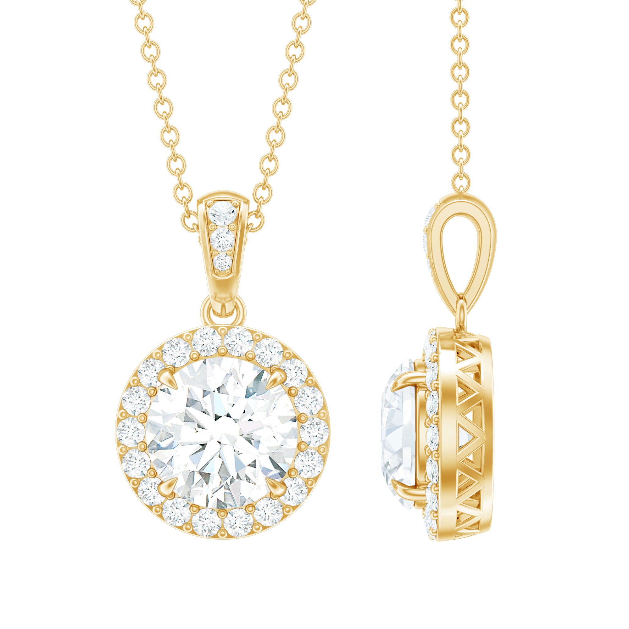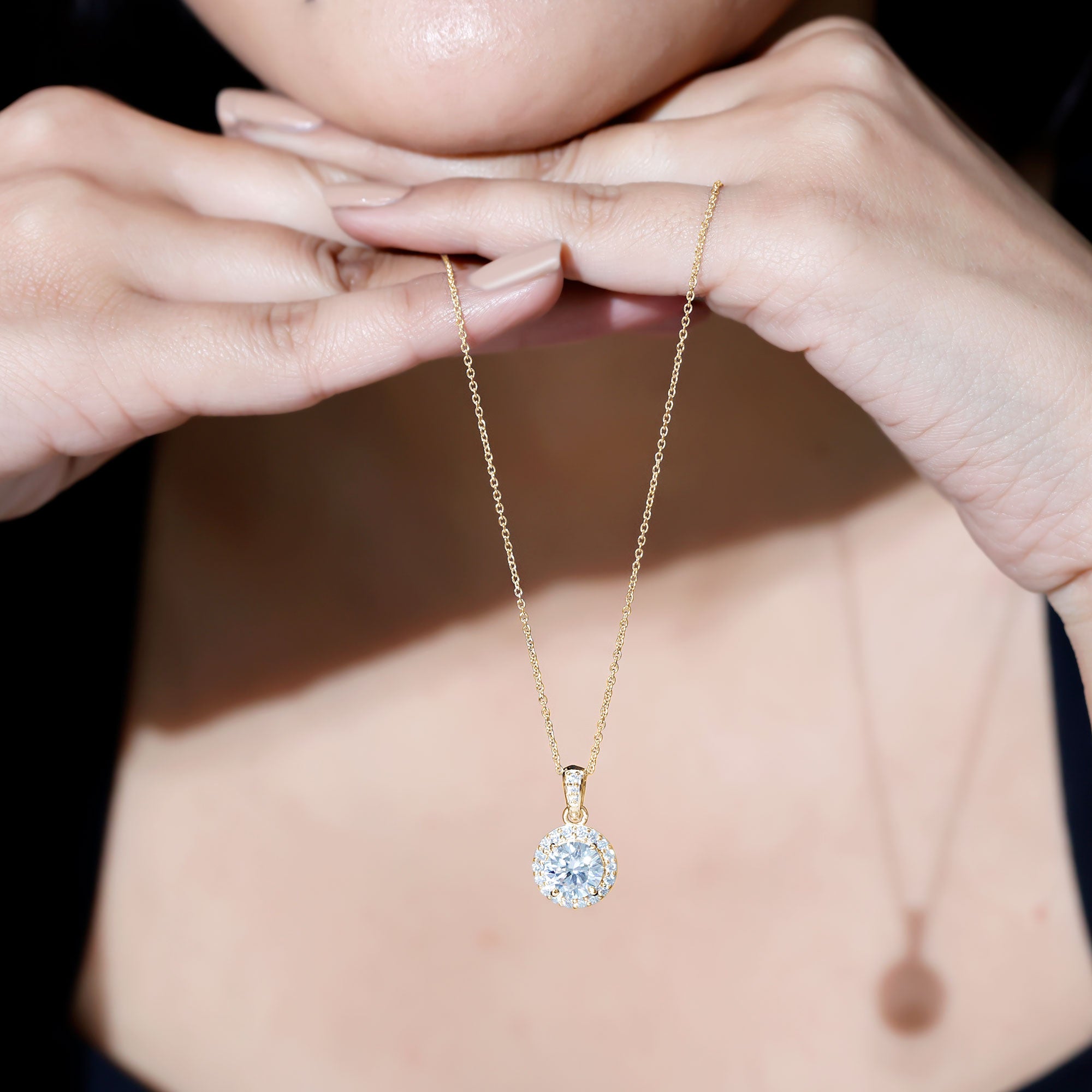 The combination of a round center stone and surrounding halo creates a pendant that feels both classic and visually striking.