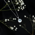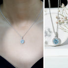 This Sky Blue Topaz Pendant embraces the beauty of the overall look, crafted with 14K White Gold Plated Silver. An 8 MM Round Shape Blue Topaz securely placed in Claw Setting encircled with a small Moissanite stone, accentuated with a Standard Bail that is studded with Diamonds. This Round Pendant dangles in a cable chain, which allows the adjustment according to your choice. The Halo Pendant beholds an adorable shine of AAA Quality Sky Blue Topaz, which makes the pendant perfect to be paired with an outfit for a special occasion.