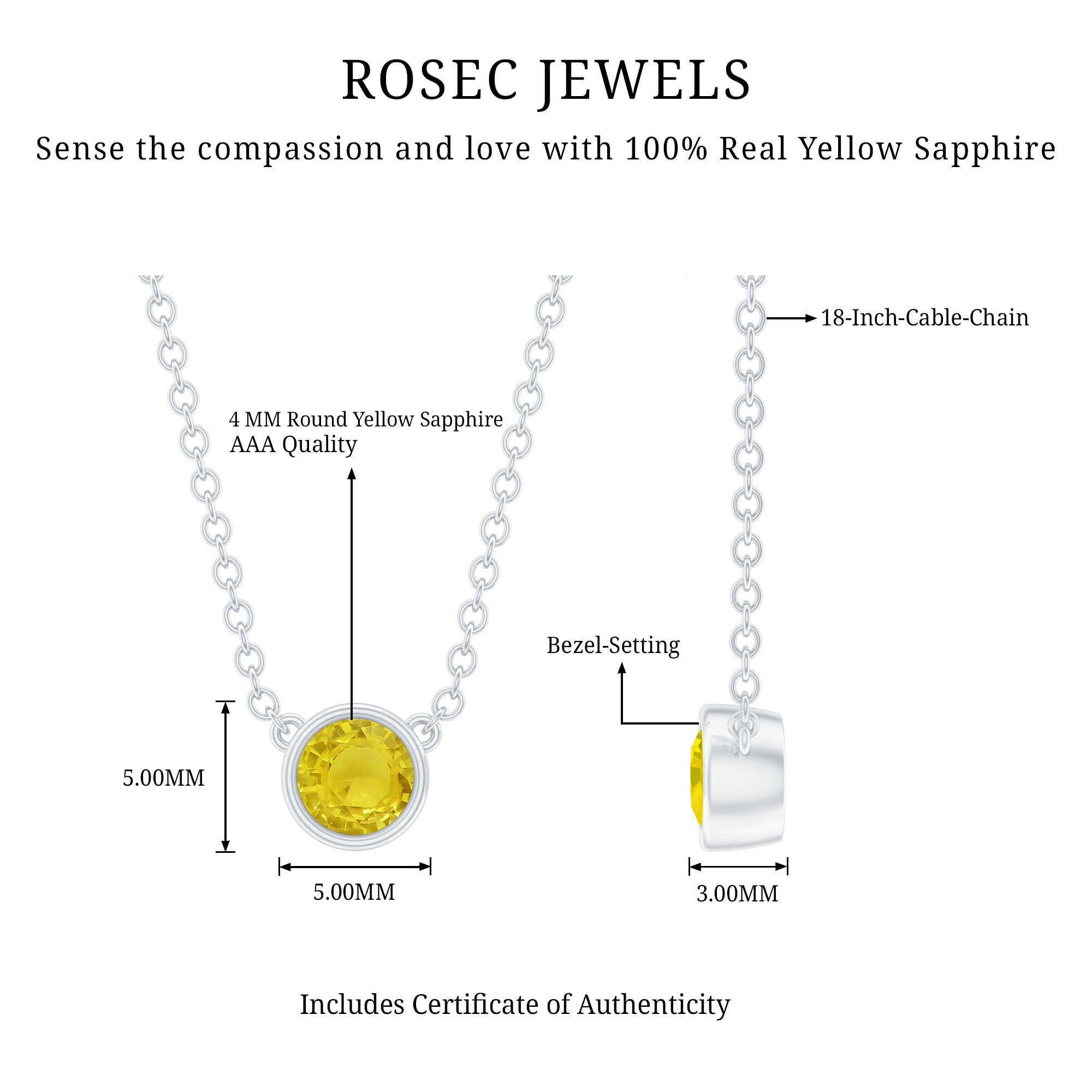 This Yellow Sapphire Pendant is handcrafted precisely to adorn your neckline. It features a 4 MM Yellow Sapphire securely placed in a Bezel Setting. This Round Pendant beholds the classic shine of AAA Quality Yellow Sapphire. This Bezel Set Pendant is perfect to complete your looks for day outings. The pendant will be delivered to you in a signature jewelry box for further storage.