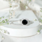Celebrate your love with this stunning Black Onyx Bridal Set, thoughtfully designed to blend modern elegance with timeless charm. The centerpiece of the engagement ring is a bold 8 MM round cut black onyx, securely held in a double prong setting. Adding a touch of sparkle, a delicate halo of shimmering moissanite stones surrounds the deep black center stone and continues gracefully along the band, giving the ring a sophisticated yet striking look. Perfectly paired with the engagement ring is a matching stackable wedding band, featuring a row of round moissanite stones. This sleek band is designed to sit flush beside the engagement ring, creating a seamless and stylish Black and White Wedding Set. Whether worn together or separately, each ring stands beautifully on its own while also complementing the other. Made for everyday comfort and lasting elegance, this Halo Bridal Ring Set is available in a variety of sizes to ensure the perfect fit. Carefully crafted with attention to detail, the Engagement Ring with Wedding Band Set arrives in a lovely jewelry box, ready to be gifted for a proposal, wedding day, or special occasion. Both the AAA quality onyx and D-VS1 quality moissanite stones are hand selected for high quality, and the Round Bridal Set includes a certificate of authenticity for peace of mind.