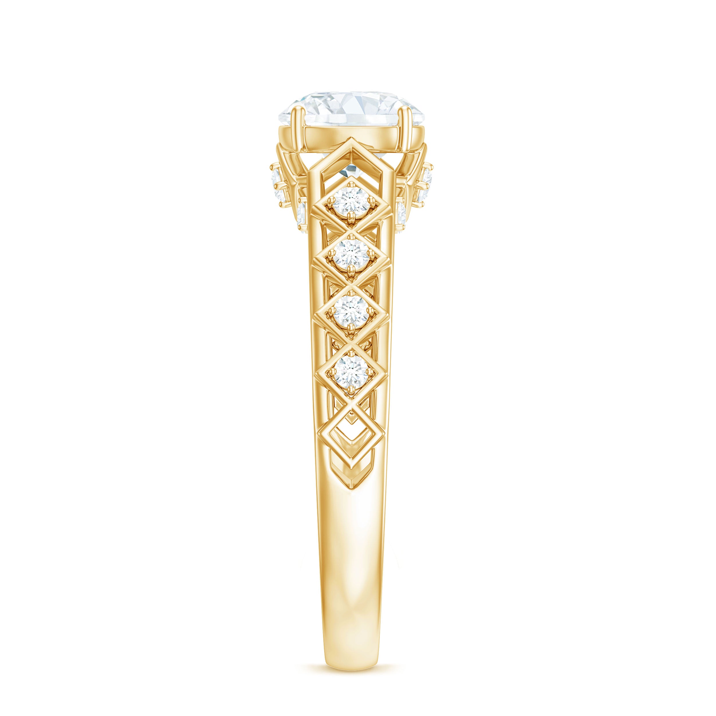 A Vintage Moissanite Engagement Ring for the couples that are all about old-school gestures of love! Boasting of sparkles, it features a Single Stone of Round Cut Moissanite that steals all the attention. Inspired by abstract Art Deco patterns, this Engagement Ring looks like a true piece of art that is beautified by side-stones of Round Cut Moissanite.