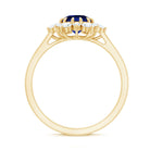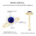 This elegant gold engagement ring features a round-cut Created Blue Sapphire at its center in a claw setting, surrounded by a dazzling halo of moissanite stones. The stunning Created Blue Sapphire and sparkling moissanite combination make for a truly striking design, perfect for any woman who loves classic, timeless pieces. This Created Blue Sapphire engagement ring is a beautiful choice for anyone seeking a stylish and sophisticated way to show their affection and appreciation.
