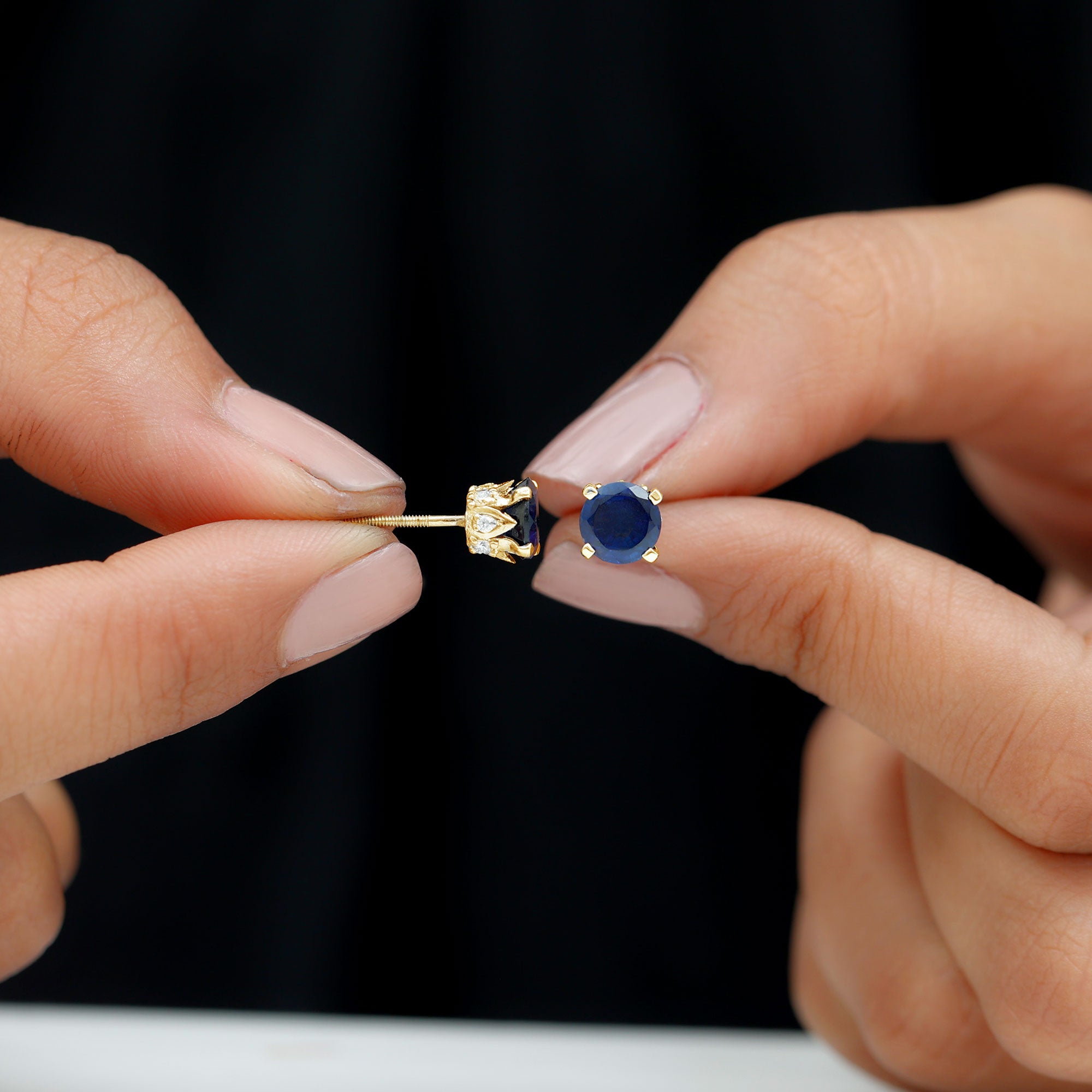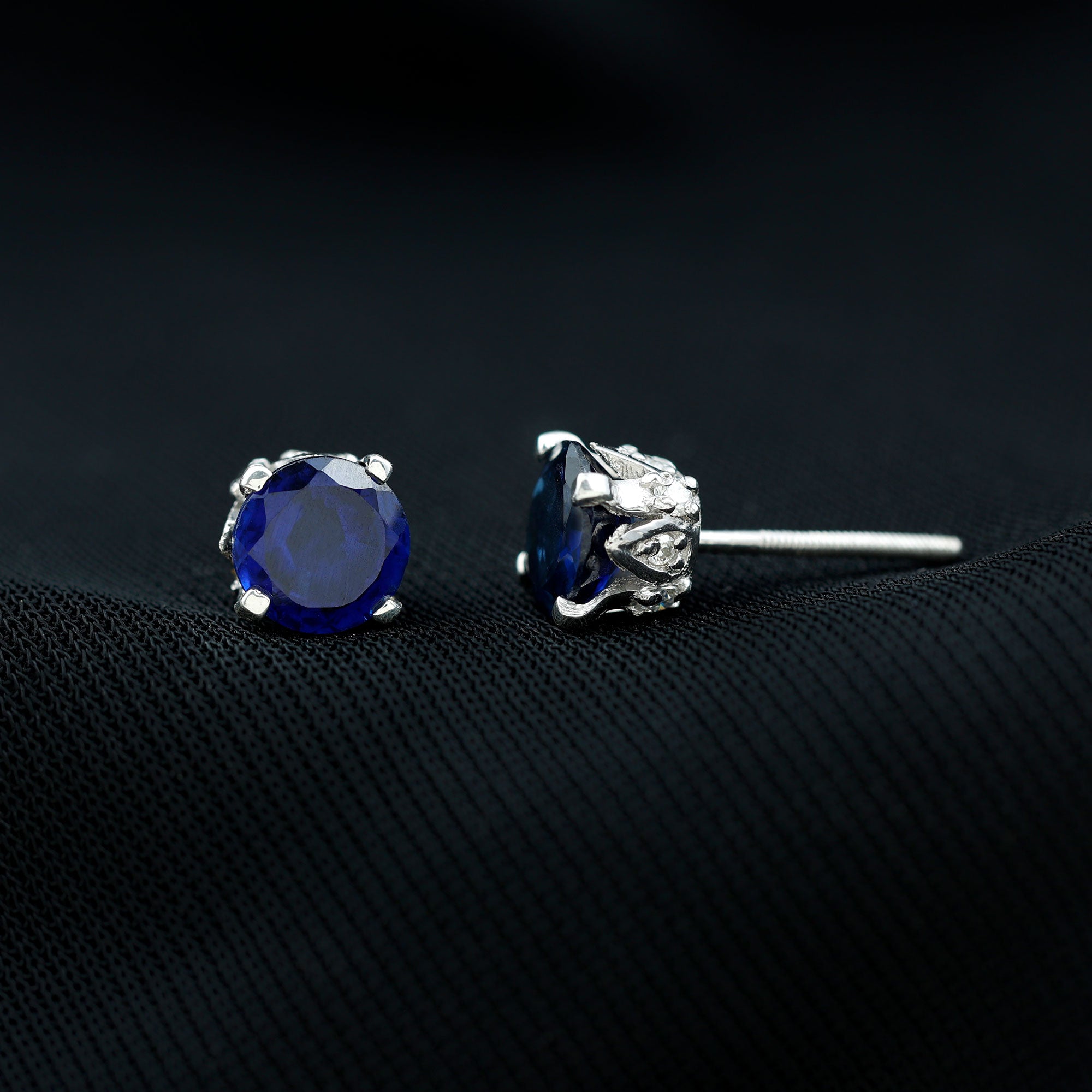 Royal sophistication meets everyday elegance in these Lab Grown Blue Sapphire Earrings, designed to bring a touch of timeless charm to any look. Each earring features a 6 MM round cut lab grown blue sapphire, set in a delicate crown setting, accented with tiny moissanite stones that enhance the sapphire’s sparkle and brilliance from every angle. The crown design adds a subtle regal touch, giving the Solitaire Stud Earrings a vintage inspired elegance while keeping the overall look modern and wearable. The secure screw back closures ensure a comfortable and reliable fit, allowing you to wear them confidently throughout the day. These Blue Stone Earrings are versatile, perfect for everyday wear, office settings, or special occasions where understated sophistication is desired. The rich blue hue of the sapphires pairs beautifully with any outfit, making them a classic addition to any jewelry collection. Handcrafted with precision, they also make a thoughtful gift for someone special, conveying elegance, style, and timeless charm. Designed with both beauty and practicality in mind, these Crown Stud Earrings are a lasting statement of grace, color, and craftsmanship.