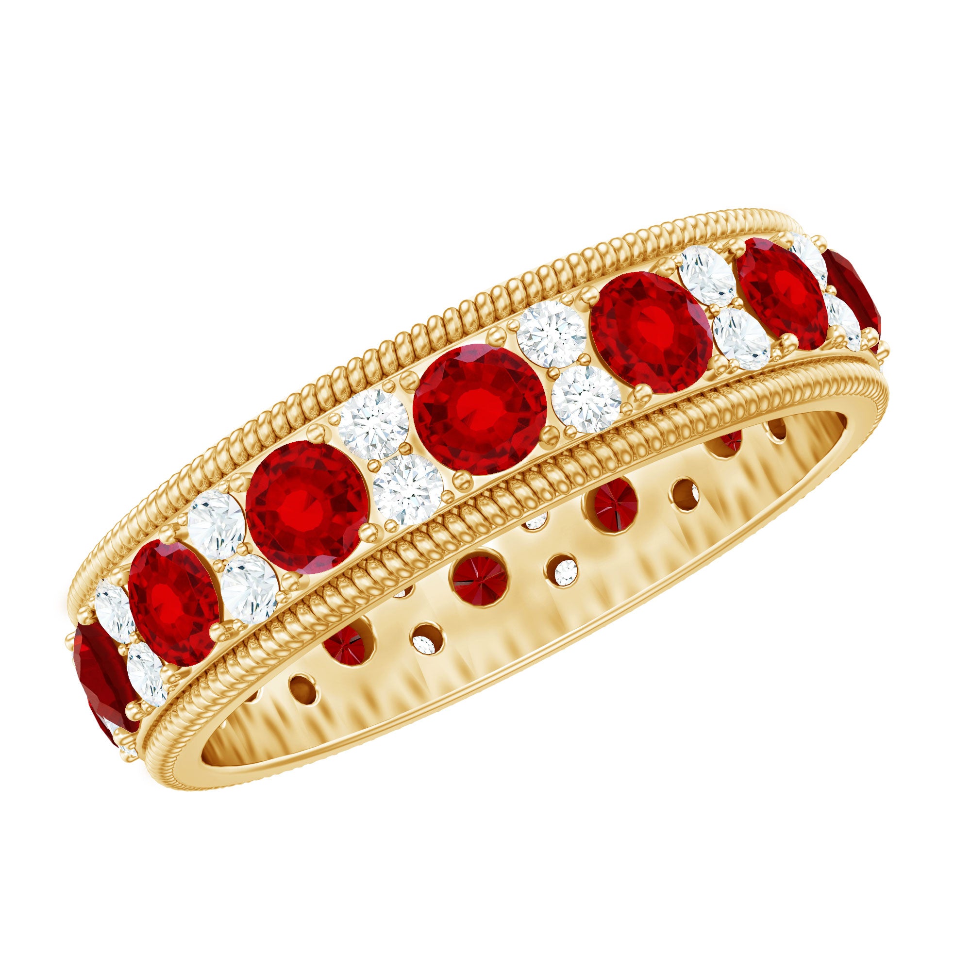 Feel like a queen with our Gold Rope Band Ring featuring Round Cut Created Ruby and Moissanite set in Prong Setting. This Eternity Ring is composed of Solid Gold.