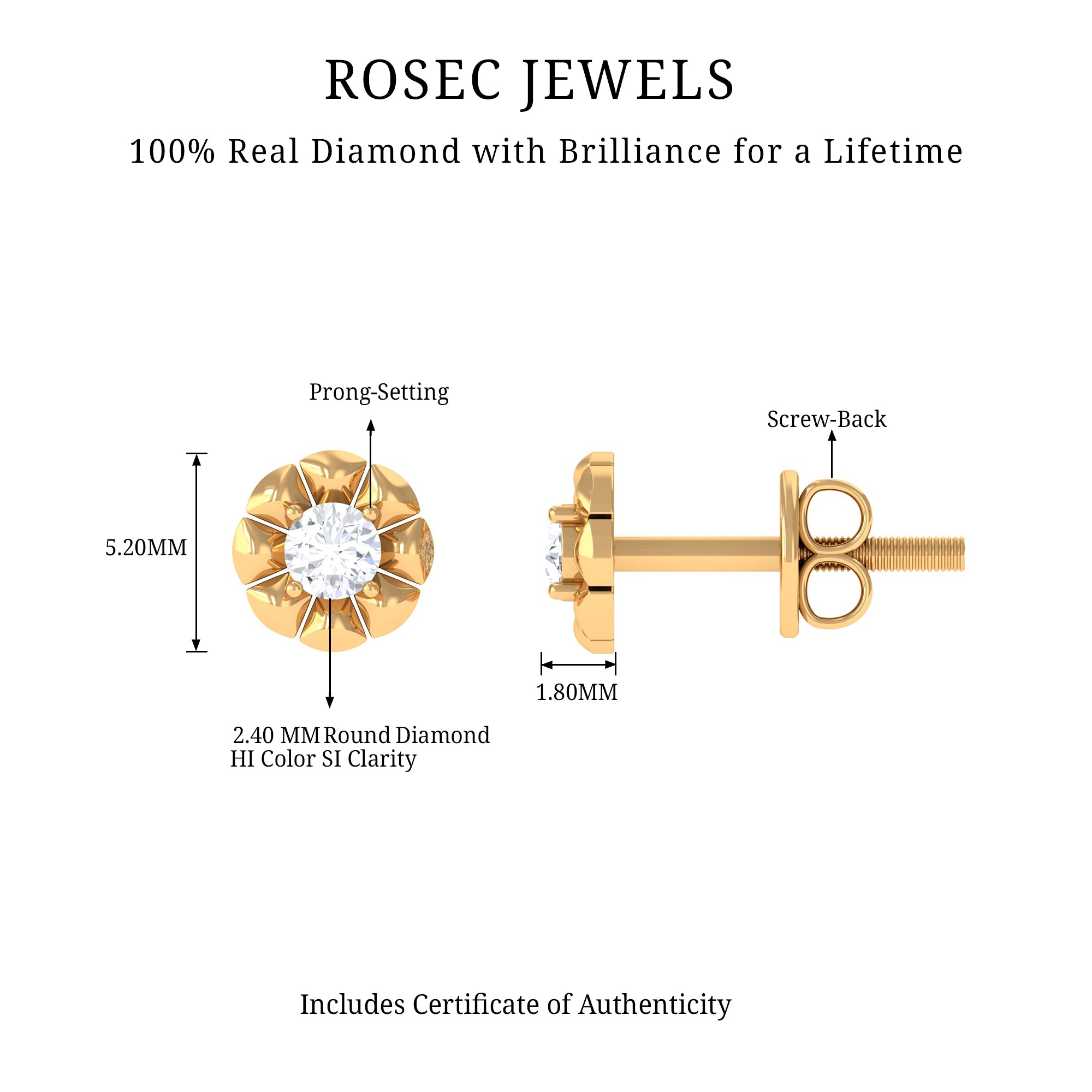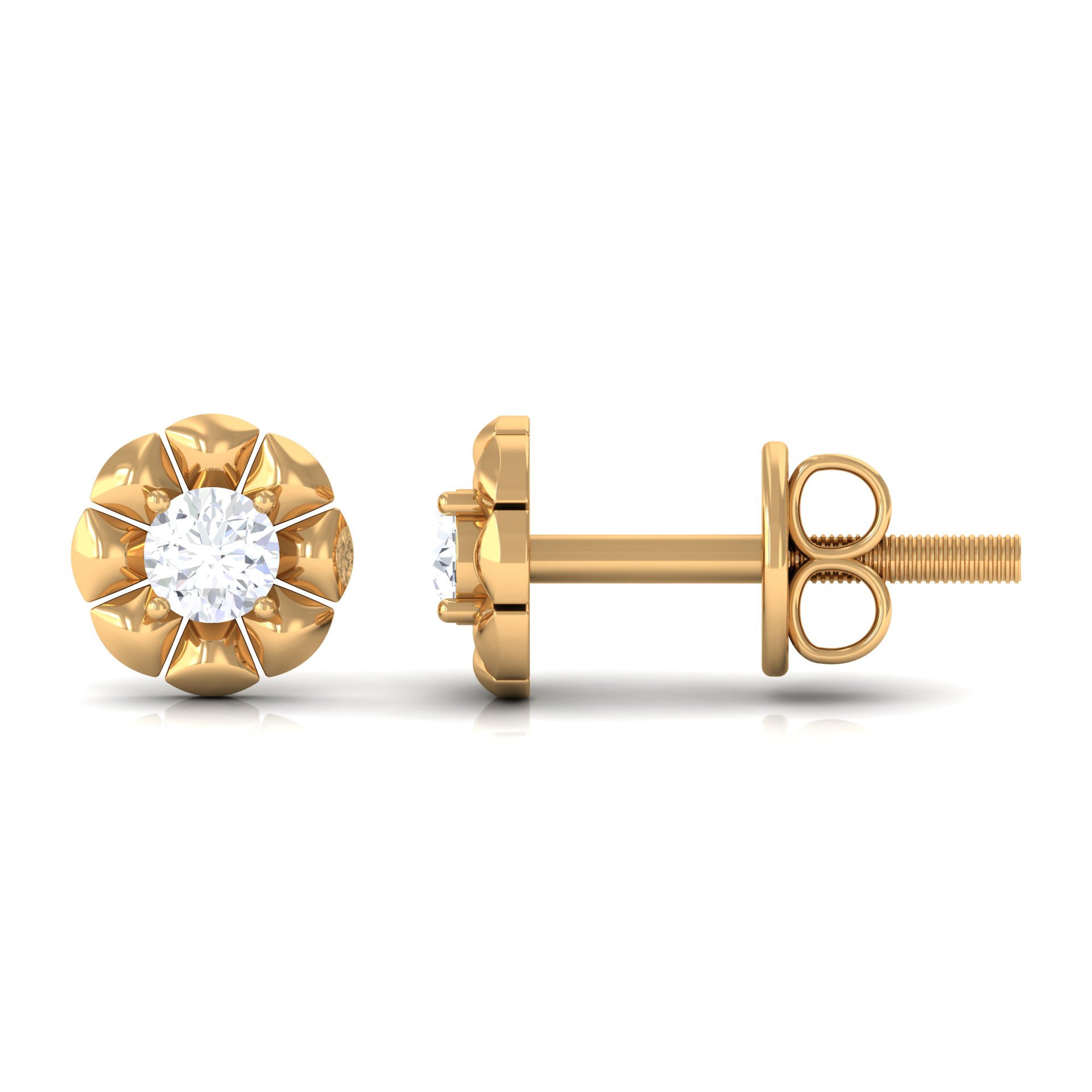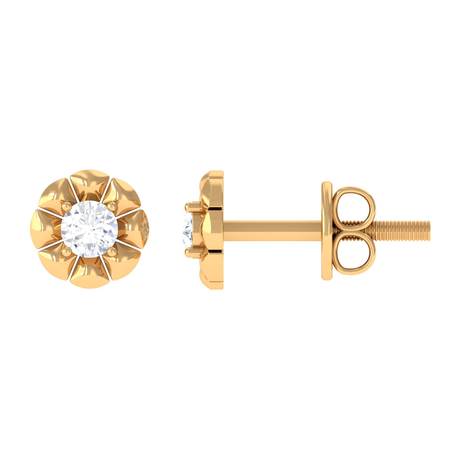 To mark a classic style statement here is the Diamond Stud Earring. This flower earrings are adorned with round-shaped diamonds in the prong setting which is decorated with metal petals making it a beautiful flower. These earrings embellished with HI-SI Diamond make it eye catchy. These Diamond Flower Earrings are classic and elegant which makes it perfect to be gifted on Valentines Day. The Floral look of these Nature Inspired Earrings represents the love and care you have.