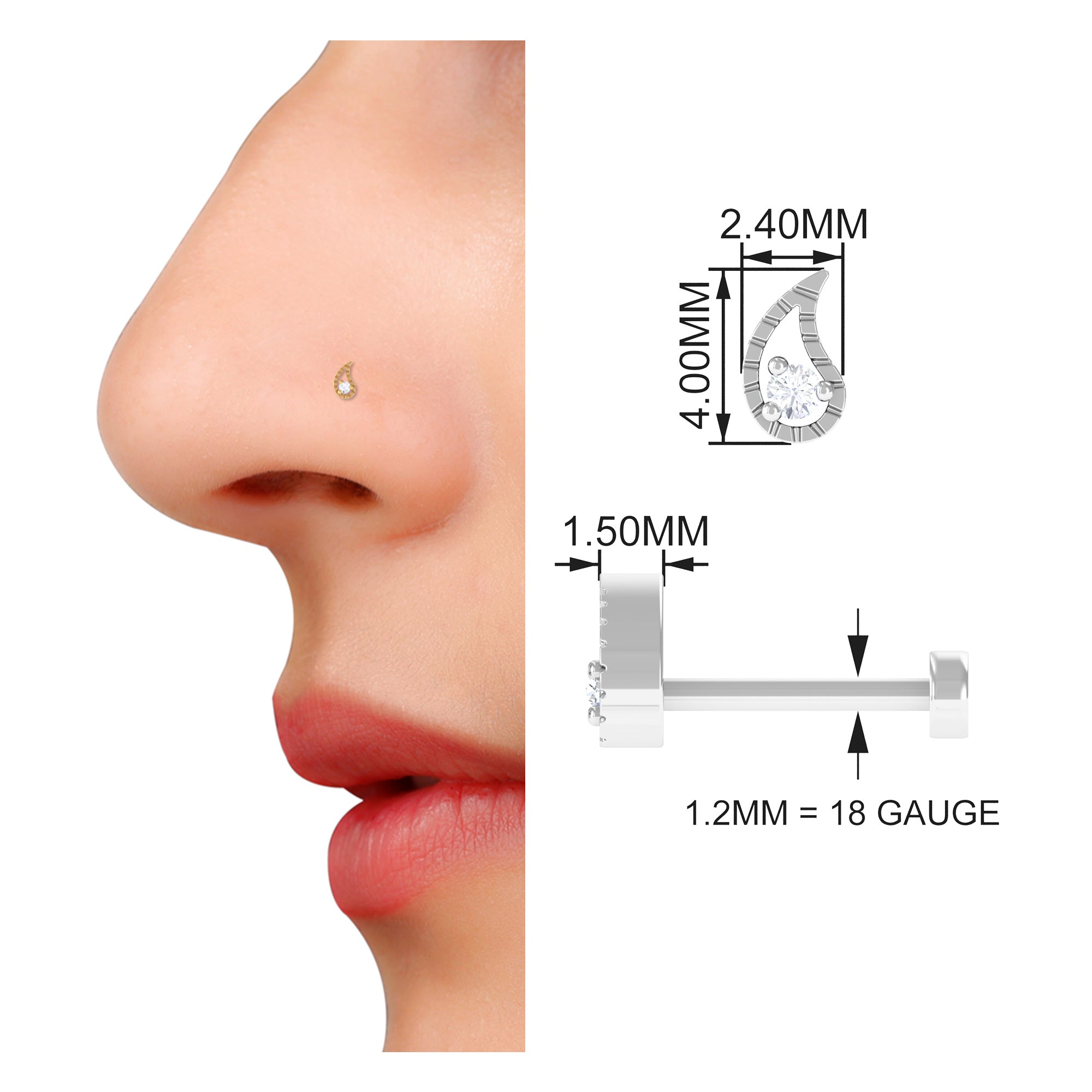 Unleash your unique style with this exquisite Leaf Nose Stud crafted in a distinctive shape and adorned with a Round Cut Diamond in a secure Prong Setting. Made of high-quality Gold, this Nose Stud is the perfect accessory for those looking for a unique and elegant piece of Body Jewelry. The timeless design of the Leaf Nose Stud adds a touch of nature-inspired charm to your overall look, making it a versatile piece that can be worn on any occasion. Elevate your style with this one-of-a-kind Leaf Nose Stud and experience the perfect combination of elegance and sophistication.