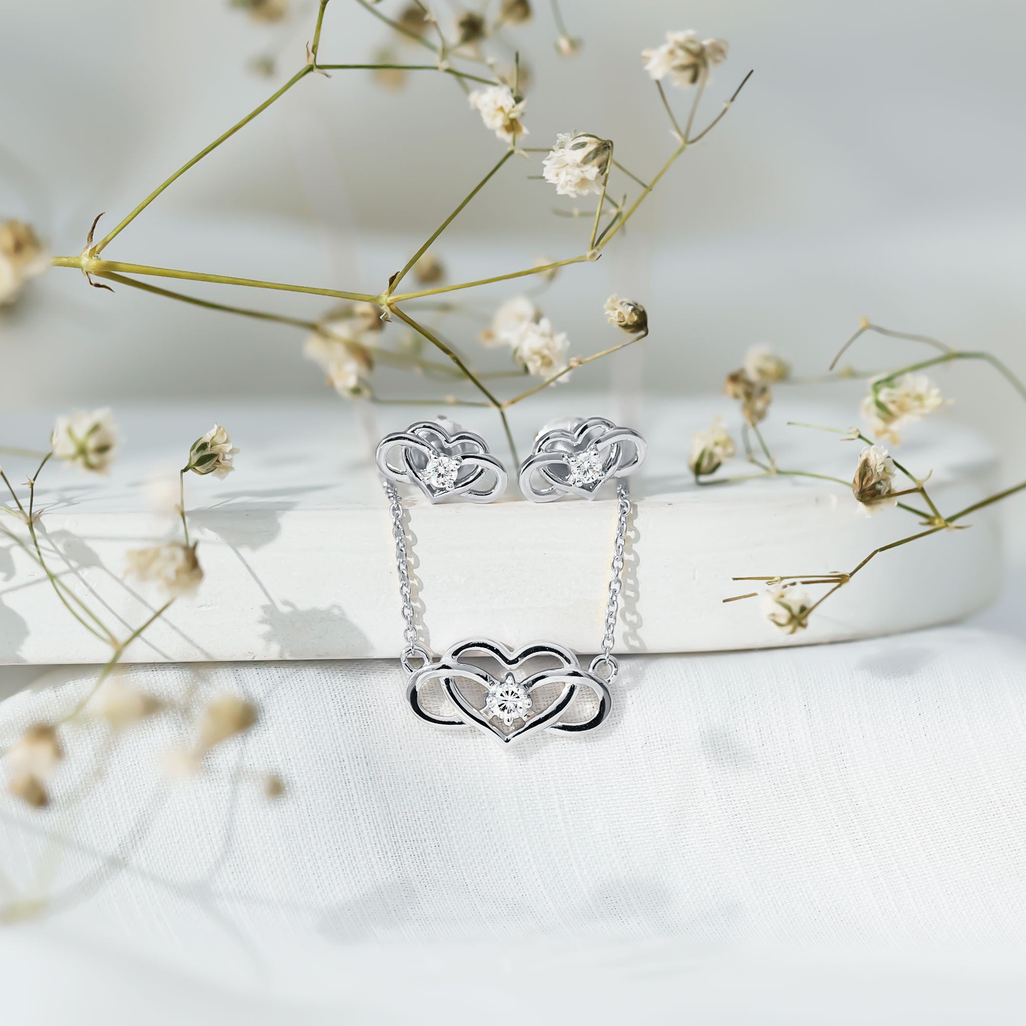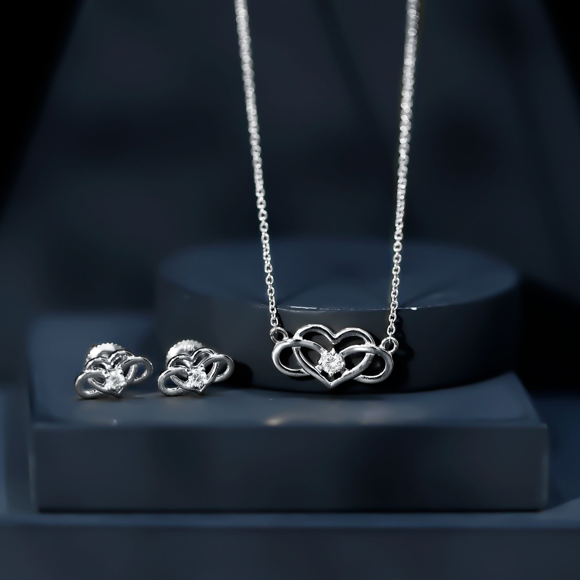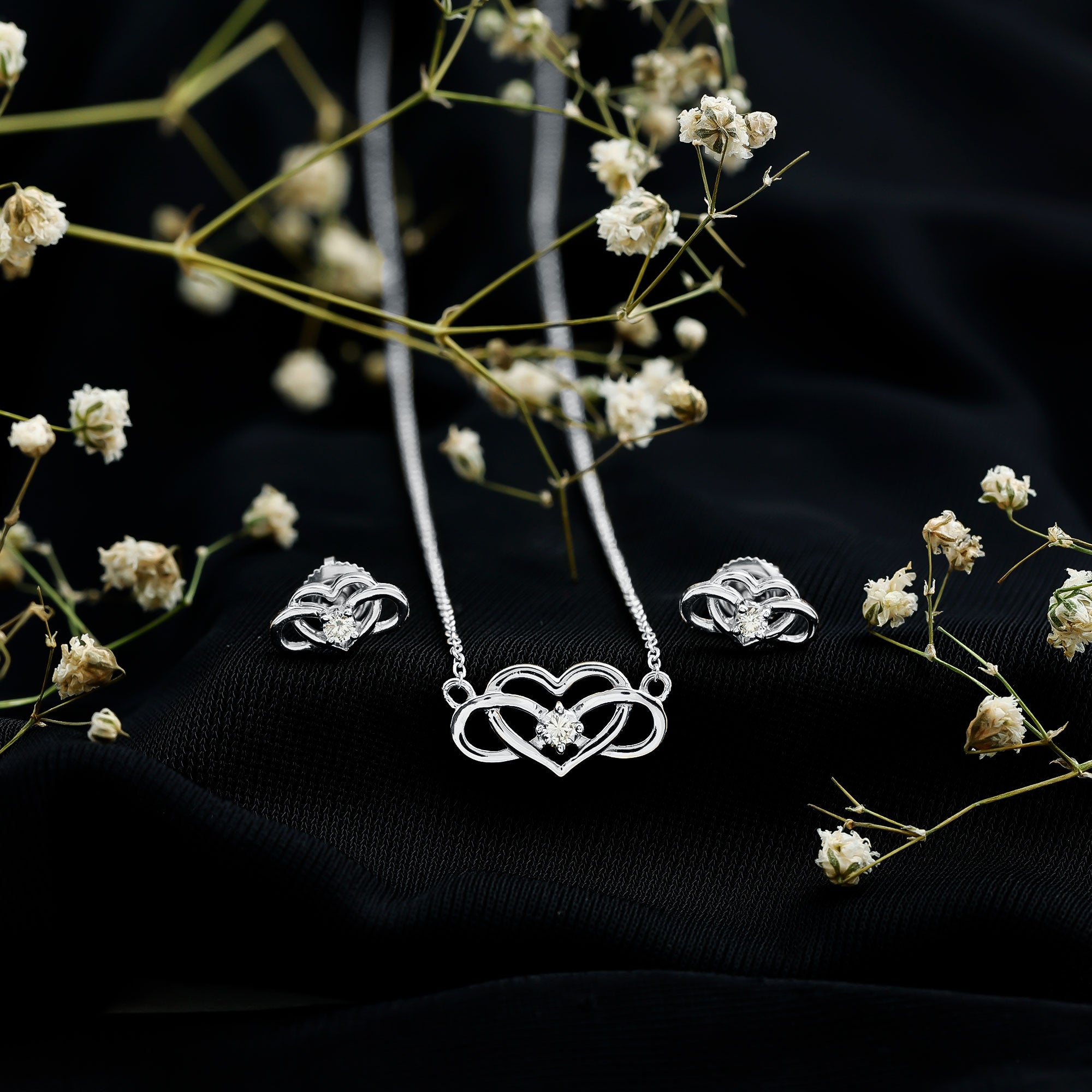 Symbolising the union of two people, this Infinity Heart Necklace and Earrings Set is a meaningful and nostalgic choice, with its minimalistic beauty. Unique style and design, this Pendant and Earrings Set carries the message of limitless, balance and endless love for all. The graceful, dainty heart charm with the exquisitely detailed infinity symbol, having a Round Diamond that scintillates from the center of the Diamond Necklace Set with Earrings. This Matching Jewelry Set has an unending and eternal reminder, which is a token of affection. Crafted with meticulous attention to detail, the Pendant is attached to chain and the earrings are secured with Screw back closures. The sideways figure eight representing endless resting on the heart design having an aesthetic look that evokes emotions. Whether you are dressed for formal events or in casual, infinity jewelry pieces are a swift, classy and stylish way to give yourself that extra sparkle. Also, a perfect Valentines Day present, or celebrating milestones.