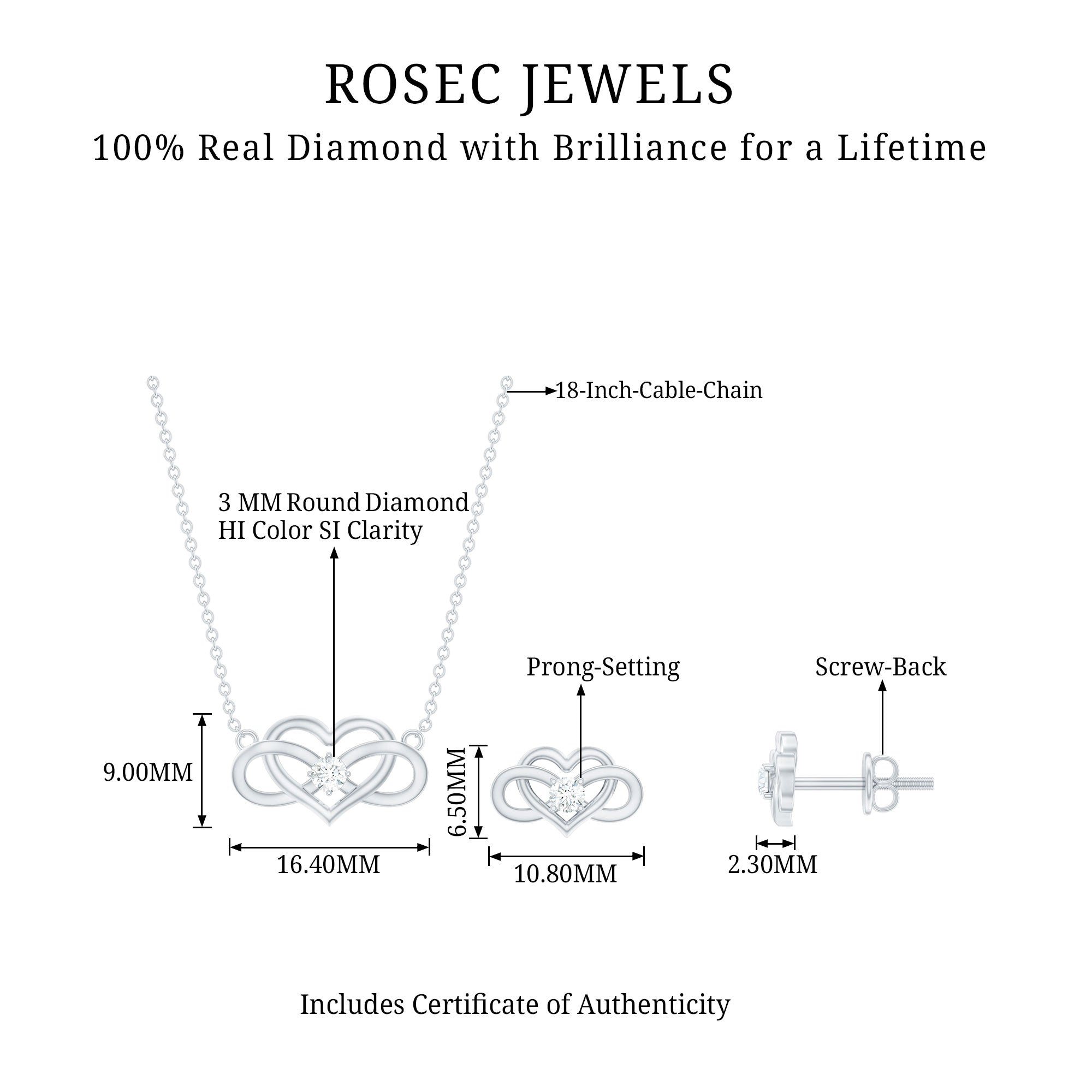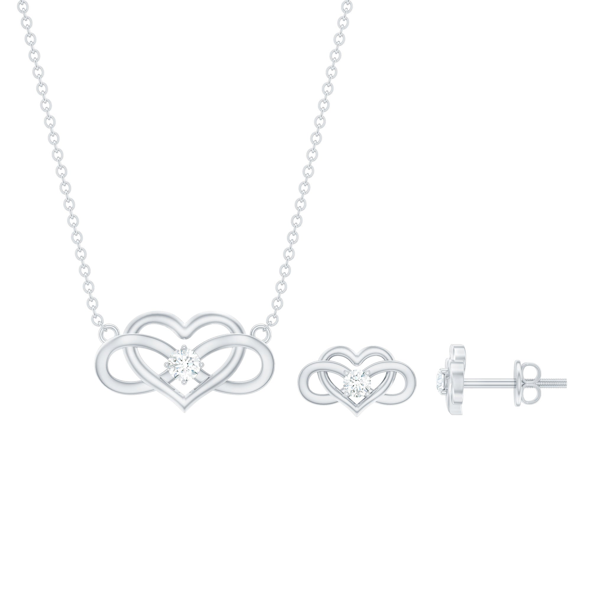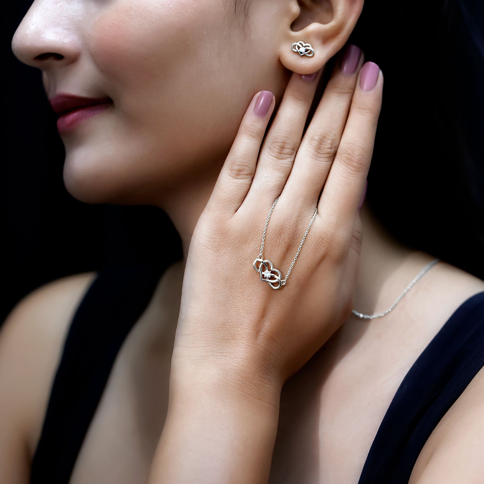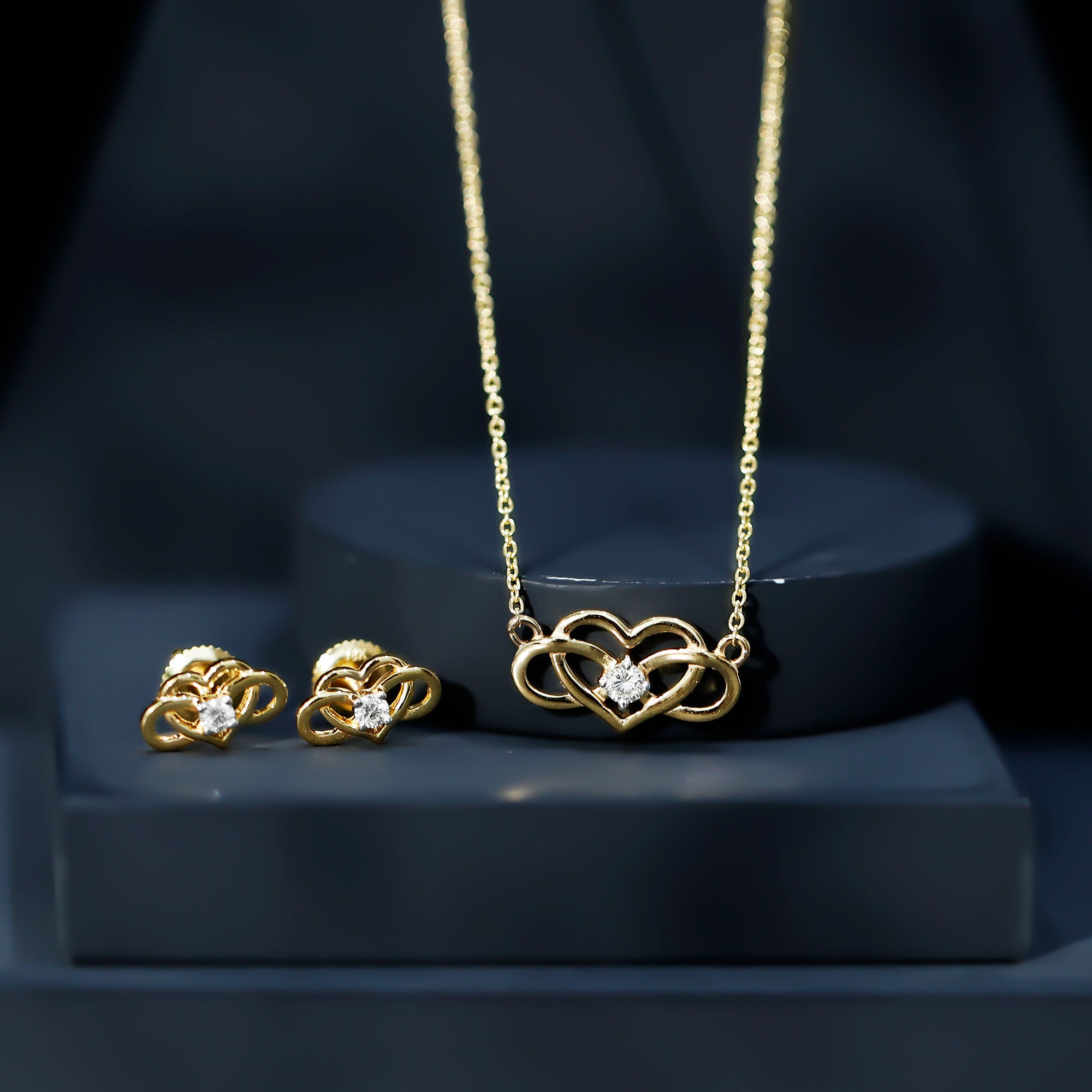 Symbolising the union of two people, this Infinity Heart Necklace and Earrings Set is a meaningful and nostalgic choice, with its minimalistic beauty. Unique style and design, this Pendant and Earrings Set carries the message of limitless, balance and endless love for all. The graceful, dainty heart charm with the exquisitely detailed infinity symbol, having a Round Diamond that scintillates from the center of the Diamond Necklace Set with Earrings. This Matching Jewelry Set has an unending and eternal reminder, which is a token of affection. Crafted with meticulous attention to detail, the Pendant is attached to chain and the earrings are secured with Screw back closures. The sideways figure eight representing endless resting on the heart design having an aesthetic look that evokes emotions. Whether you are dressed for formal events or in casual, infinity jewelry pieces are a swift, classy and stylish way to give yourself that extra sparkle. Also, a perfect Valentines Day present, or celebrating milestones.
