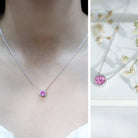 Add a soft, romantic glow to your look with this Lab Grown Pink Sapphire Necklace, designed to bring everyday elegance to life. Handcrafted in white gold plated silver, this Solitaire Necklace features a vibrant 7.5 MM round brilliant cut lab grown pink sapphire, securely set in bezel setting. The bezel surrounds the stone entirely, offering a clean, smooth silhouette that is both modern and timeless. Suspended from a durable and refined cable chain, this Pink Stone Necklace moves with grace, catching the light with every step. The blush pink hue of the AAAA quality lab grown pink sapphire exudes femininity and charm, making it perfect for dressing up your office attire or adding a polished touch to your casual look. What makes this Solitaire Sapphire Necklace truly special is its subtle sophistication, it draws the eye without overwhelming, making it a go-to piece for daily wear or thoughtful gifting. The Bezel Set Necklace comes complete with a certificate of authenticity for the gemstone and is elegantly packaged in a premium signature jewelry box, ready to be gifted or treasured.